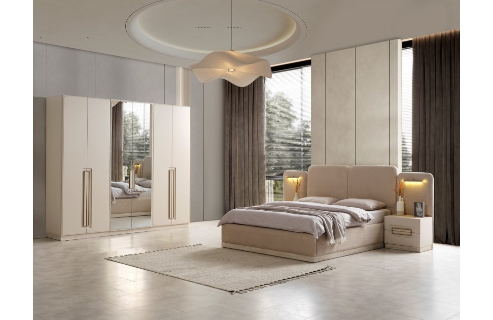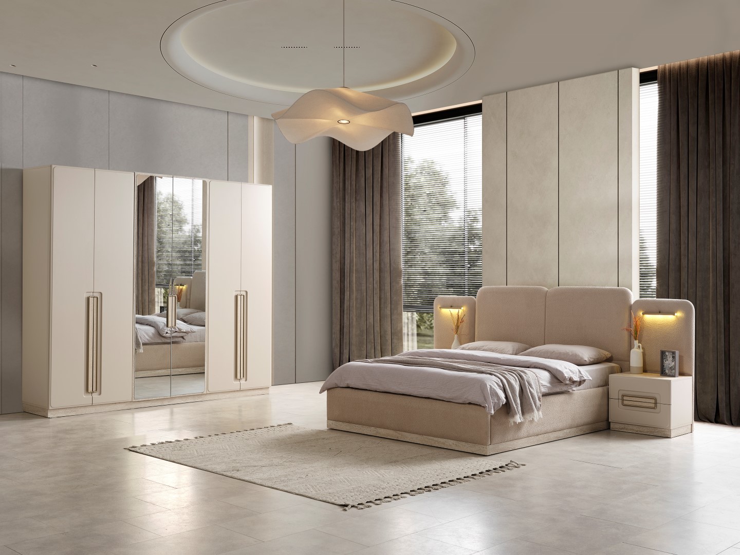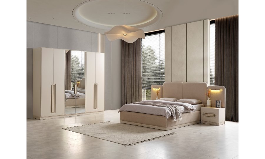 1ad.6 kapaklı dolap(4 boyalı+2 aynalı), 1ad.karyola , 2ad. komodin , 2 ad. komodin panosu , 1 ad.şifonyer , 1ad. aynadan oluşamaktadır. Bazalı takım ve tekil parçalar opsiyonel olarak satışa sunulmuştur.