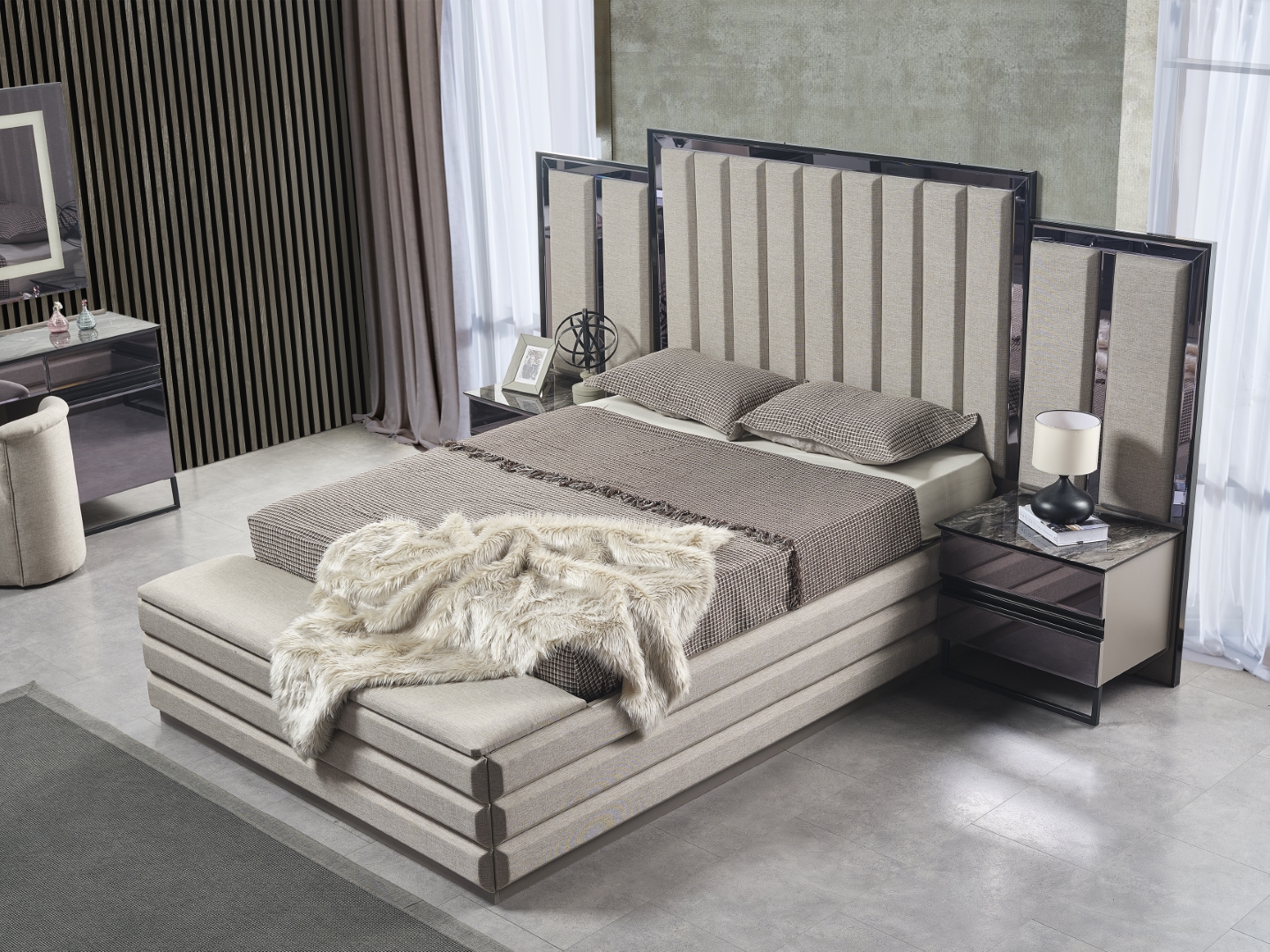 1ad. iki kapaklı çekmeceli dolap, 1ad. iki kapaklı raflı dolap, 1ad. iki kapaklı pantolonluklu dolap, 1ad. ara 30cm açık raf, 1ad. benchli bazalı karyola, 1ad. şifonyer ve ayna, 2ad. komodin, 2ad. komodin panosundan oluşmaktadır. Puf, 40cm açık raf, döner köşe modül, 2 kapaklı dolap, köşe modül ve 8 çekmeceli ada şifonyer opsiyonel olarak satışa sunulmuştur.