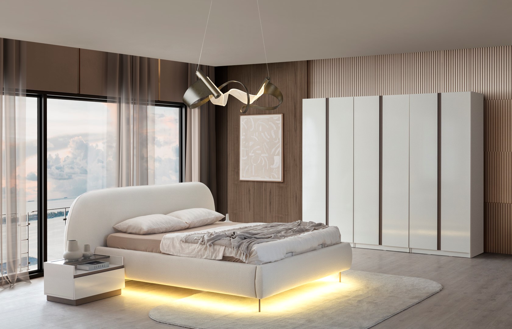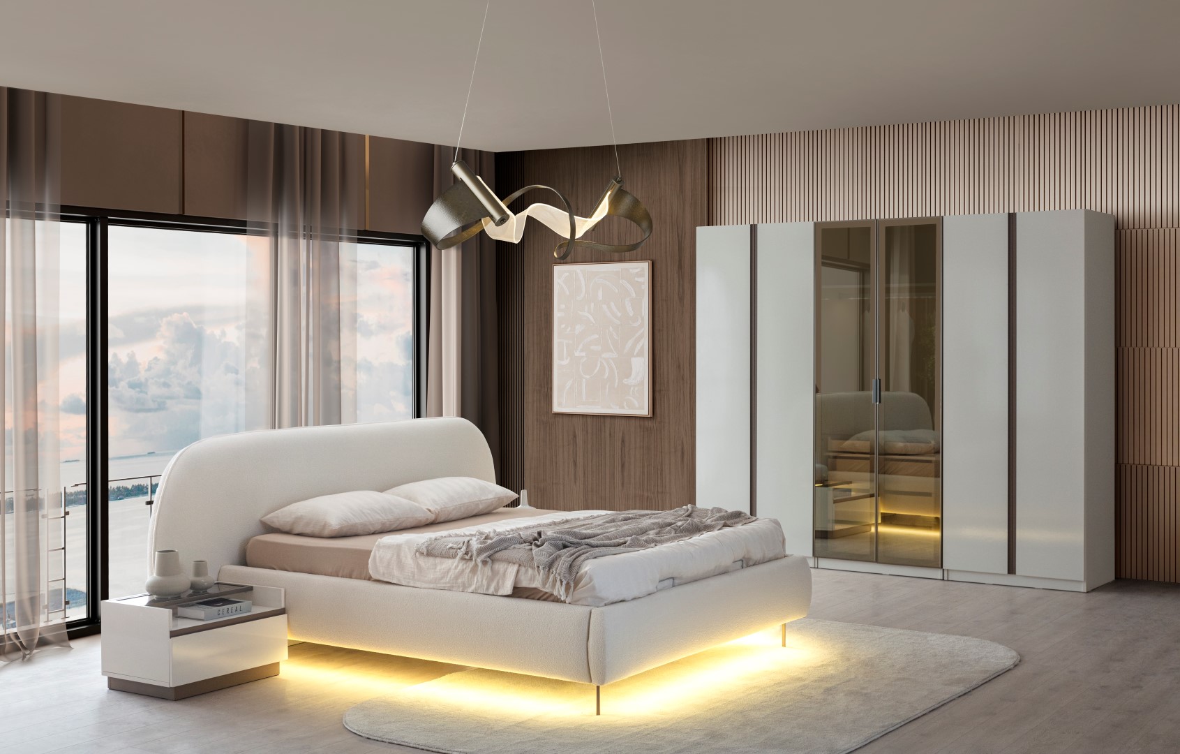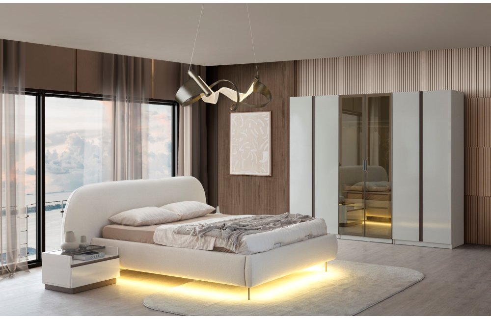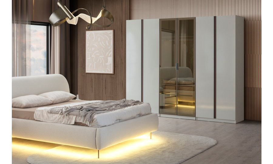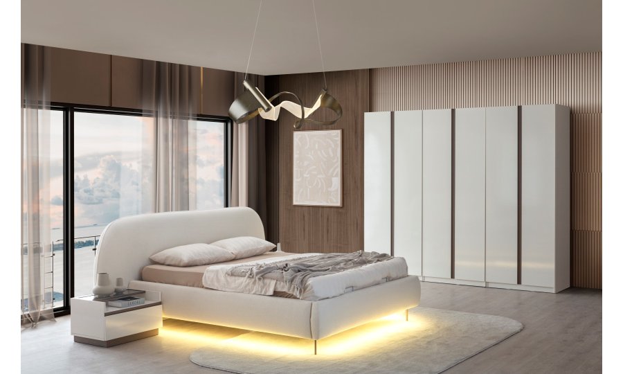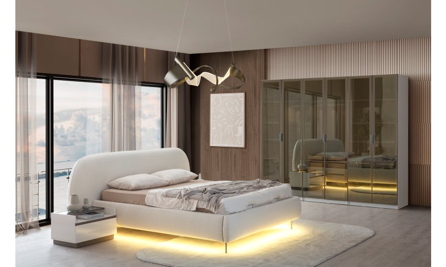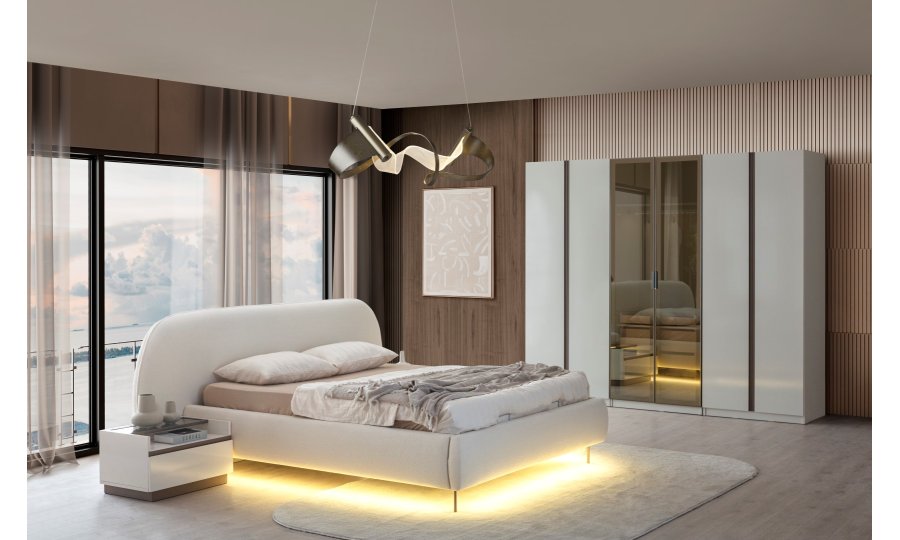 Dolap(2li Çekmeceli Modül, 2li Pantolonluklu Modül, 2li Raflı-Pantolonluklu Modül), bellat Karyola, 2 ad. komodin, şifonyer ve aynasından oluşmaktadır. Baza sistemi, çamaşırlık, ada şifonyer, puf opsiyonel satılmaktadır.