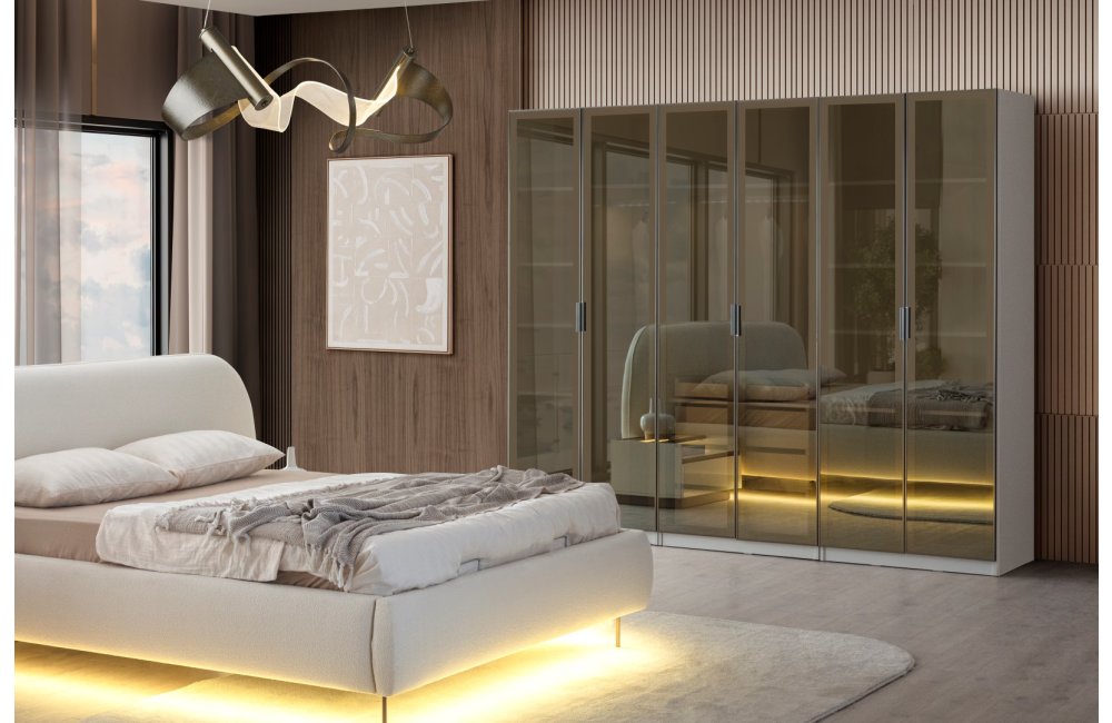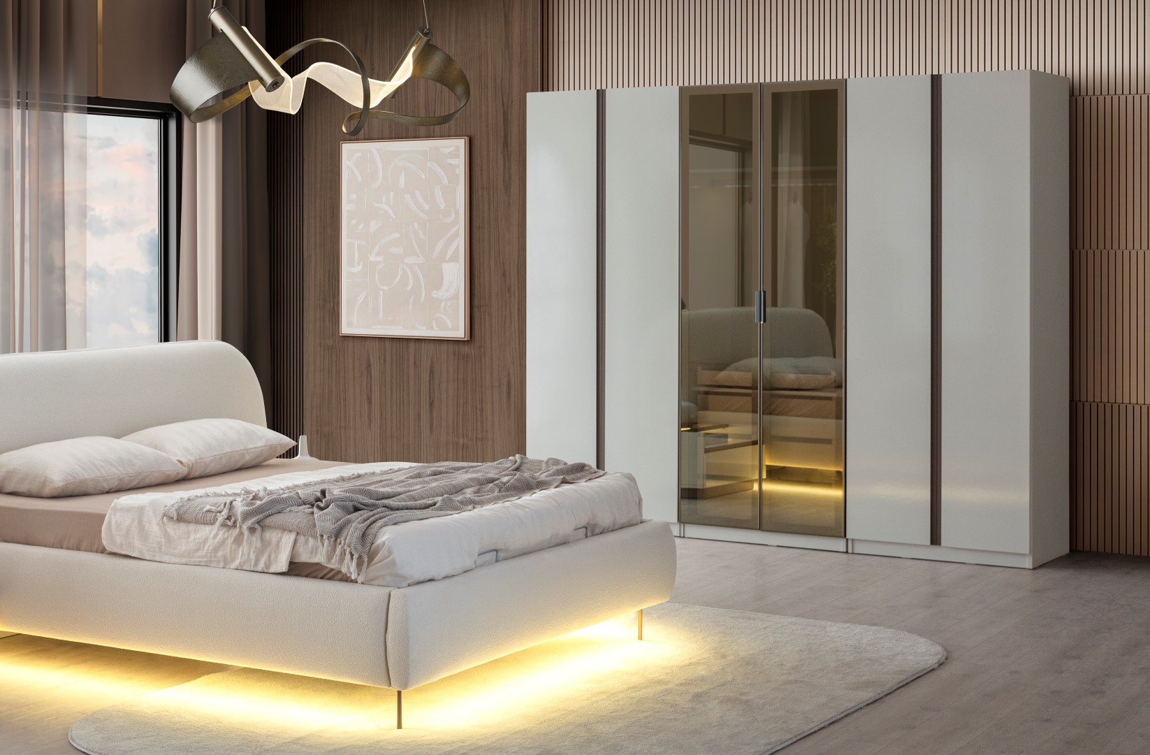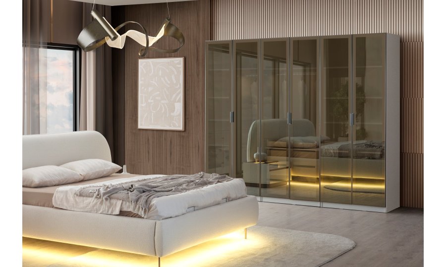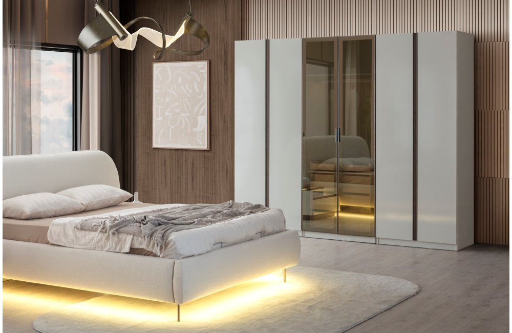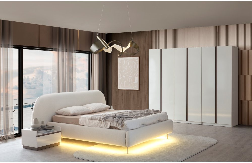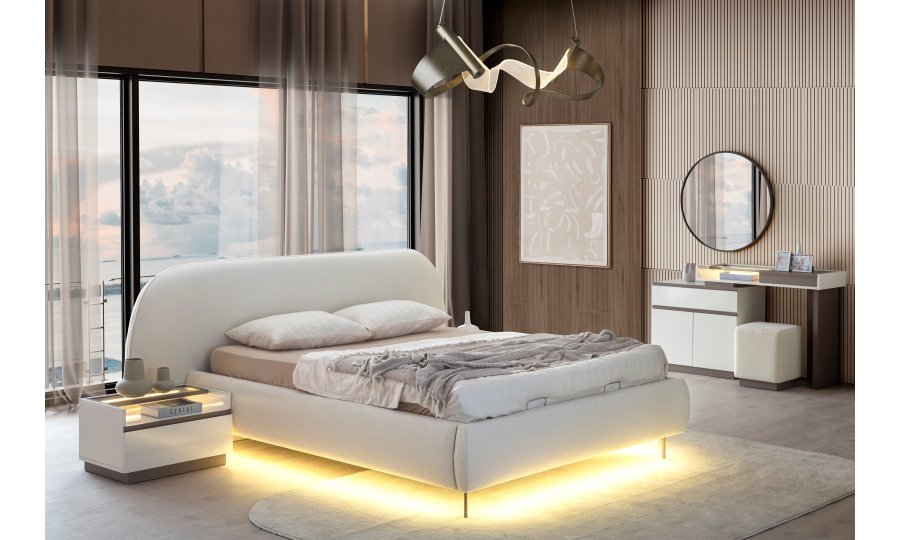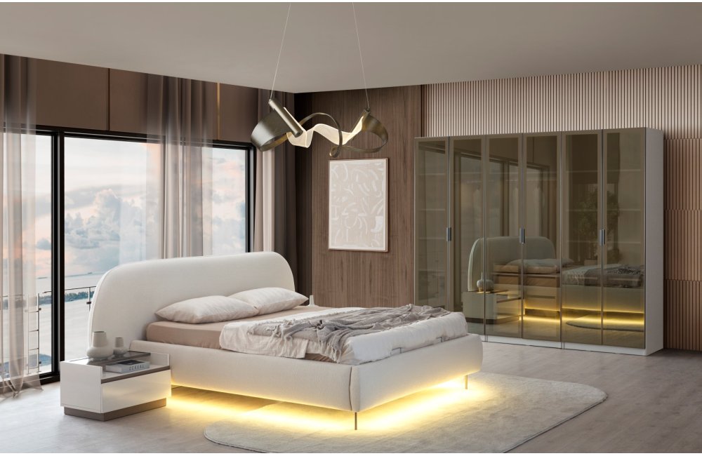 Dolap(2li Çekmeceli Modül, 2li Pantolonluklu Modül, 2li Raflı-Pantolonluklu Modül), bellat Karyola, 2 ad. komodin, şifonyer ve aynasından oluşmaktadır. Baza sistemi, çamaşırlık, ada şifonyer, puf opsiyonel satılmaktadır.