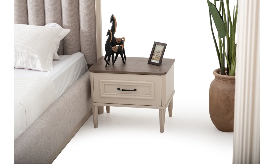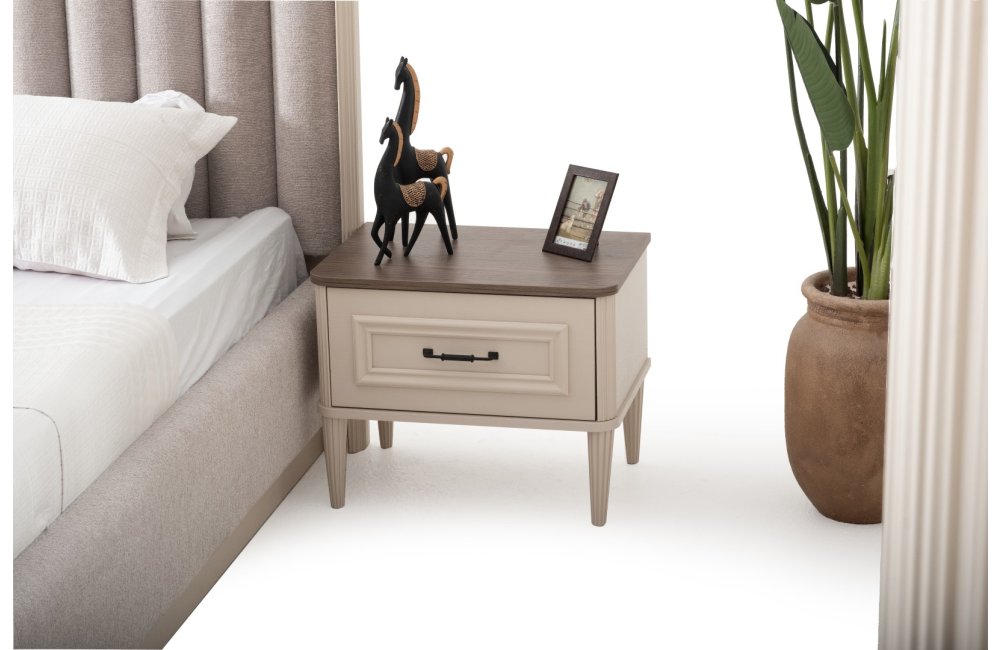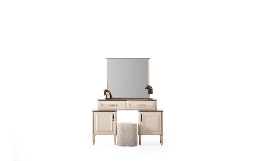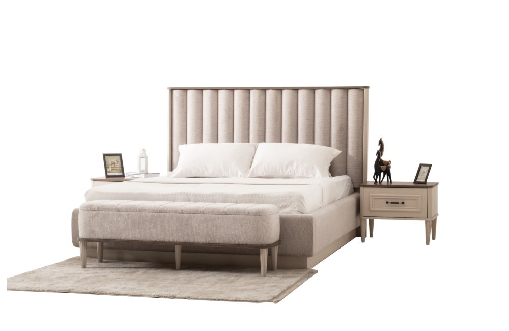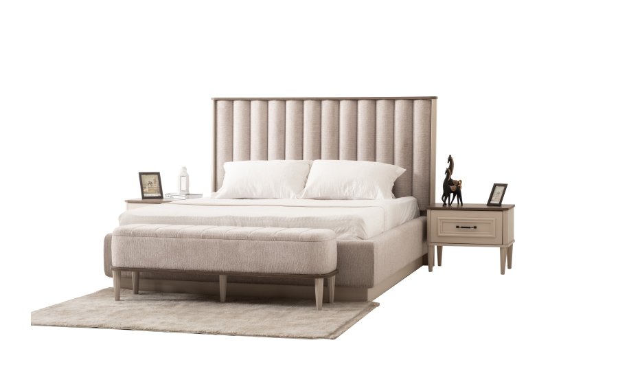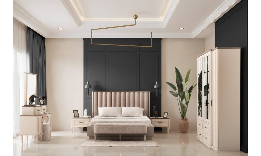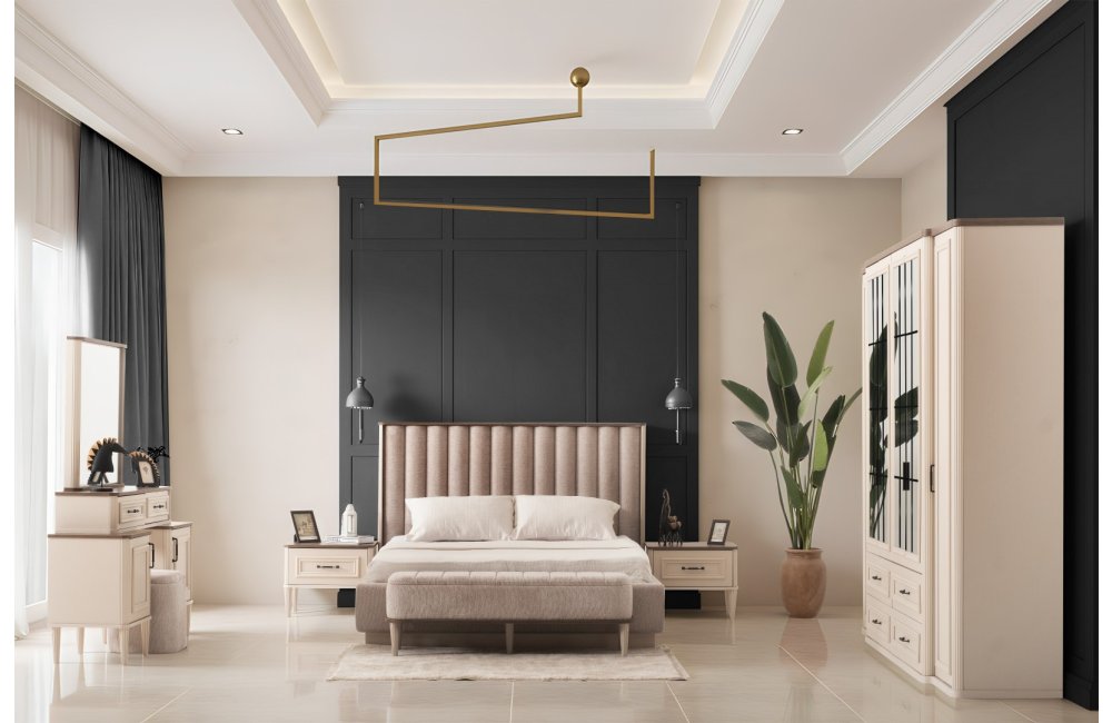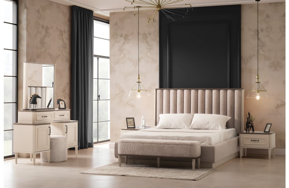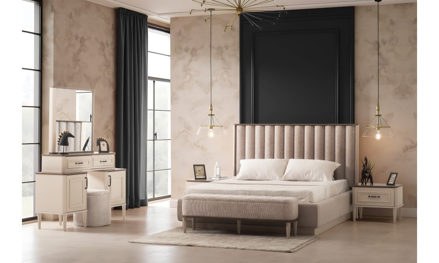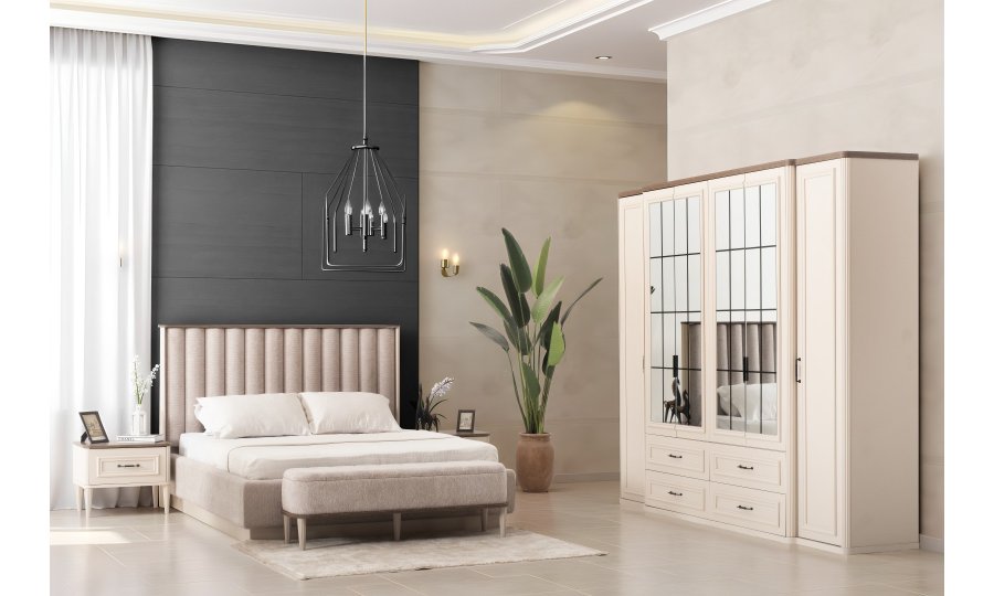 1 ad. dolap, 1 ad. aynalı şifonyer, 2 ad. komodin ve 1 ad. bazalı karyoladan oluşmaktadır. Bench ve puf opsiyonel olarak satılmaktadır.