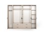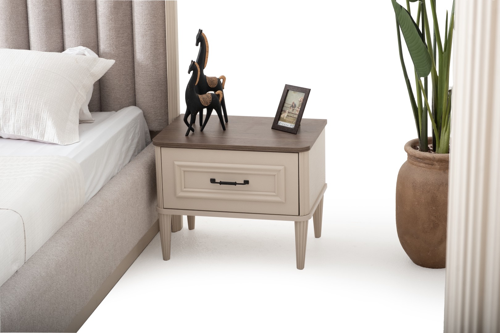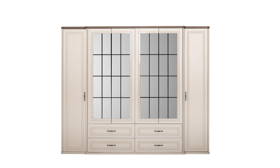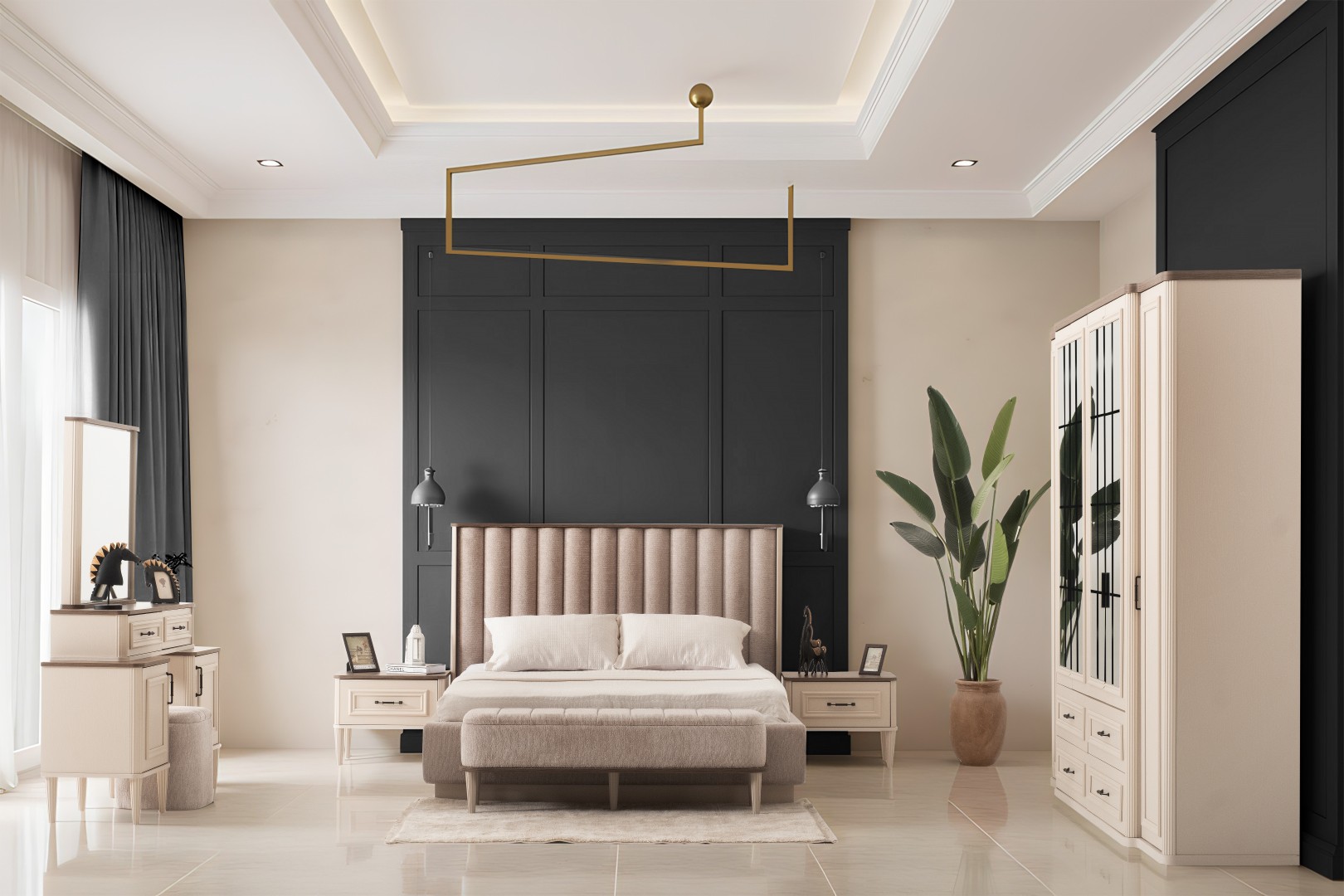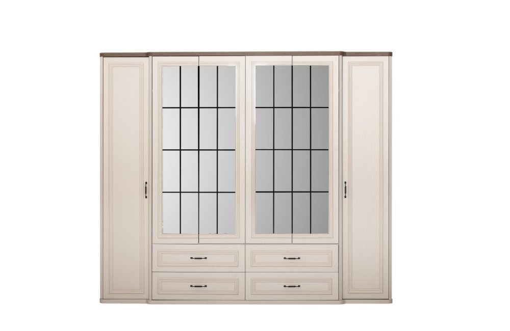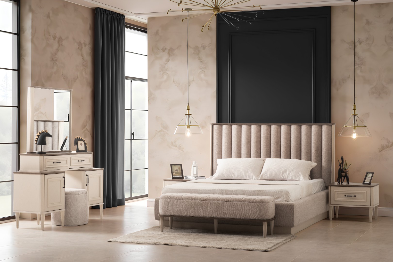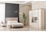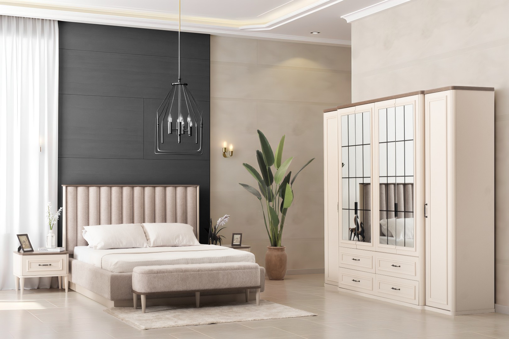 1 ad. dolap, 1 ad. aynalı şifonyer, 2 ad. komodin ve 1 ad. bazalı karyoladan oluşmaktadır. Bench ve puf opsiyonel olarak satılmaktadır.