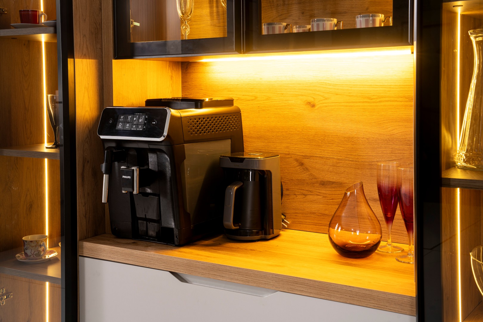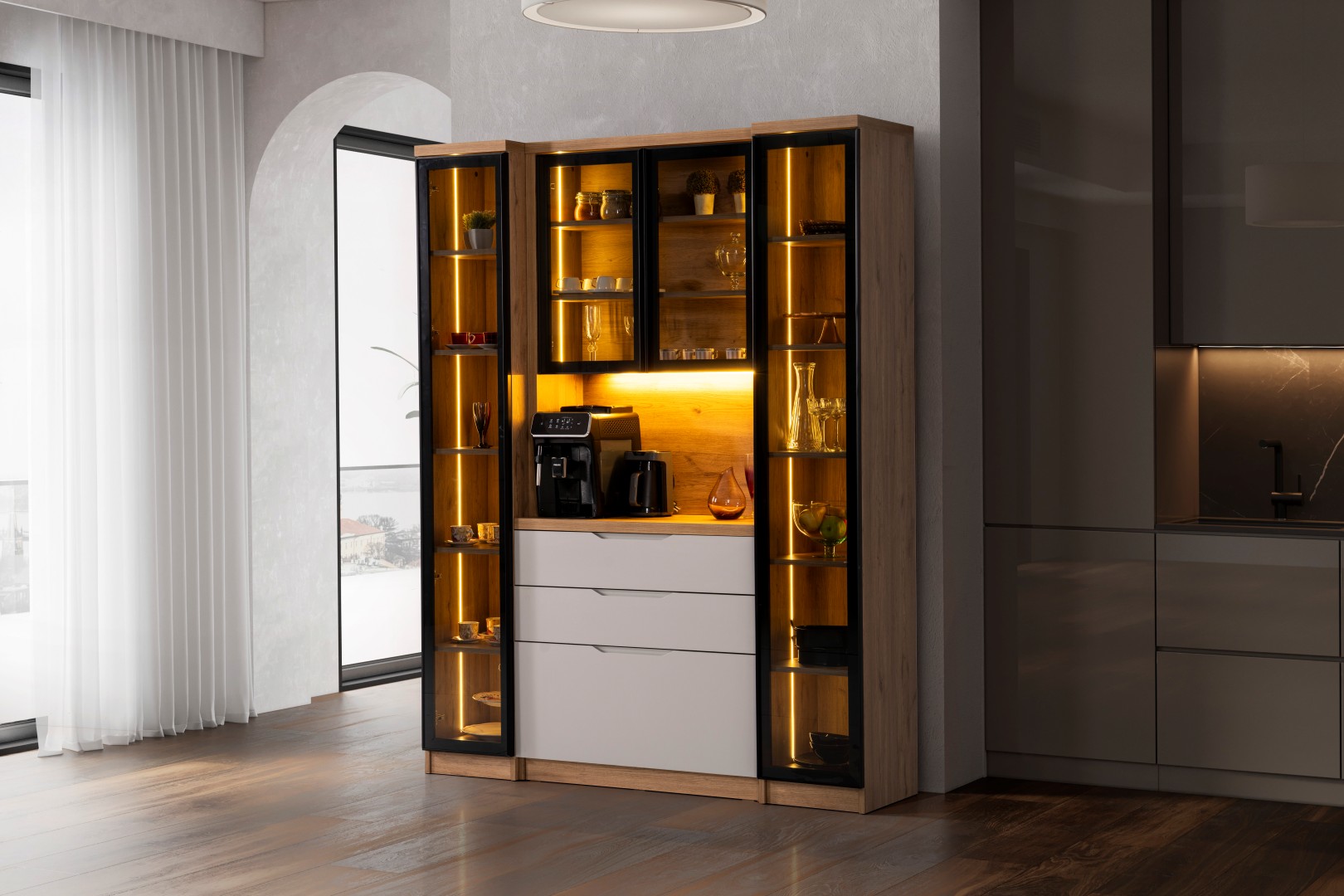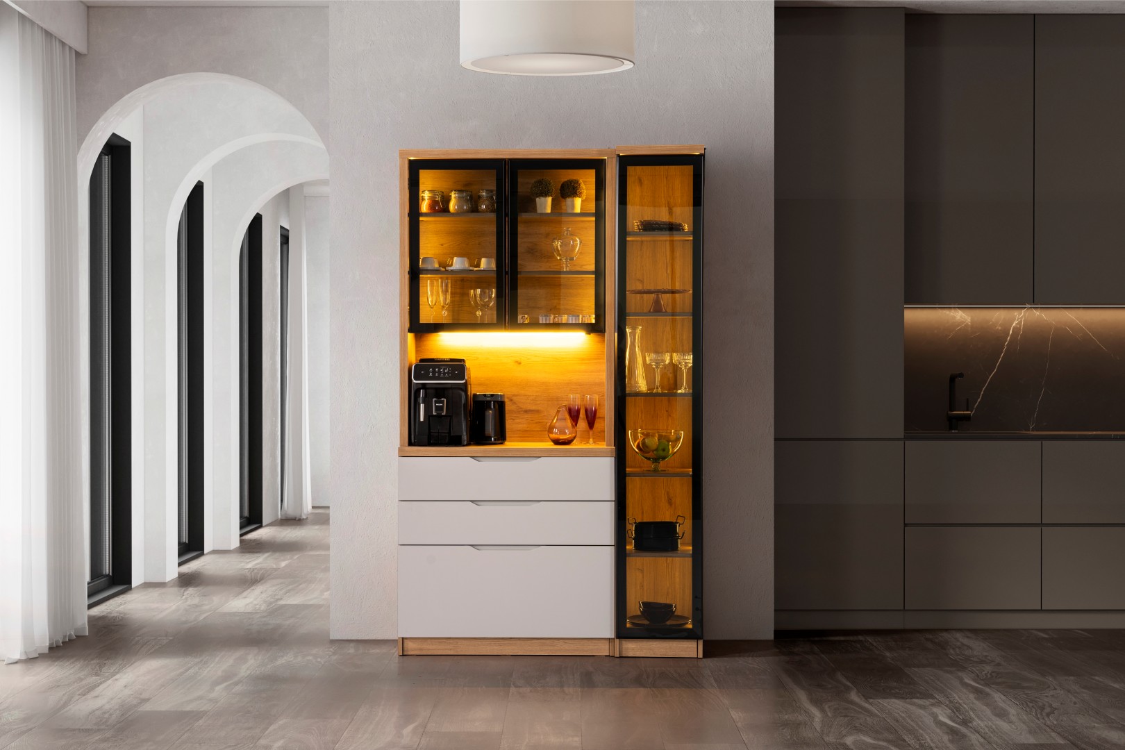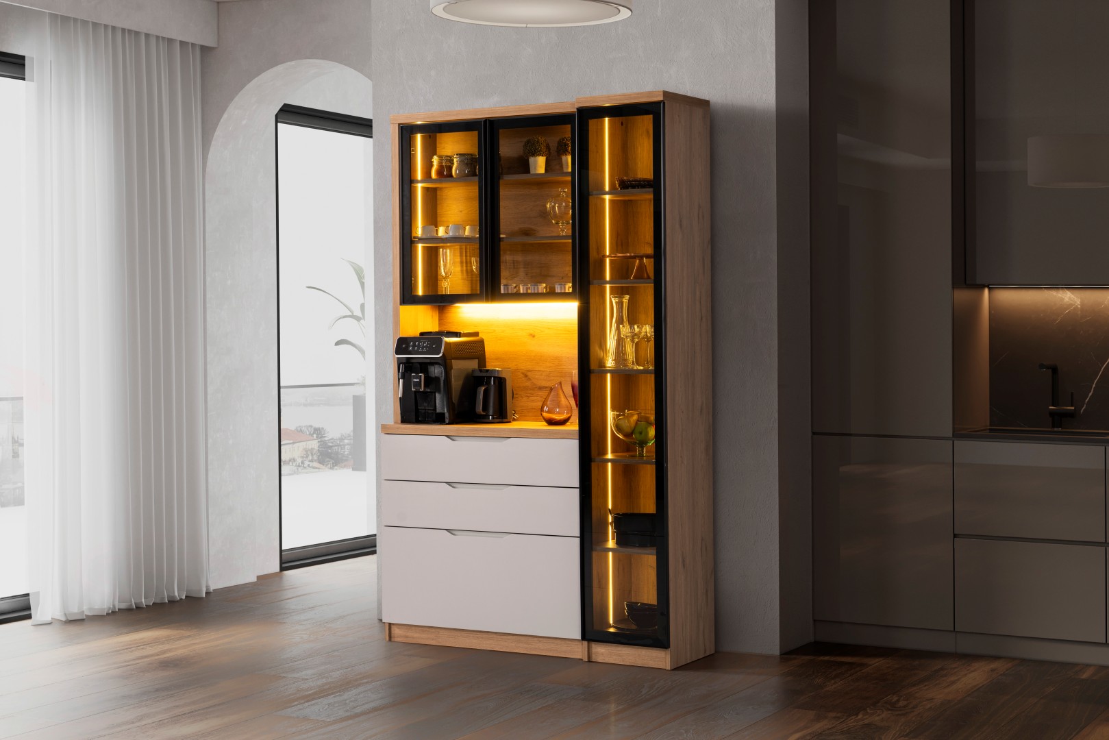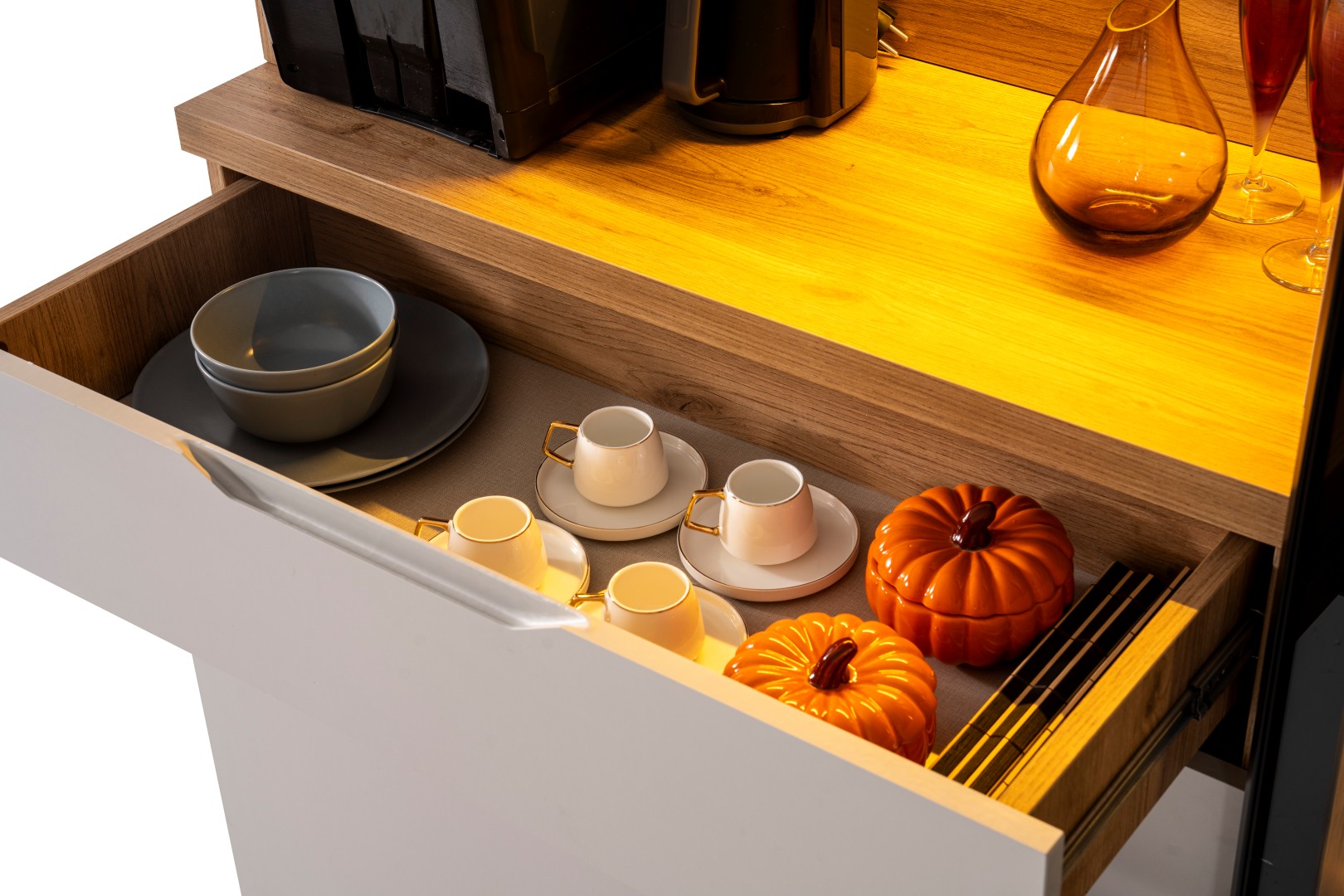• Kompakt ve Modüler Yapı: Hem mutfakta hem de salon geçişlerinde "Coffee Station" (Kahve İstasyonu) olarak kullanılabilecek ideal ölçüler.
