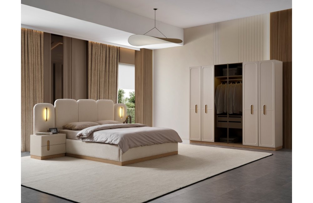 1ad.6 kapaklı dolap(4 boyalı+2 camlı), 1ad. karyola (içi boş) , 2ad. komodin , 2ad. komidin panosu, 1 ad.şifonyer ve 1ad. aynadan oluşmaktadır. Bazalı takım ve tekil parçalar opsiyonel olarak satışa sunulmuştur.