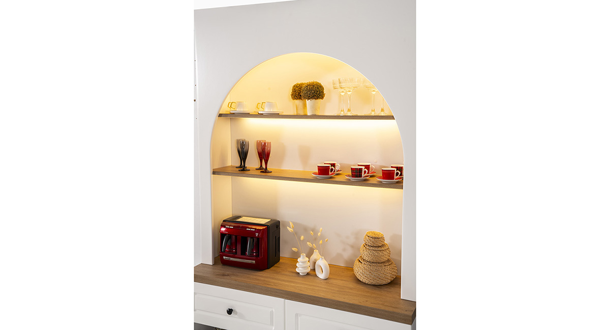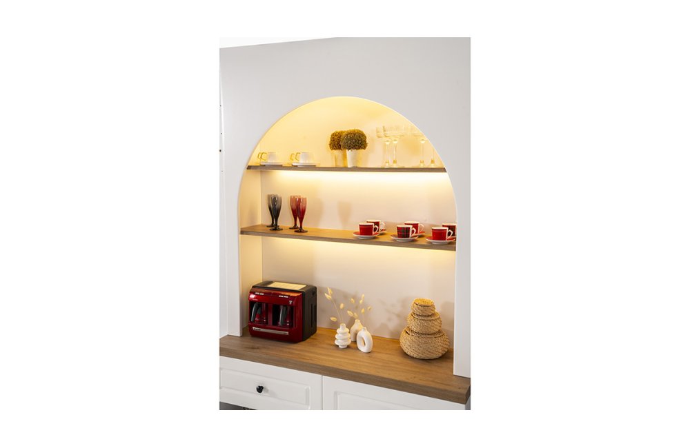 • Entegre Raf Aydınlatması: Rafların altına gizlenmiş LED şeritler, sergilenen ürünleri ön plana çıkarır ve mekana sıcak bir ambiyans katar.