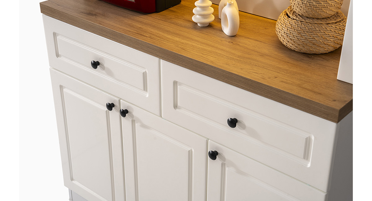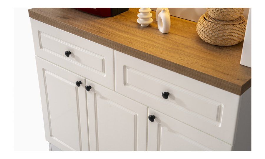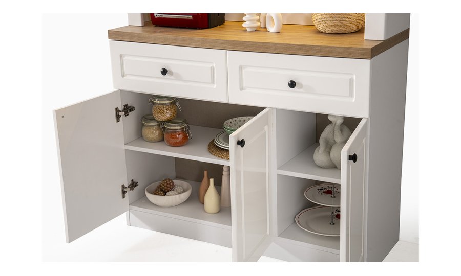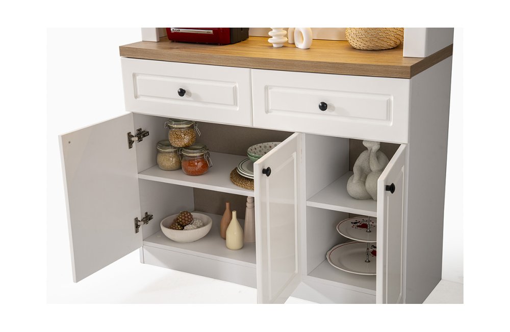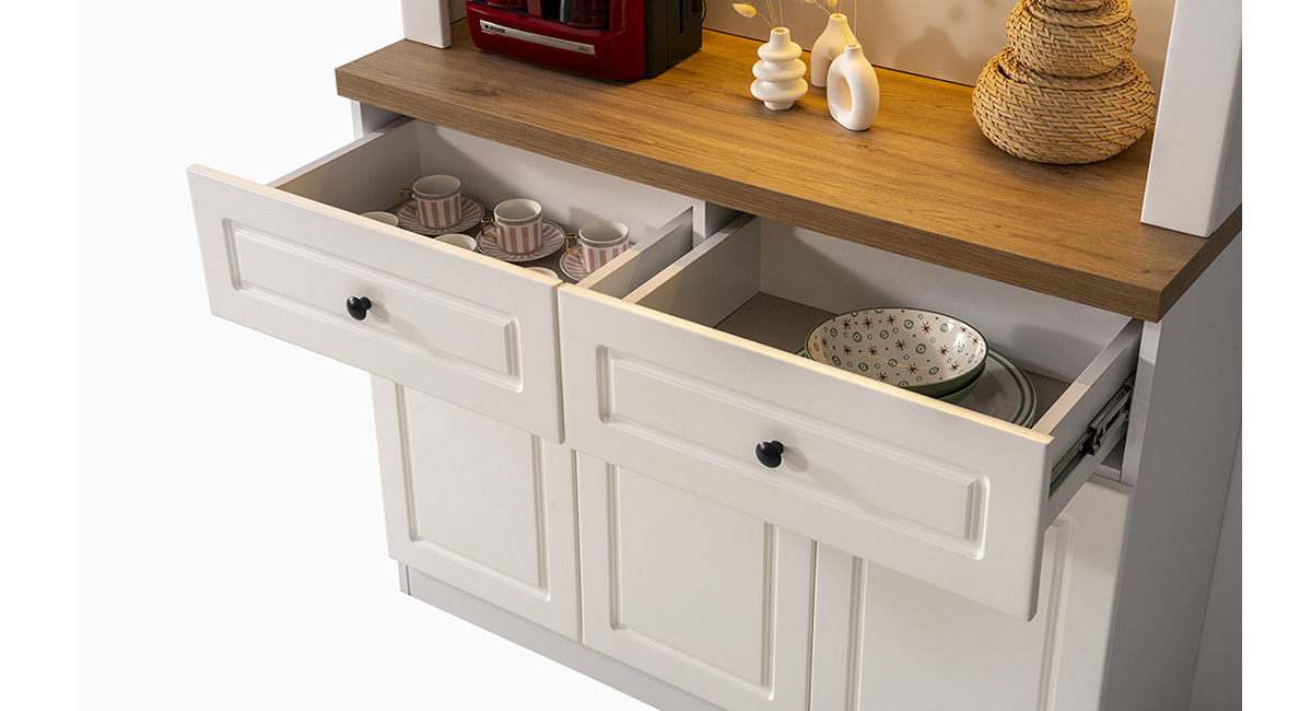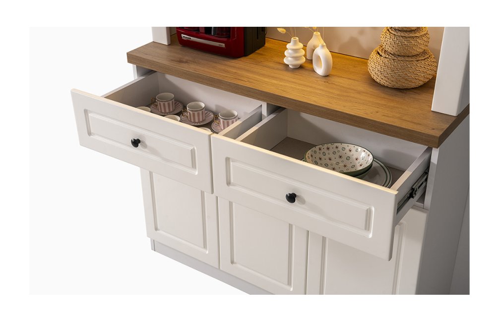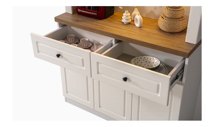 • Geniş Depolama Kapasitesi: İki adet çekmece ve üç kapaklı alt dolap ünitesi ile kahve çekirdeklerinden mutfak gereçlerine kadar her şey için düzenli bir alan sağlar.