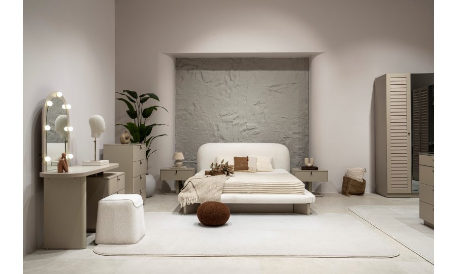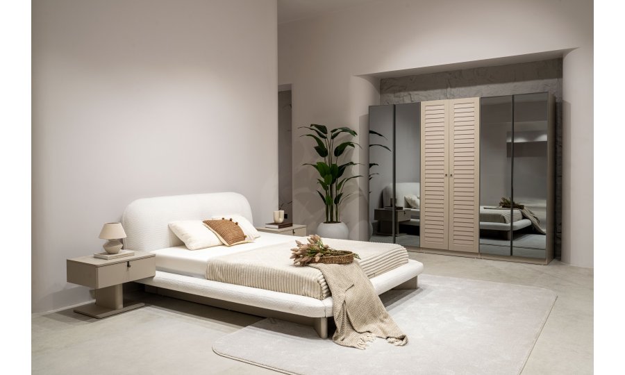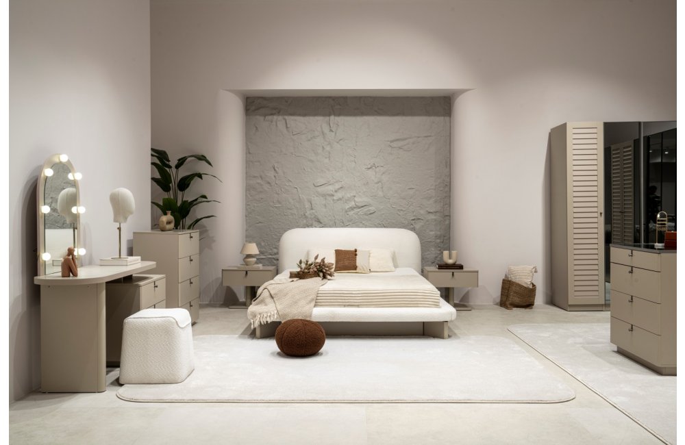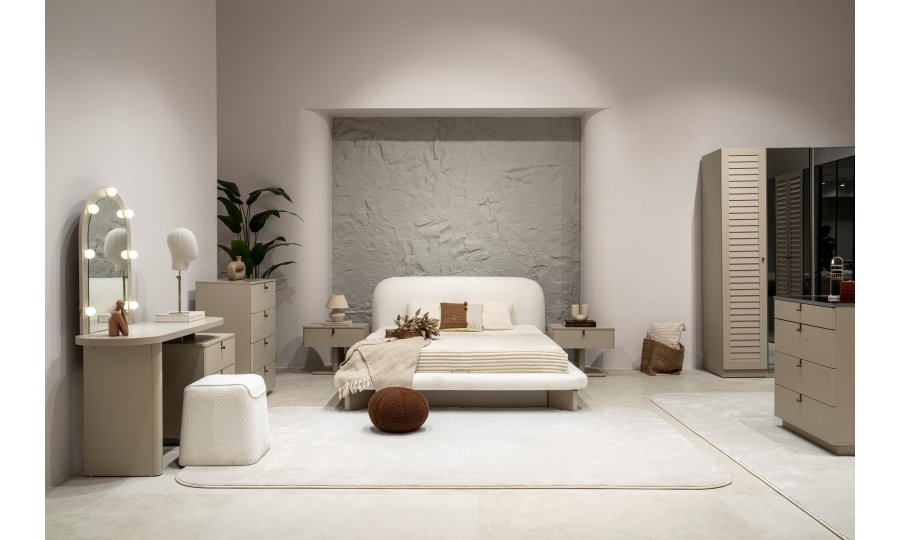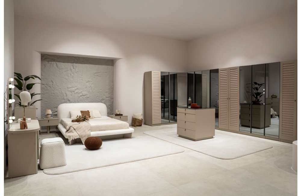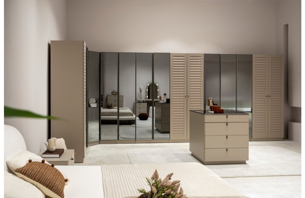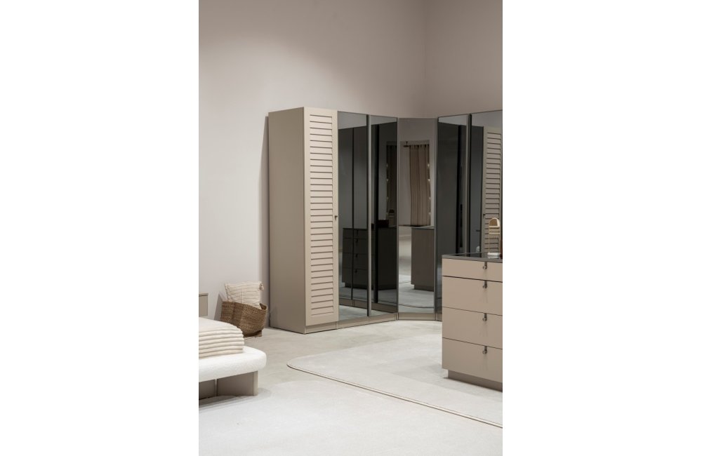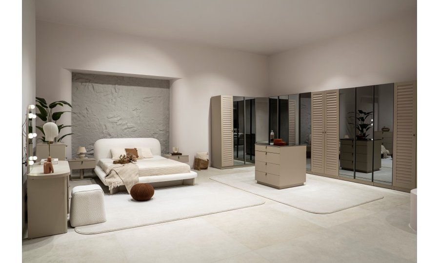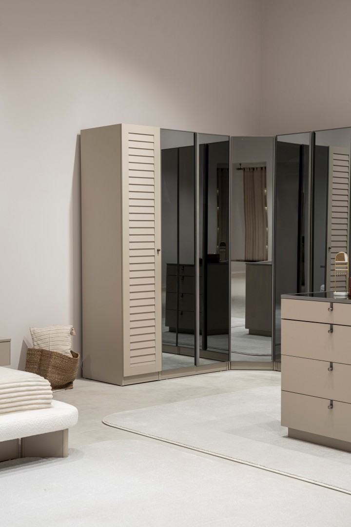 2 ad. tek kapaklı, 2 ad. iki kapaklı çekmeceli, 2 ad. iki kapaklı raflı, 2 ad. iki kapaklı askılıklı, 1 ad. köşe dolap, 1 ad. bazalı karyola (160x200 cm), 1 ad şifonyer, 1 ad şifonyer aynası ve 2 ad. komodinden oluşmaktadır.