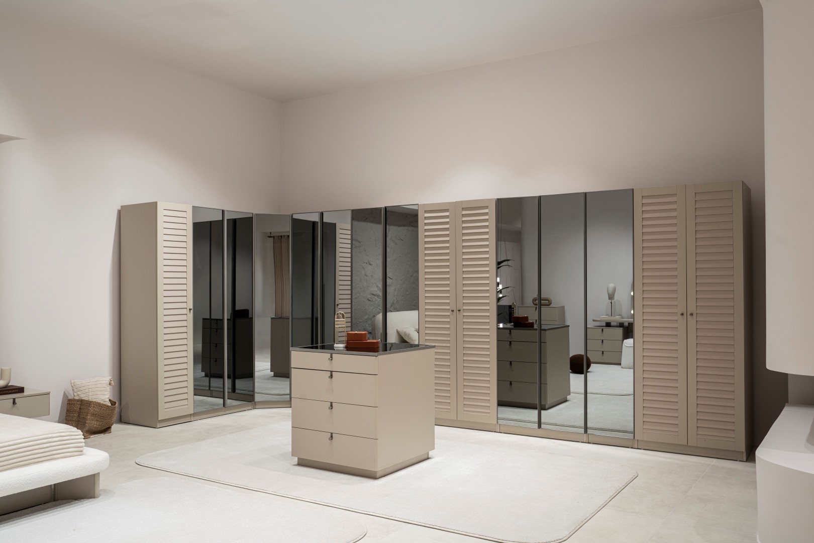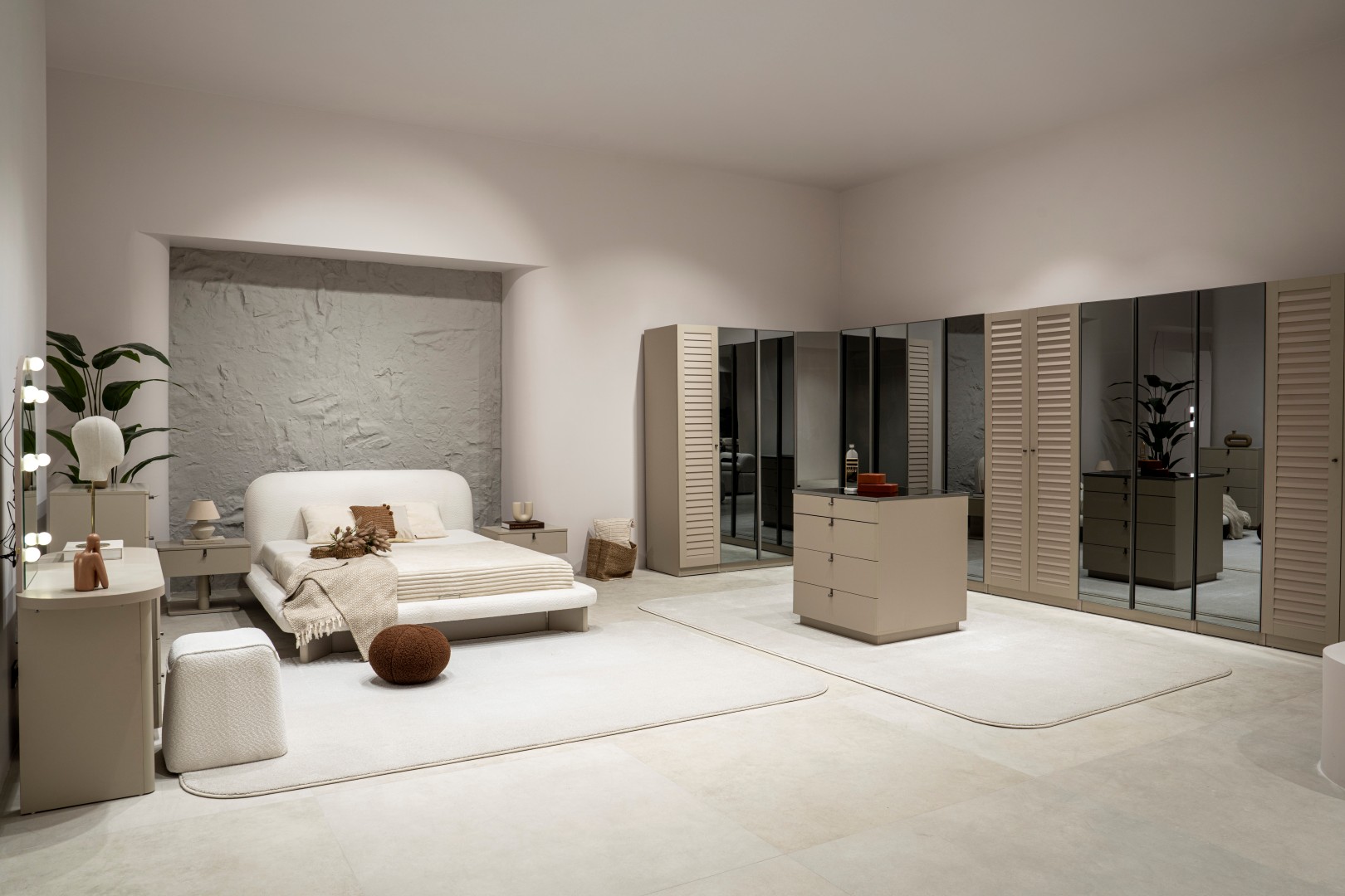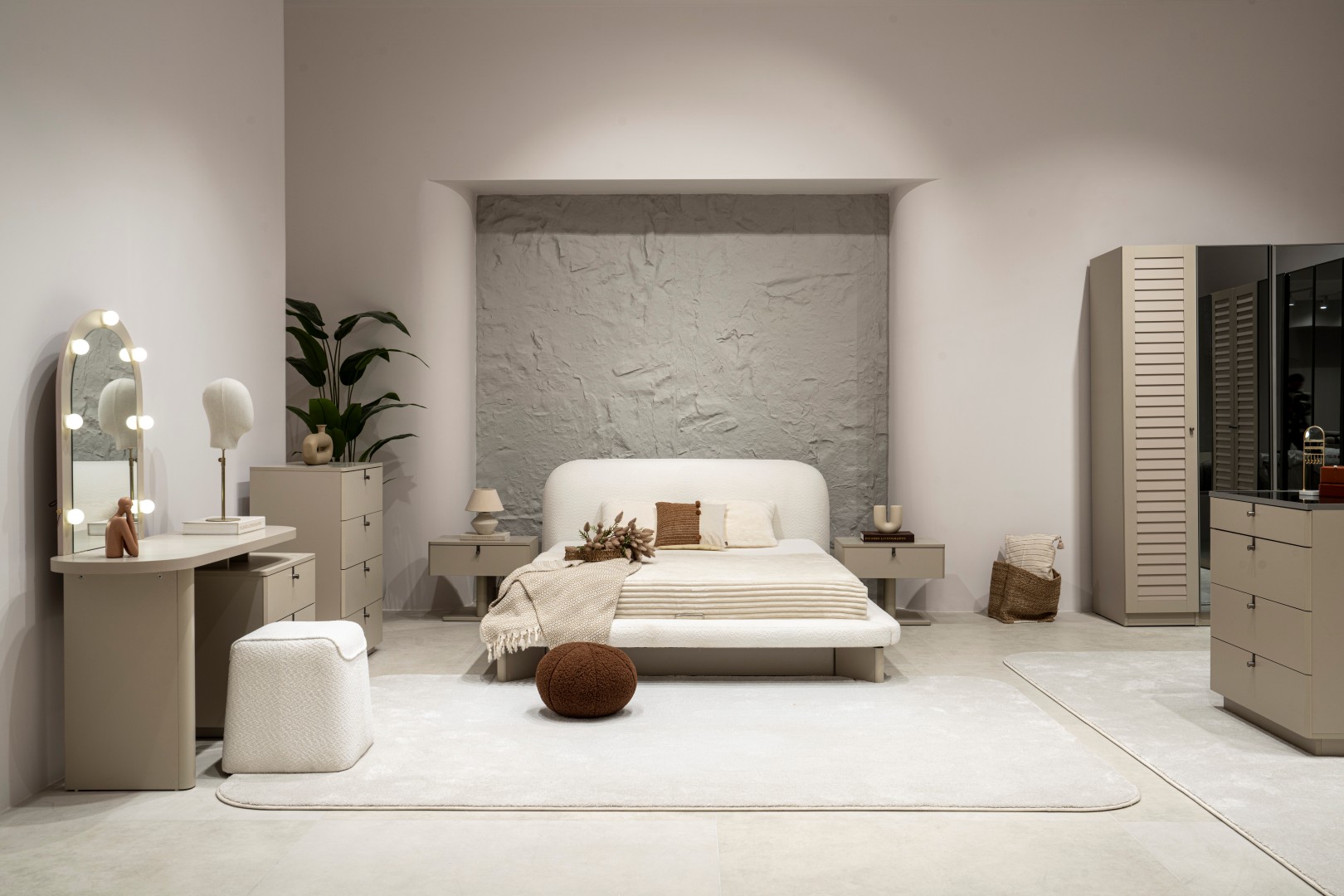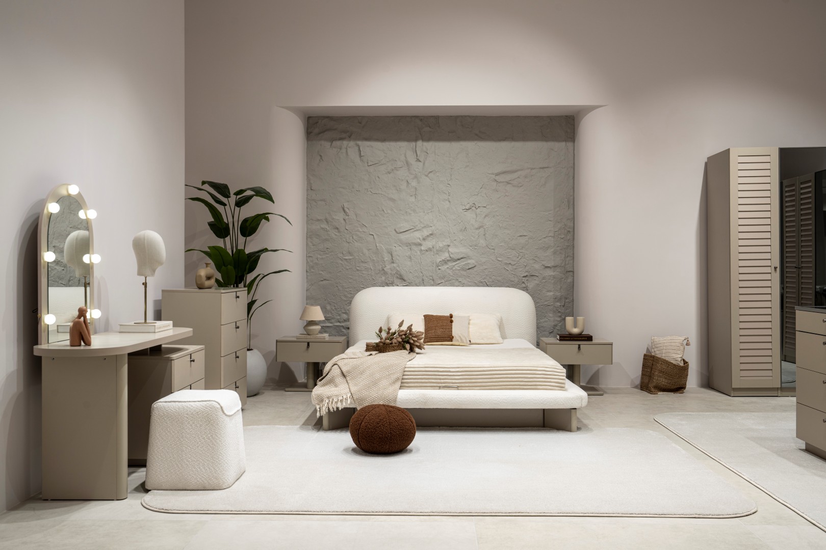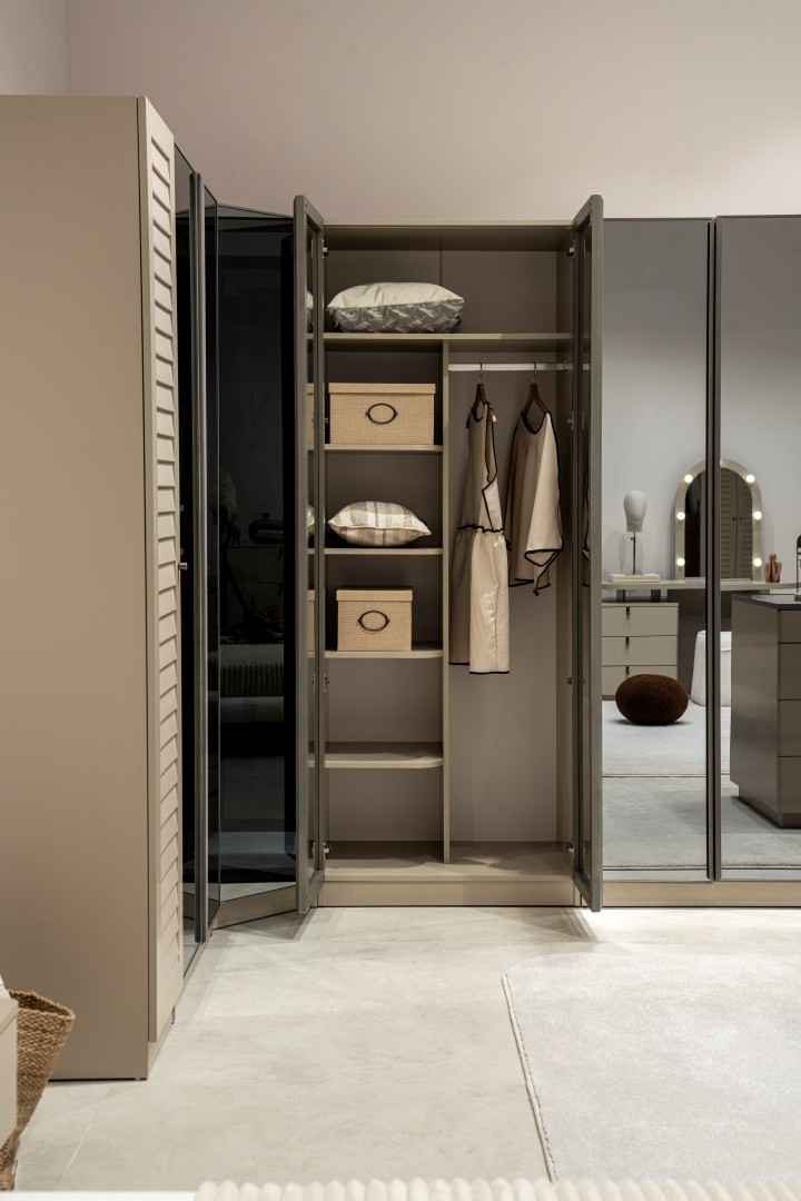 2 ad. tek kapaklı, 2 ad. iki kapaklı çekmeceli, 2 ad. iki kapaklı raflı, 2 ad. iki kapaklı askılıklı, 1 ad. köşe dolap, 1 ad. bazalı karyola (160x200 cm), 1 ad şifonyer, 1 ad şifonyer aynası ve 2 ad. komodinden oluşmaktadır.