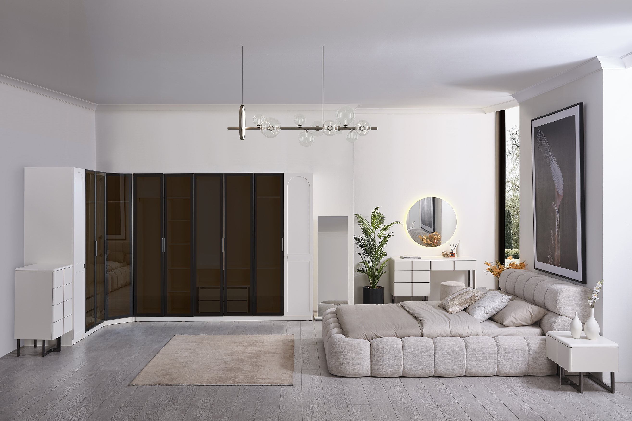 1ad. altı kapaklı dolap, 1ad. köşe modül, 1ad. iki kapaklı çekmeceli modül , 1ad. tek kapaklı modül, 1ad. şifonyer, 1ad. şifonyer aynası, 1ad. bazalı karyola ve 2ad. komodinden oluşmaktadır. 180lik karyola, çamaşırlık, boy aynası, puf opsiyonel satılmaktadır.