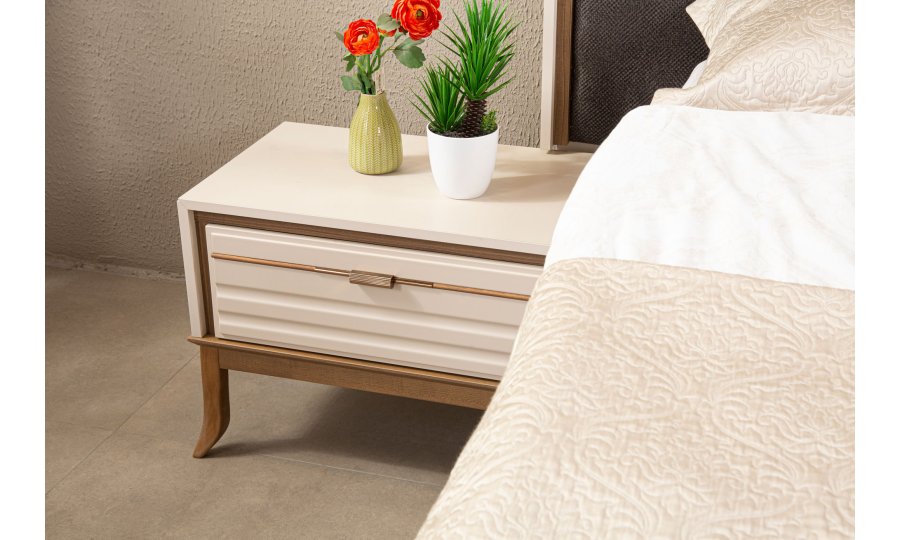 1ad. dolap, 1ad. karyola, 1ad. şifonyer, 2ad. komodinden oluşmaktadır. Baza sistemi ve puf opsiyonel olarak satışa sunulmuştur.