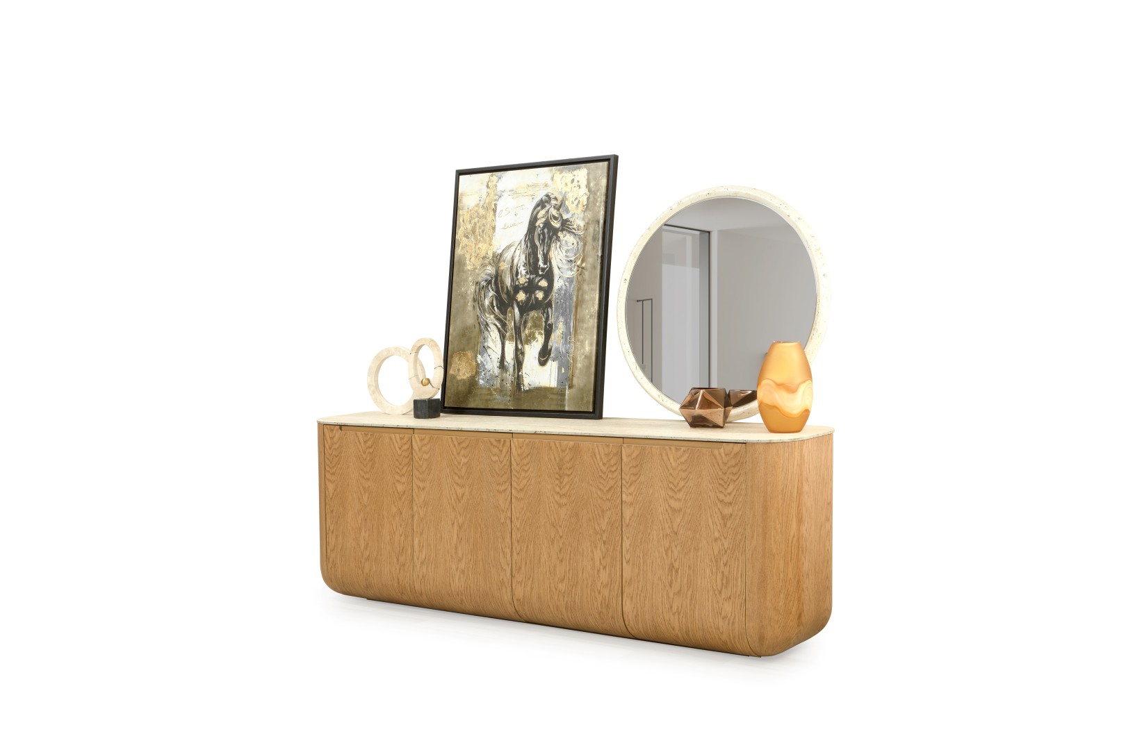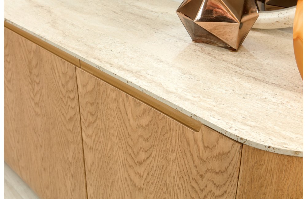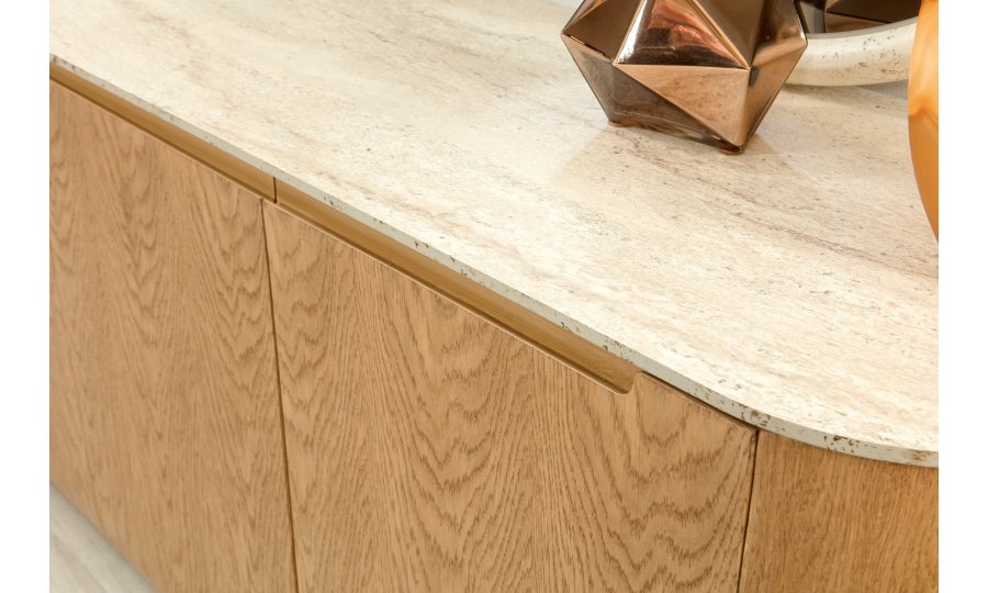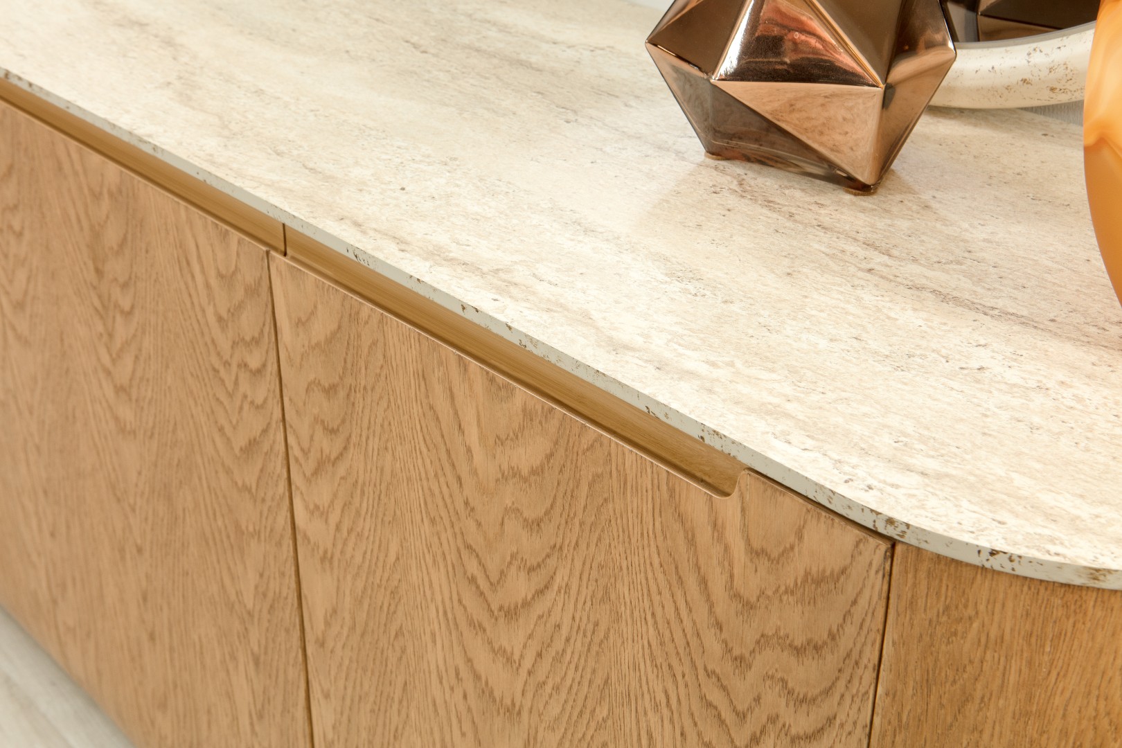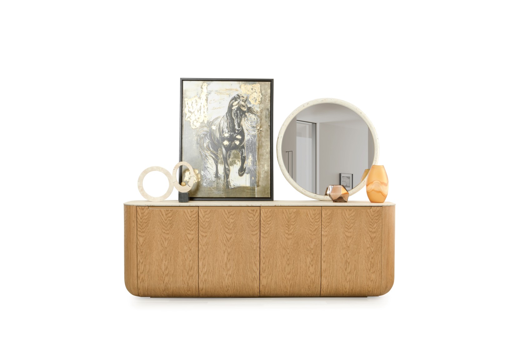 • Doğal Ahşap İşçiliği: Konsol ve masa gövdesinde kullanılan yüksek kaliteli meşe kaplama, dikey formlu dokusuyla mekana derinlik katar.