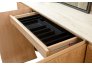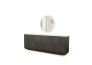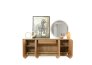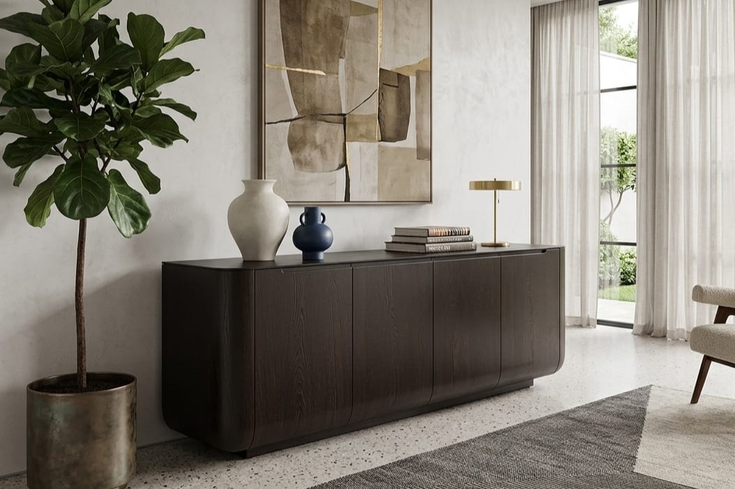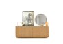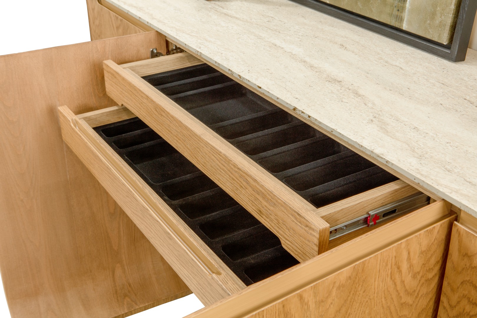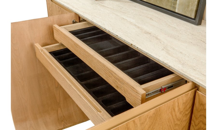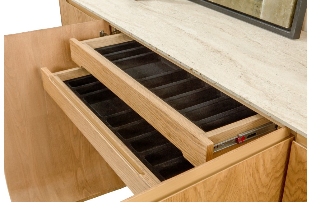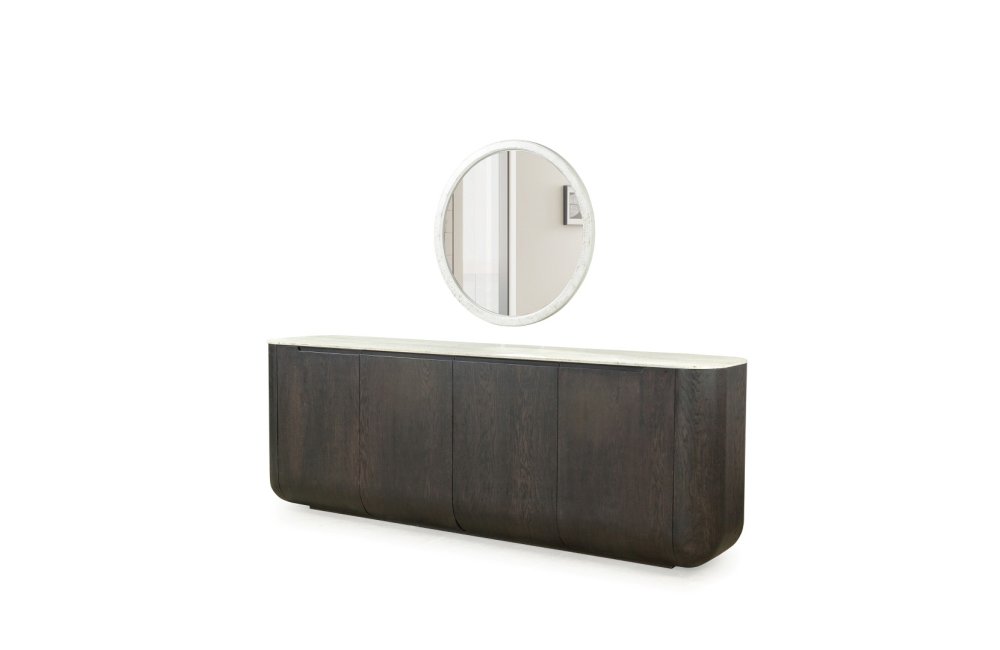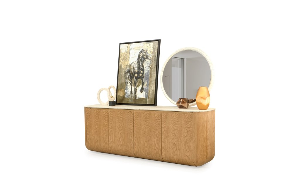 • Doğal Ahşap İşçiliği: Konsol ve masa gövdesinde kullanılan yüksek kaliteli meşe kaplama, dikey formlu dokusuyla mekana derinlik katar.
