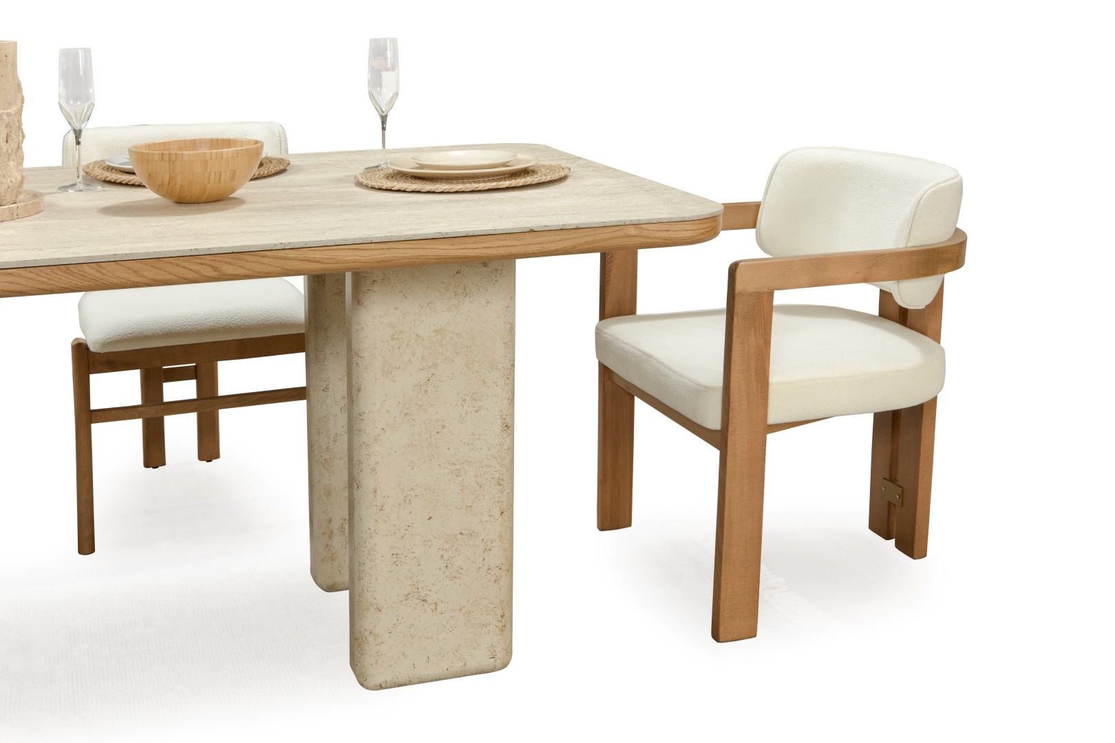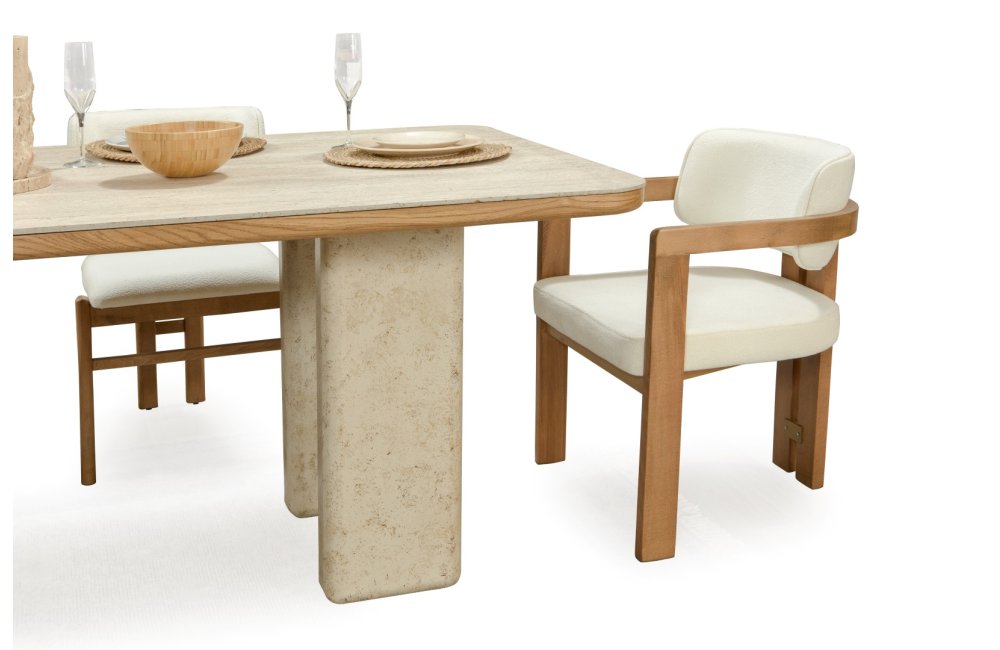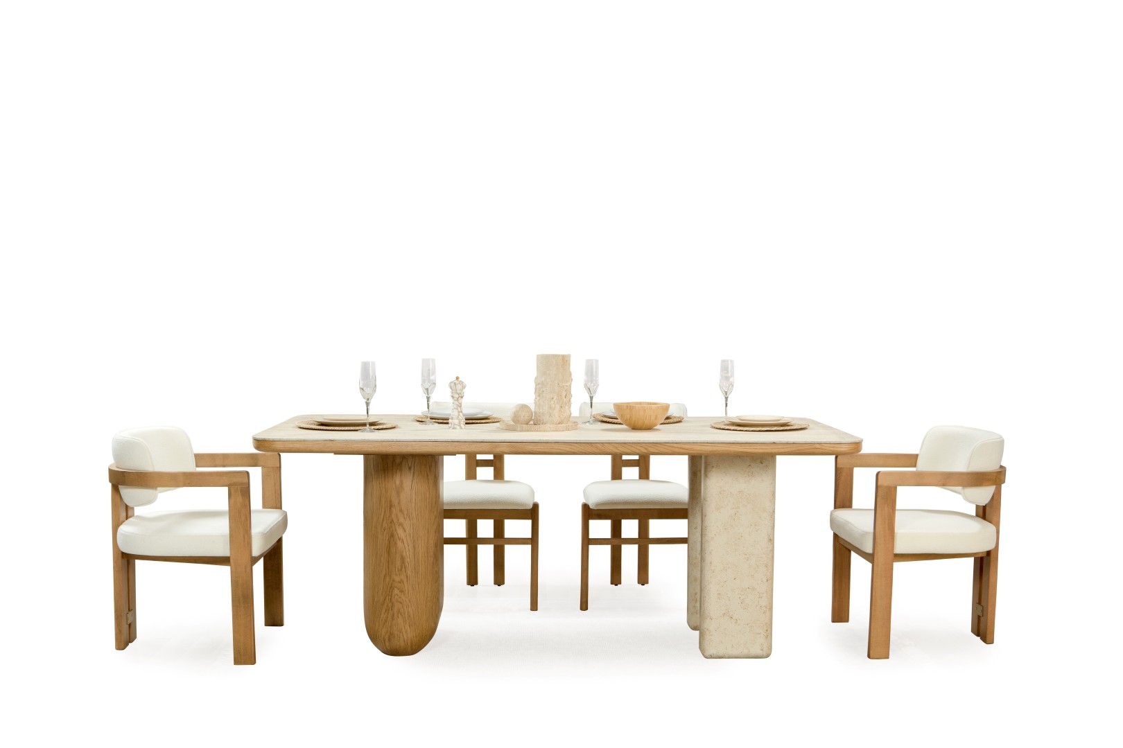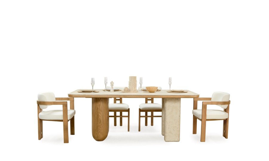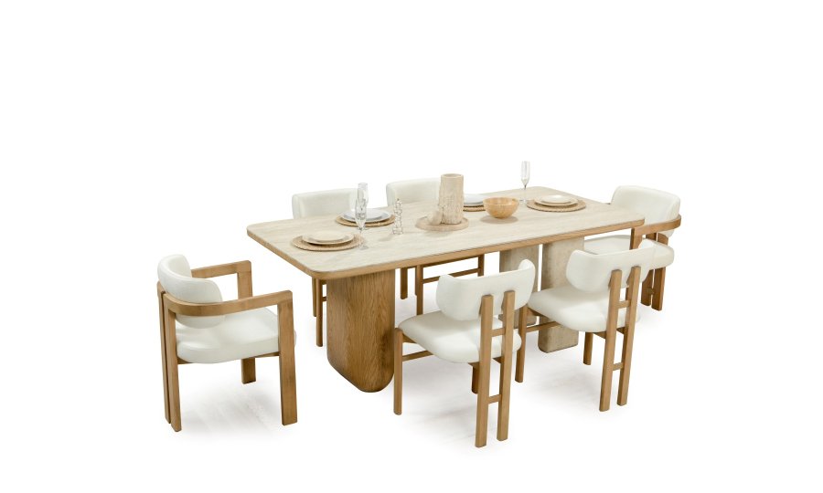• Traverten Detaylar: Yemek masasının ayaklarında kullanılan traverten dokulu bloklar, doğal taş estetiğini modern mühendislikle birleştirir.