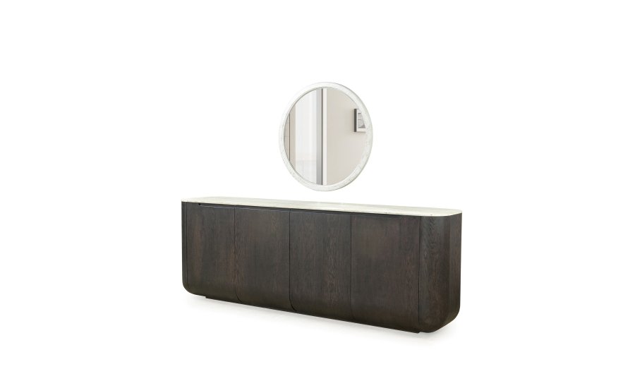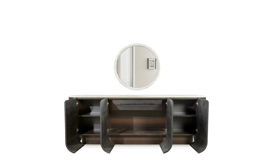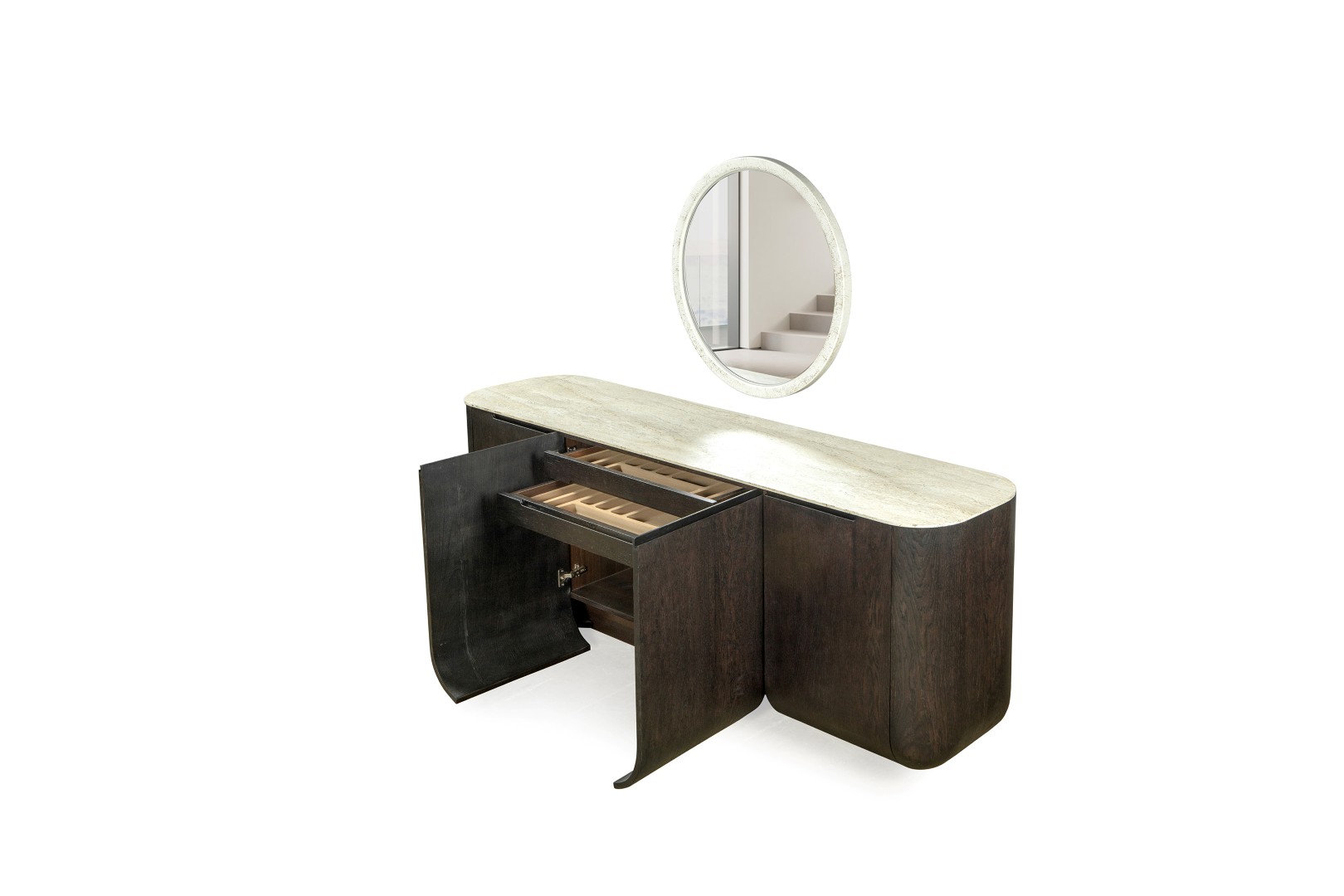 • Oval ve Yumuşak Formlar: Konsolun ve masanın keskin köşelerden arındırılmış oval yapısı, akışkan bir tasarım dili sergiler.