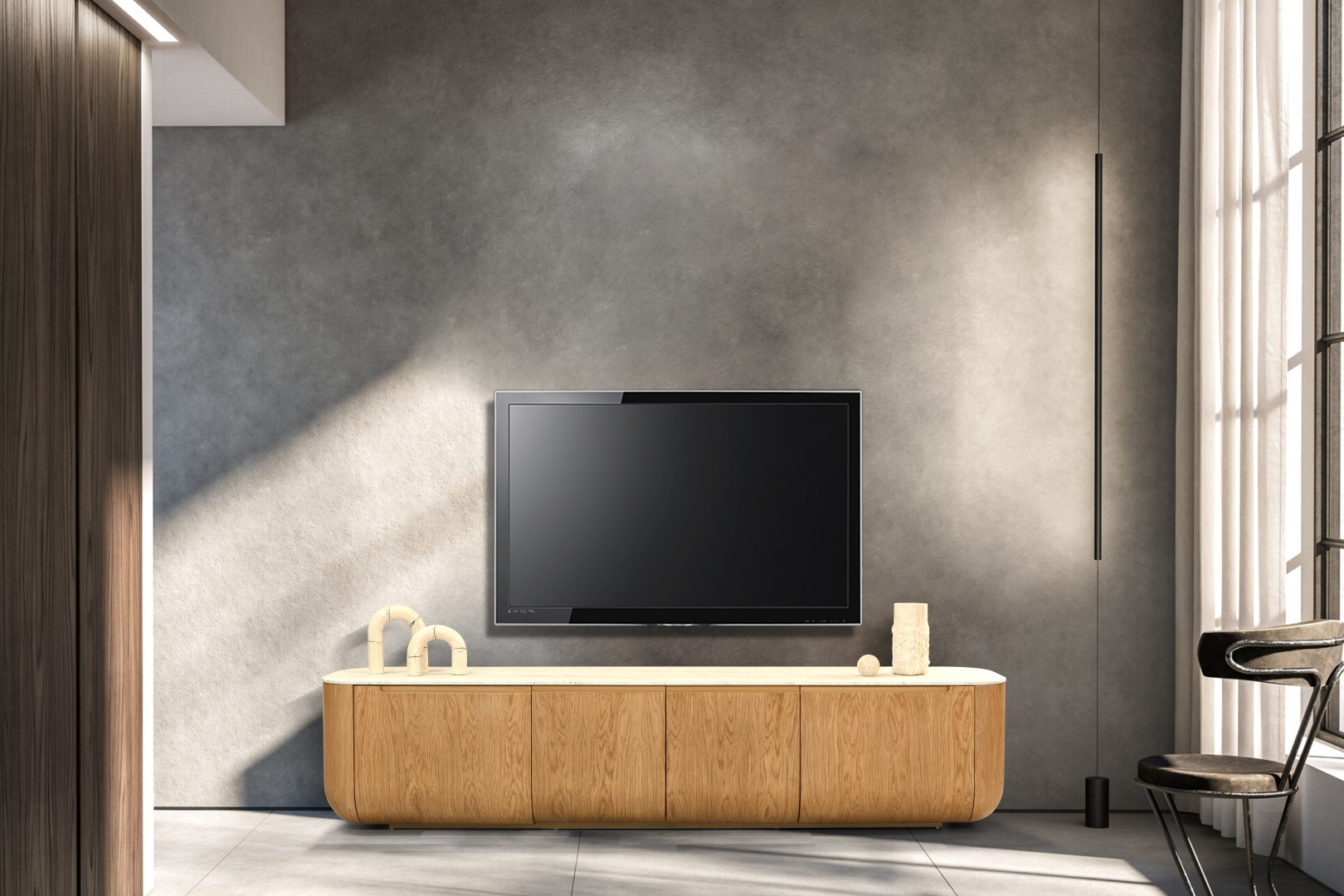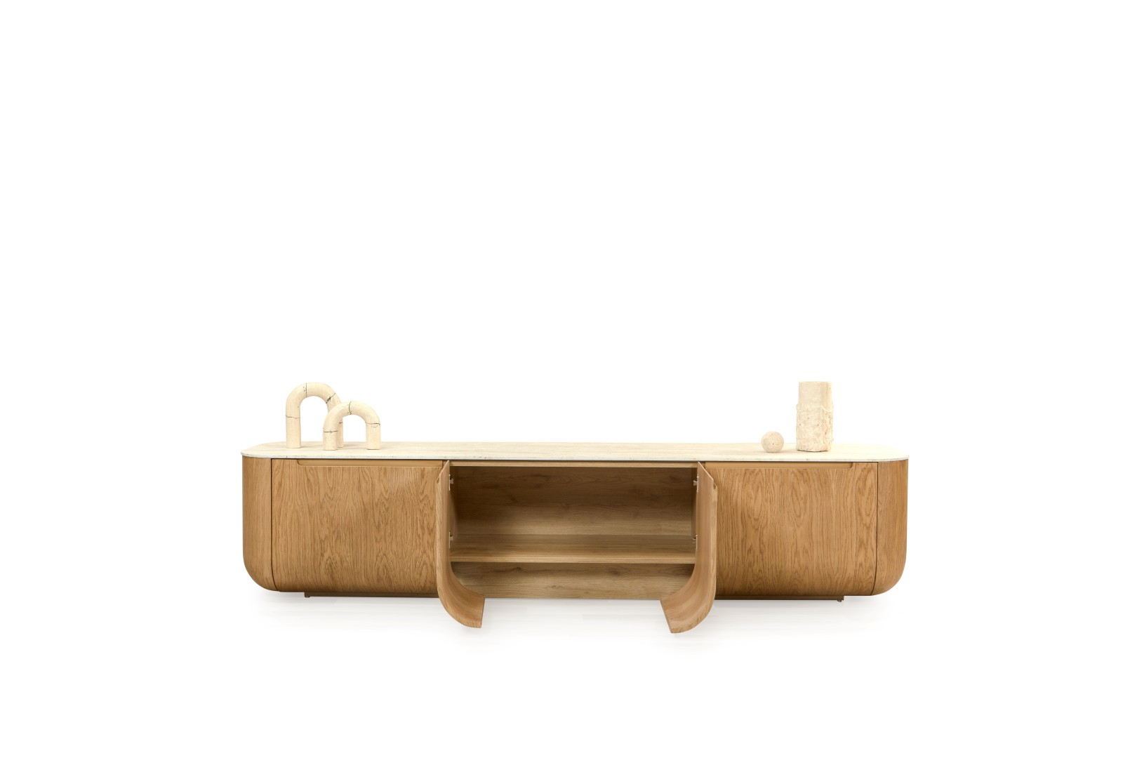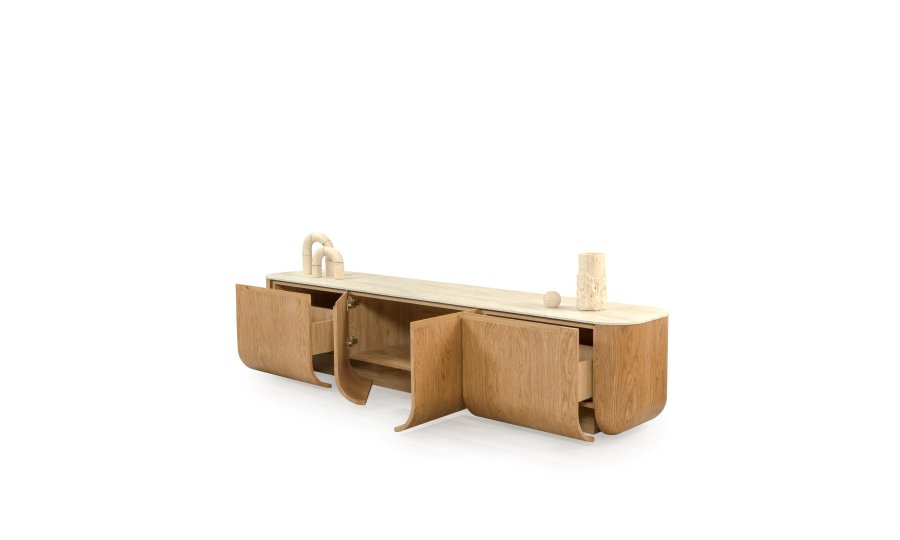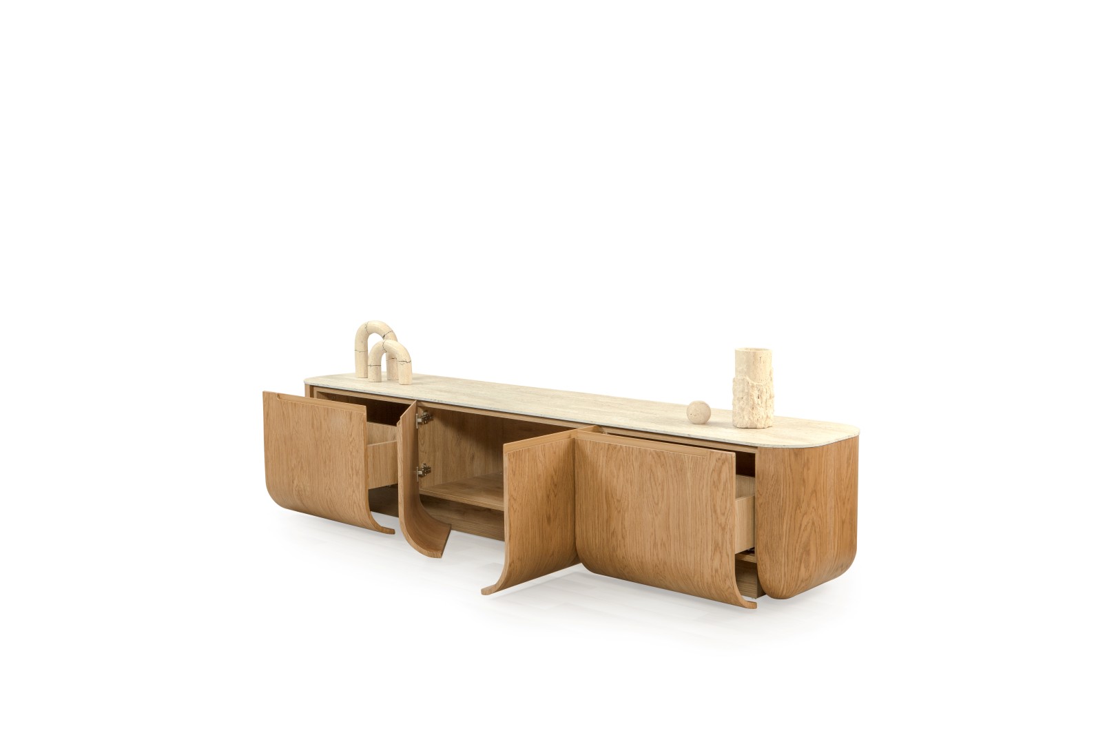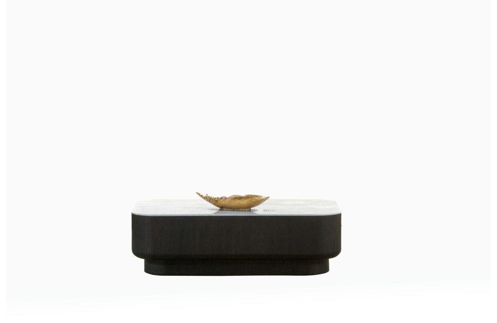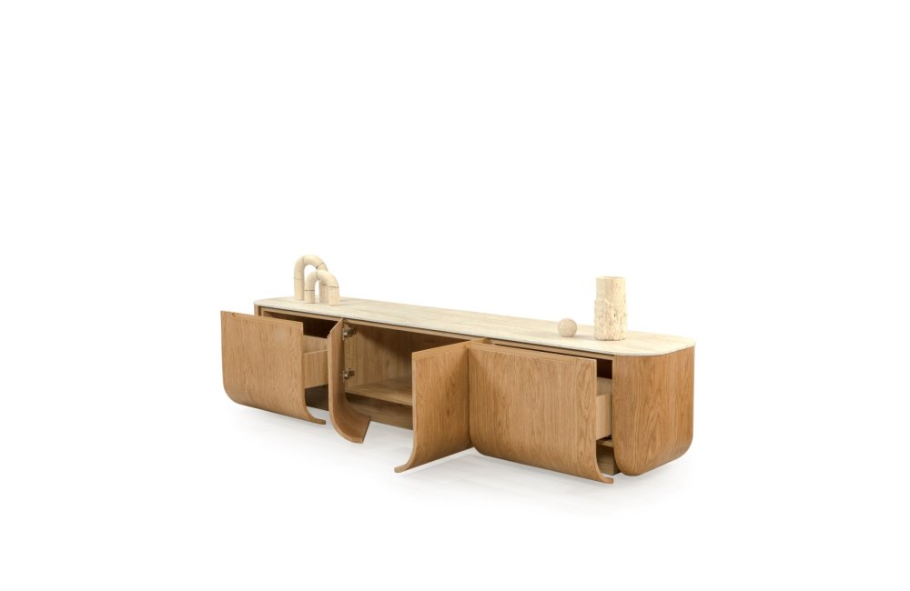 • Doğal Traverten Görünümlü Üst Tabla: Traverten dokulu üst yüzey, ahşap gövde ile mükemmel bir materyal kontrastı oluşturur.