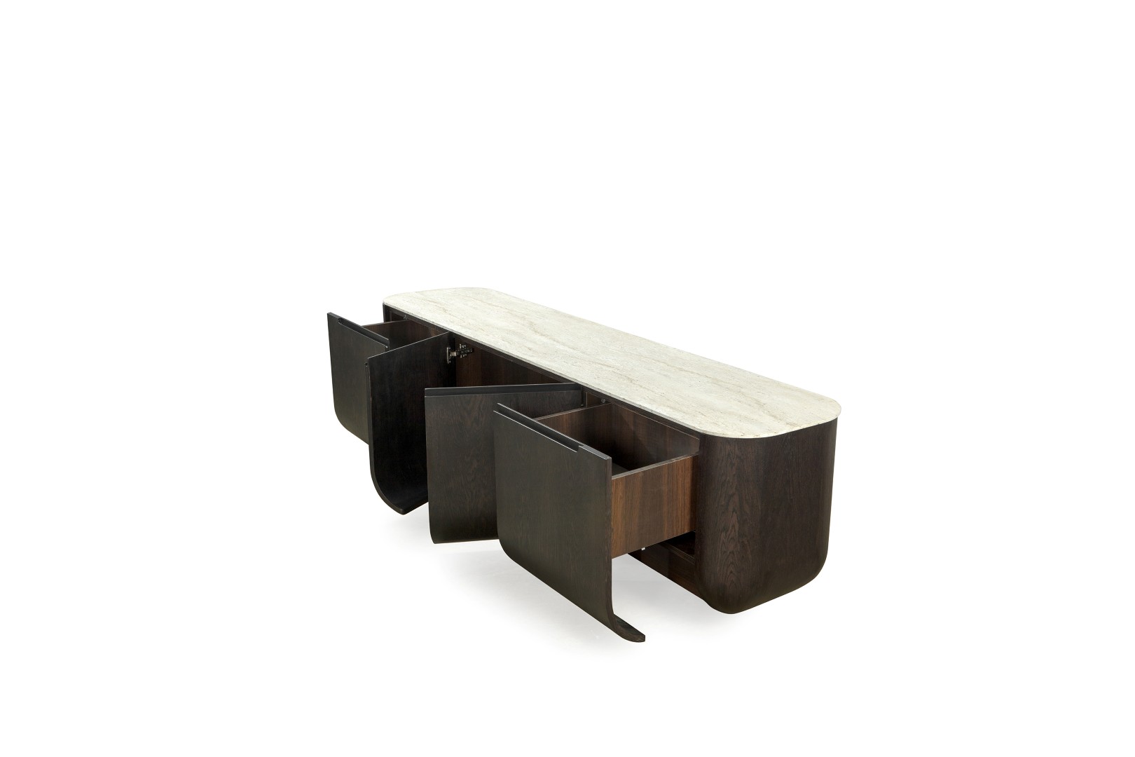 • Doğal Traverten Görünümlü Üst Tabla: Traverten dokulu üst yüzey, ahşap gövde ile mükemmel bir materyal kontrastı oluşturur.