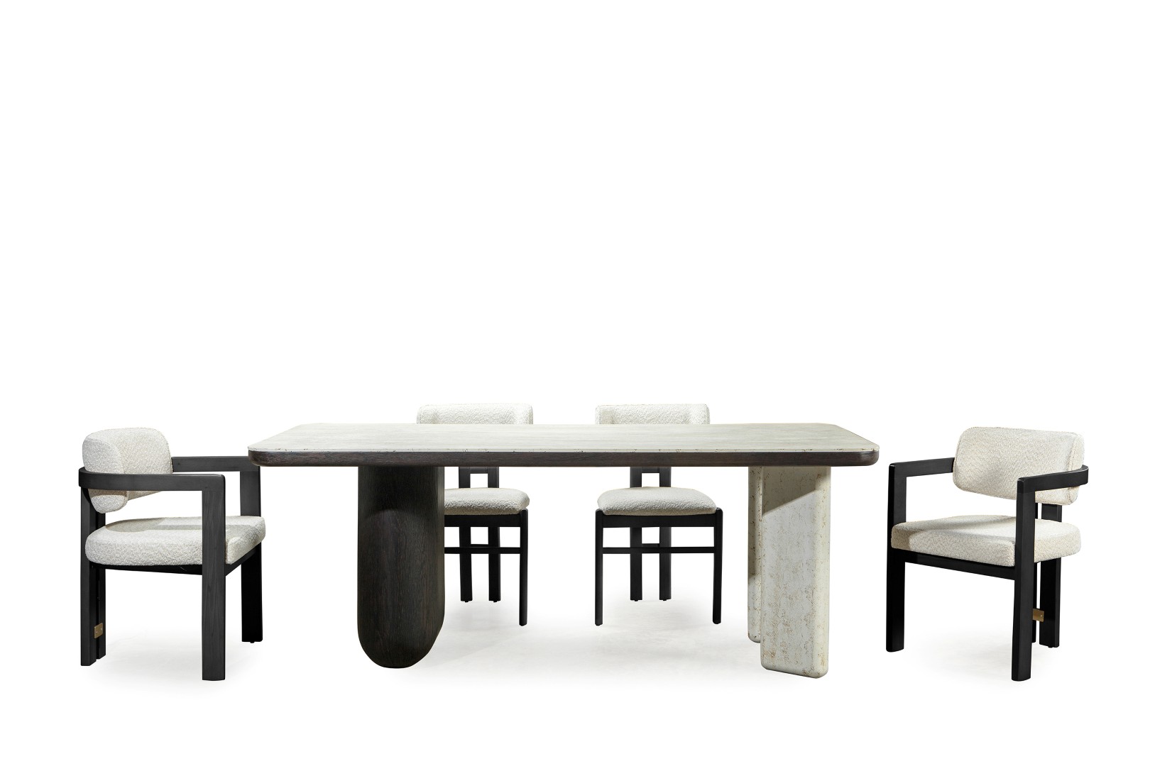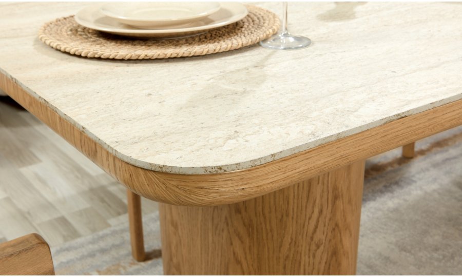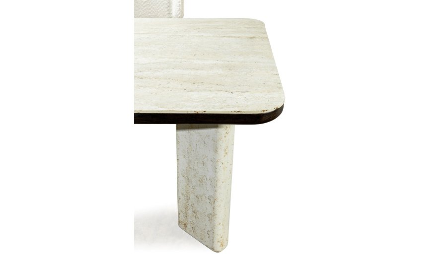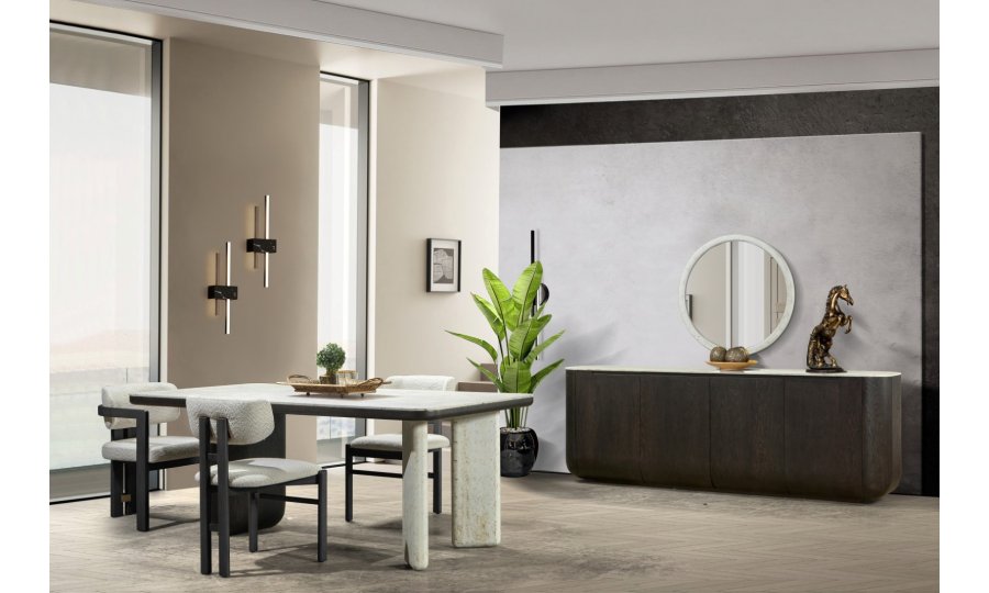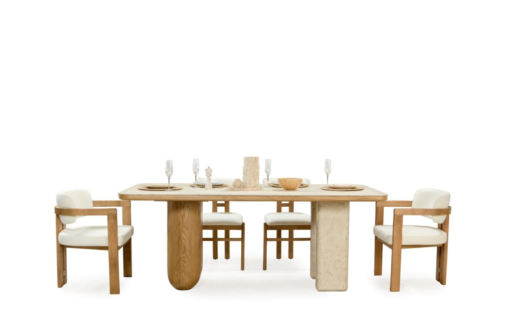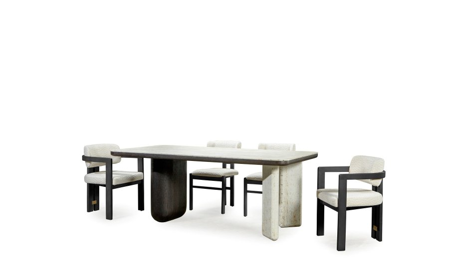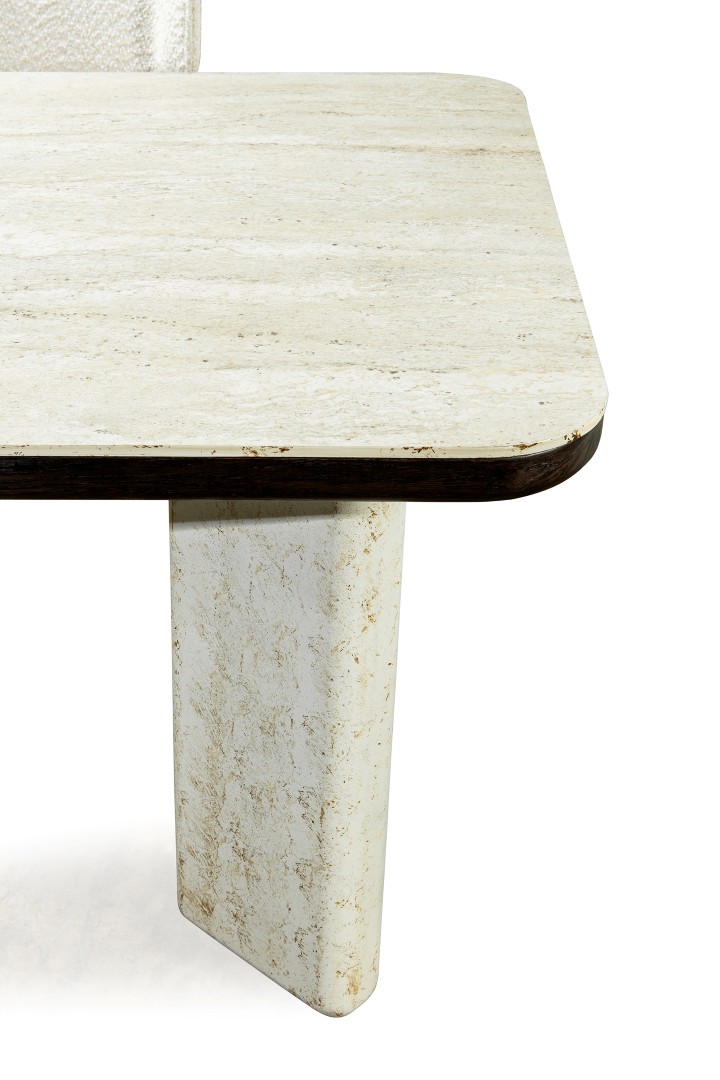 • Traverten ve Mermer Detaylar: Yemek masasının ayaklarında kullanılan traverten dokulu bloklar, doğal taş estetiğini modern mühendislikle birleştirir.