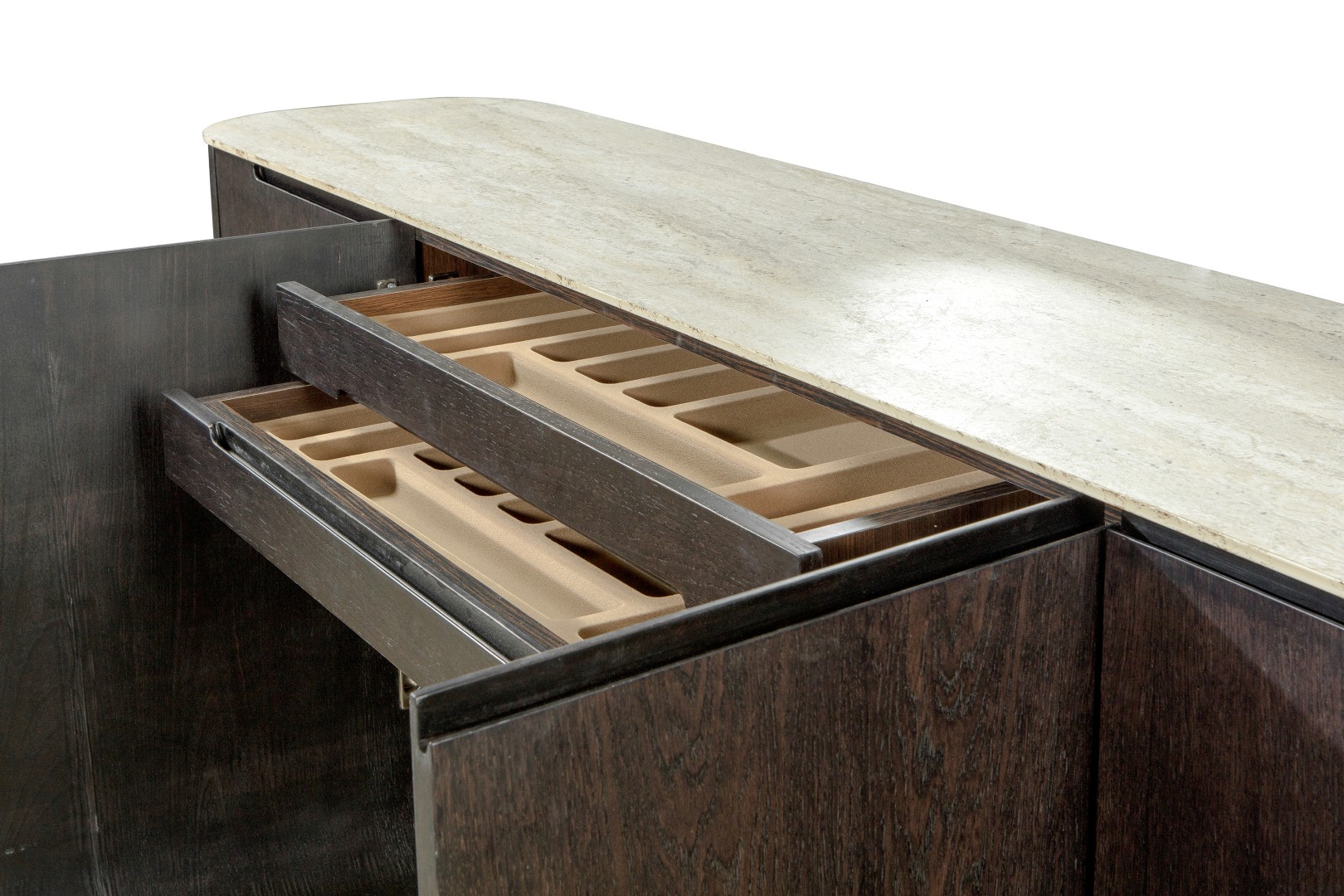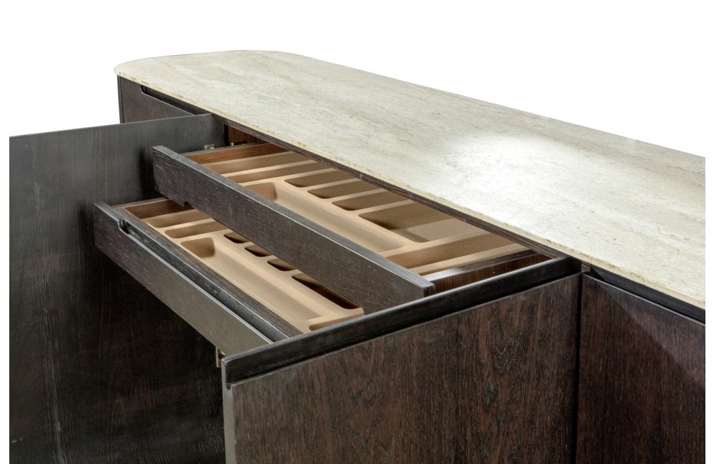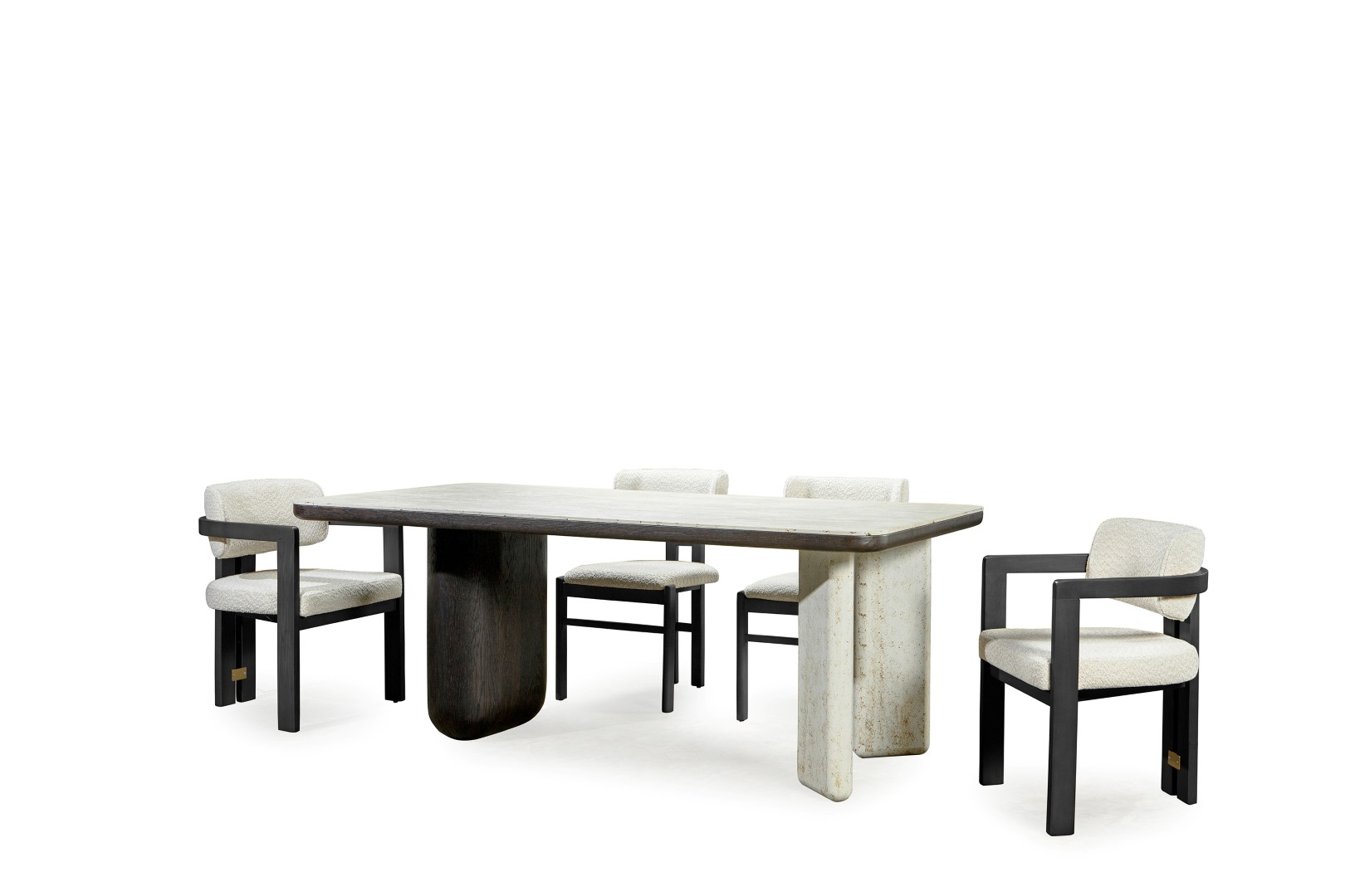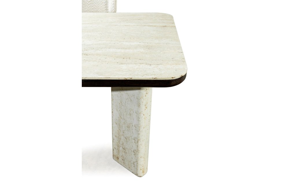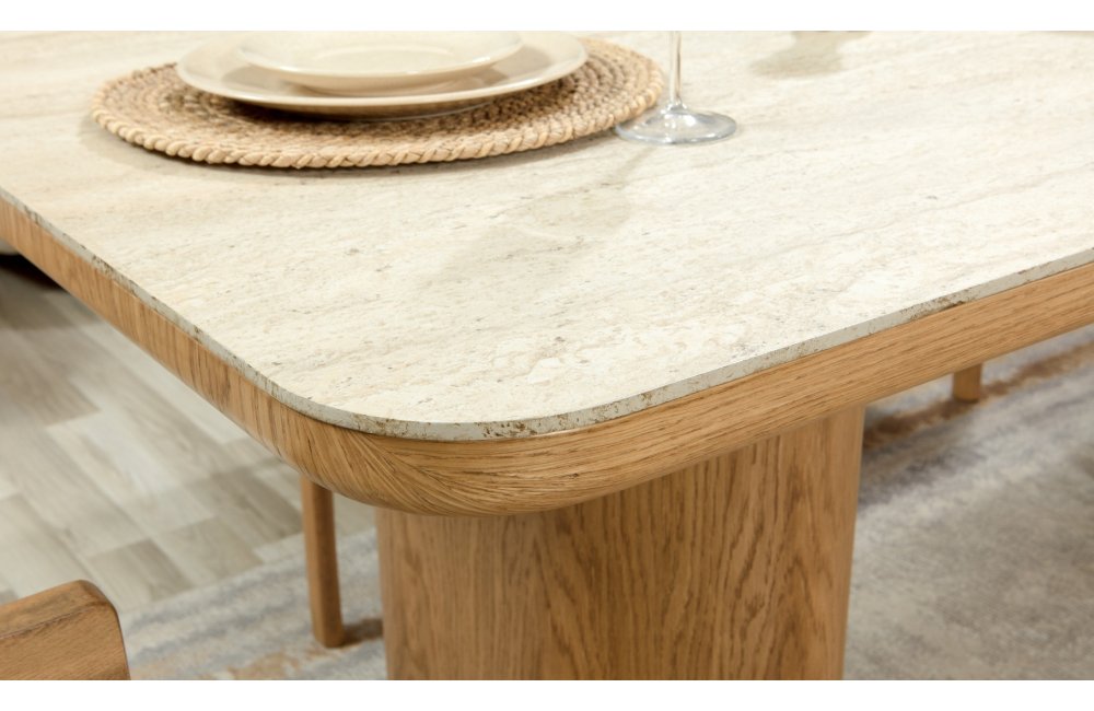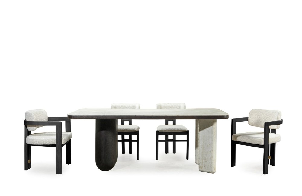 • Traverten ve Mermer Detaylar: Yemek masasının ayaklarında kullanılan traverten dokulu bloklar, doğal taş estetiğini modern mühendislikle birleştirir.