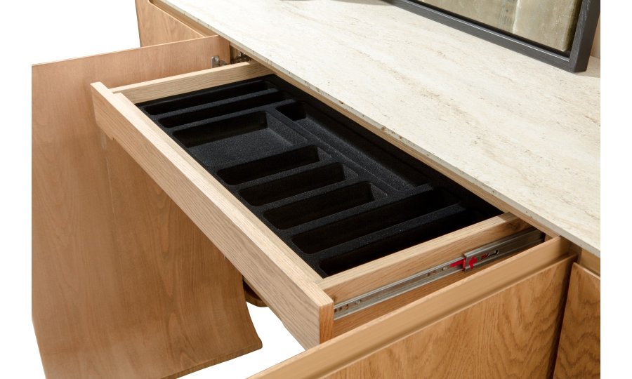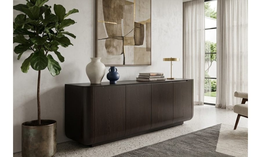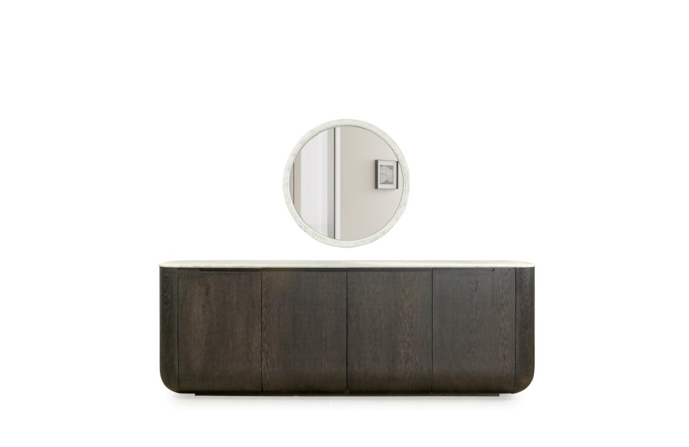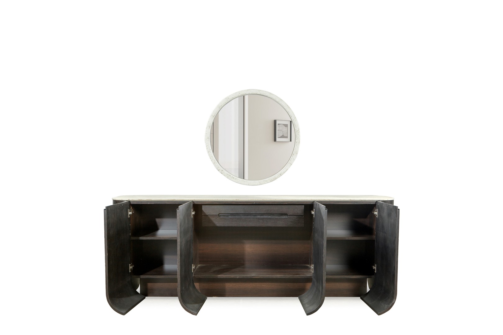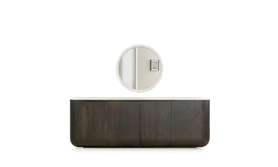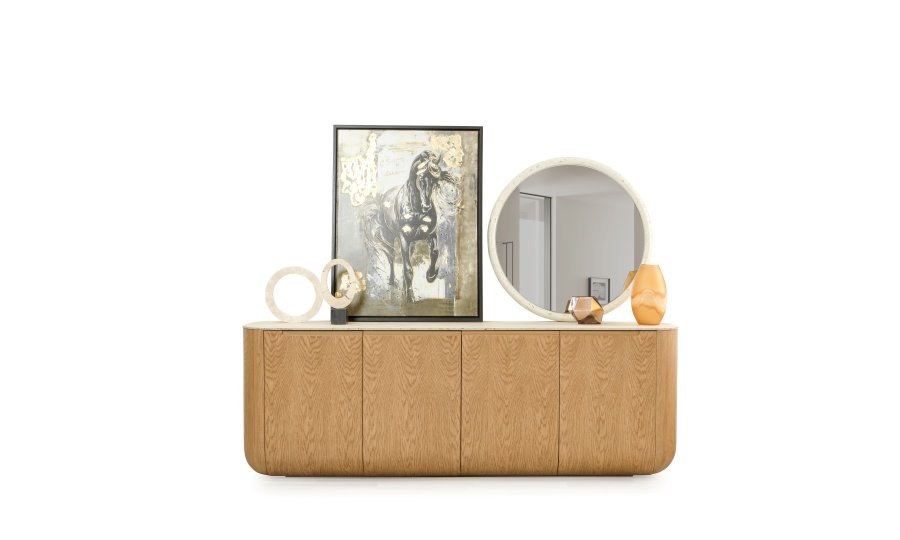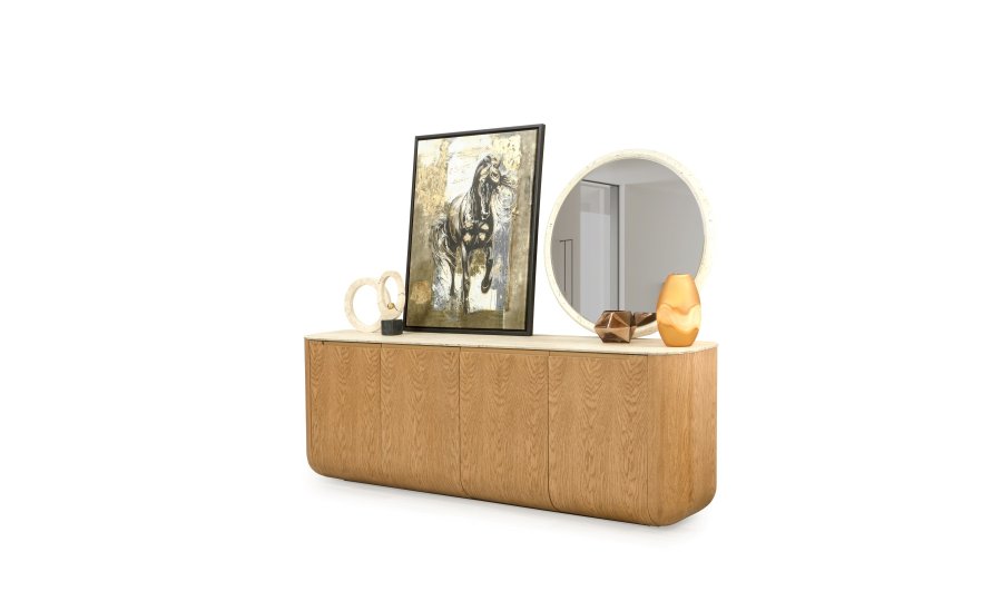 • Doğal Ahşap İşçiliği: Konsol ve masa gövdesinde kullanılan yüksek kaliteli meşe kaplama, dikey formlu dokusuyla mekana derinlik katar.