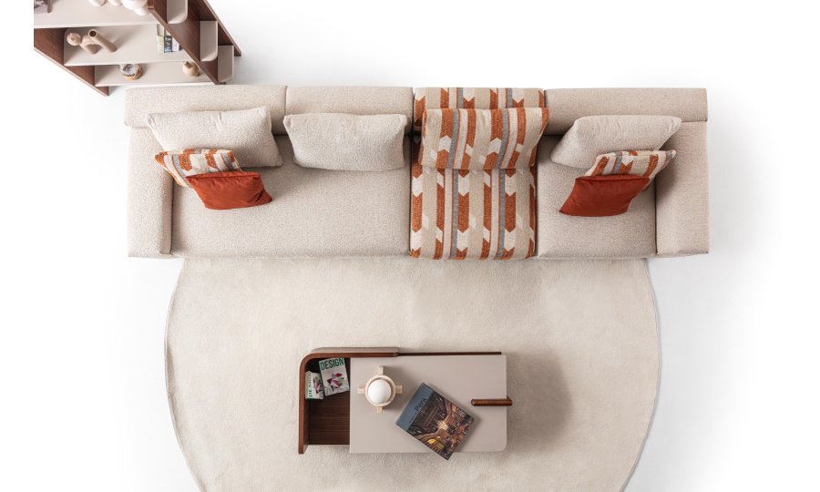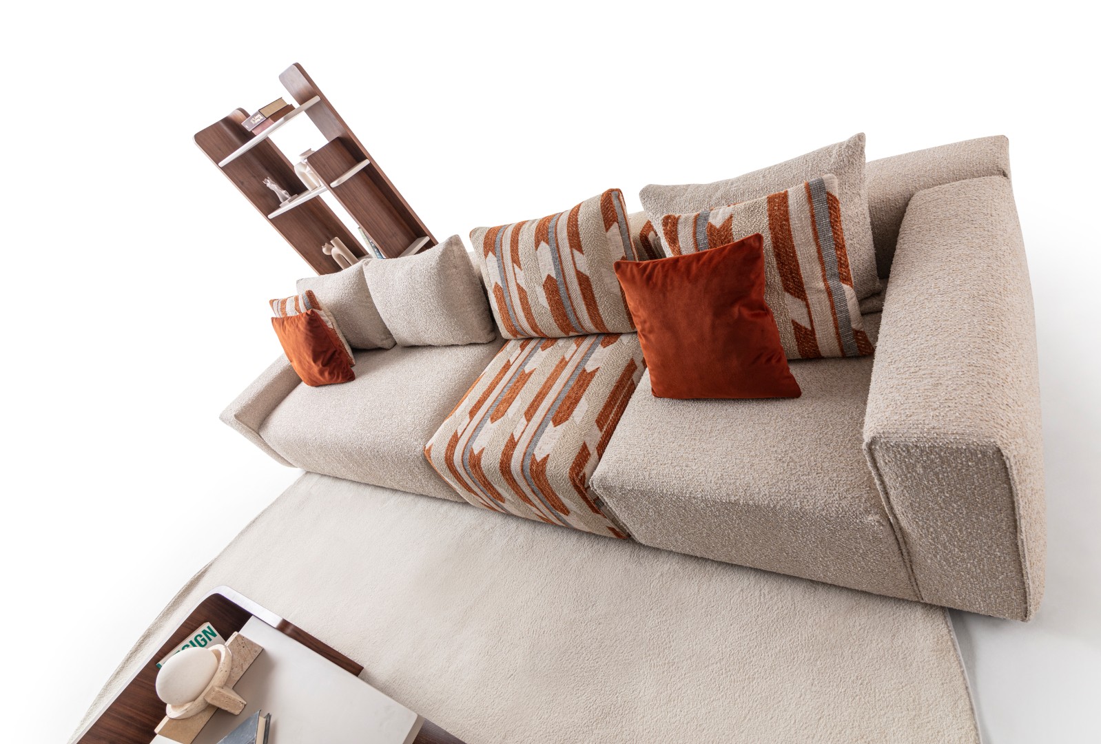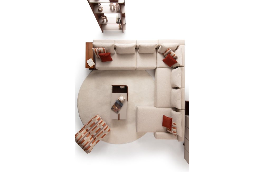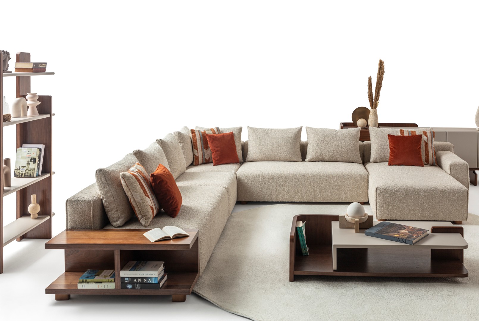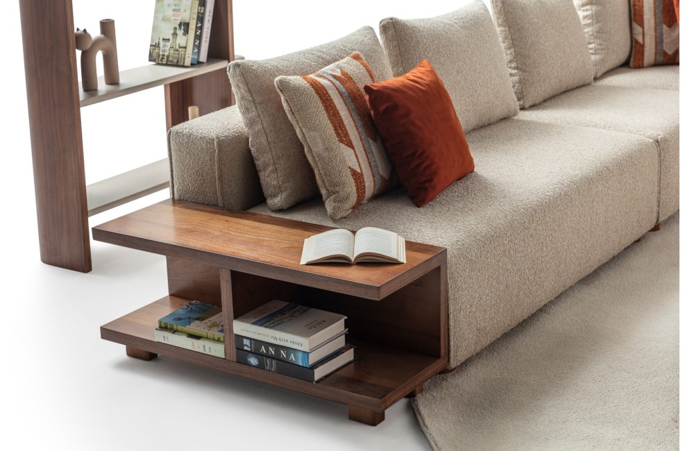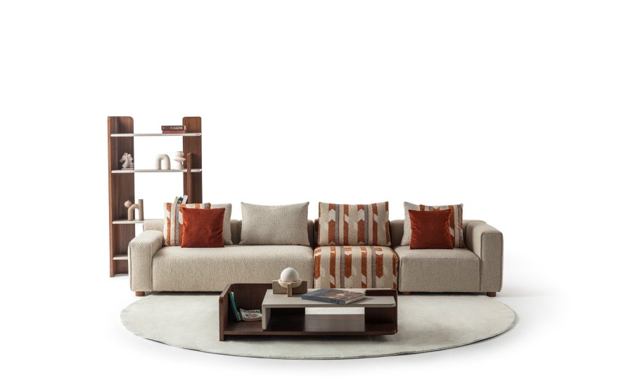 1 Ad. 2'li Modül, 1 Ad. Tekli Kolsuz Modül, 1 Ad. Köşe Modül, 1 Ad. 2'li Kolsuz Modül ve 1 Ad. Ahşap Sehpa Modülden oluşmaktadır.