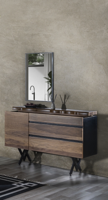 1ad. tek kapaklı raflı dolap, 1ad. tek kapaklı askılıklı dolap, 1ad. çift kapaklı pantolonluklu dolap, 1ad. çift kapaklı çekmeceli dolap, 1ad. şifonyer ve aynası, 1ad. bazalı karyola ve 2ad. komodinden oluşmaktadır. Köşe dolap, ada şifonyer ve çamaşırlık opsiyonel olarak satışa sunulmuştur.