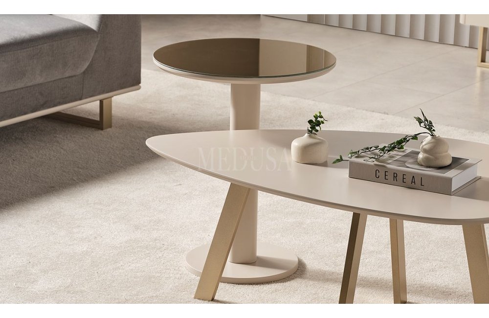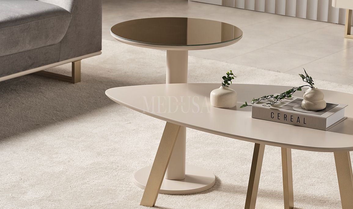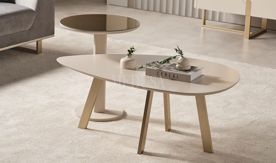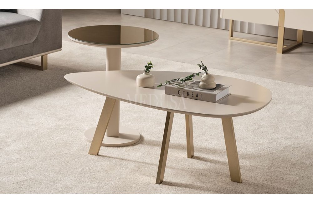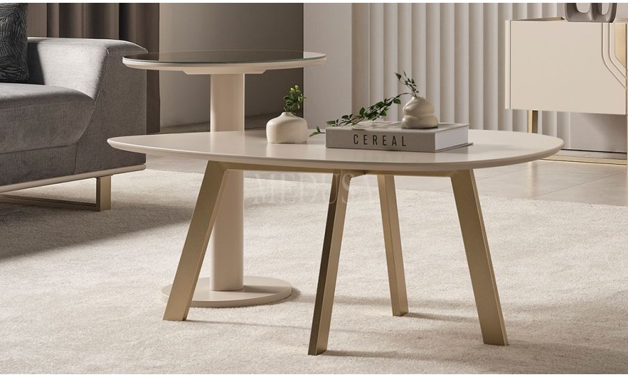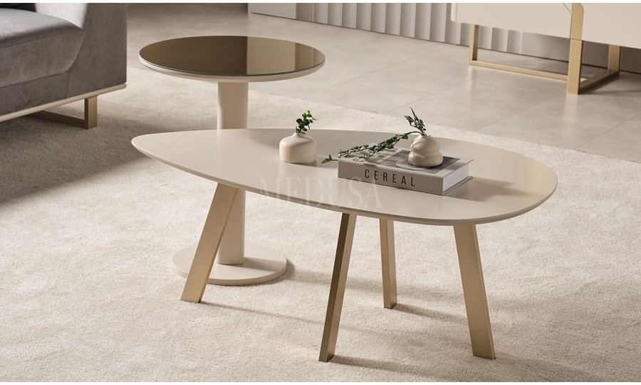 • MDF malzeme üzeri lake boyalı vizon bej rengi ile üretilmiştir. Ayaklar metal malzemeden üretilmiştir.