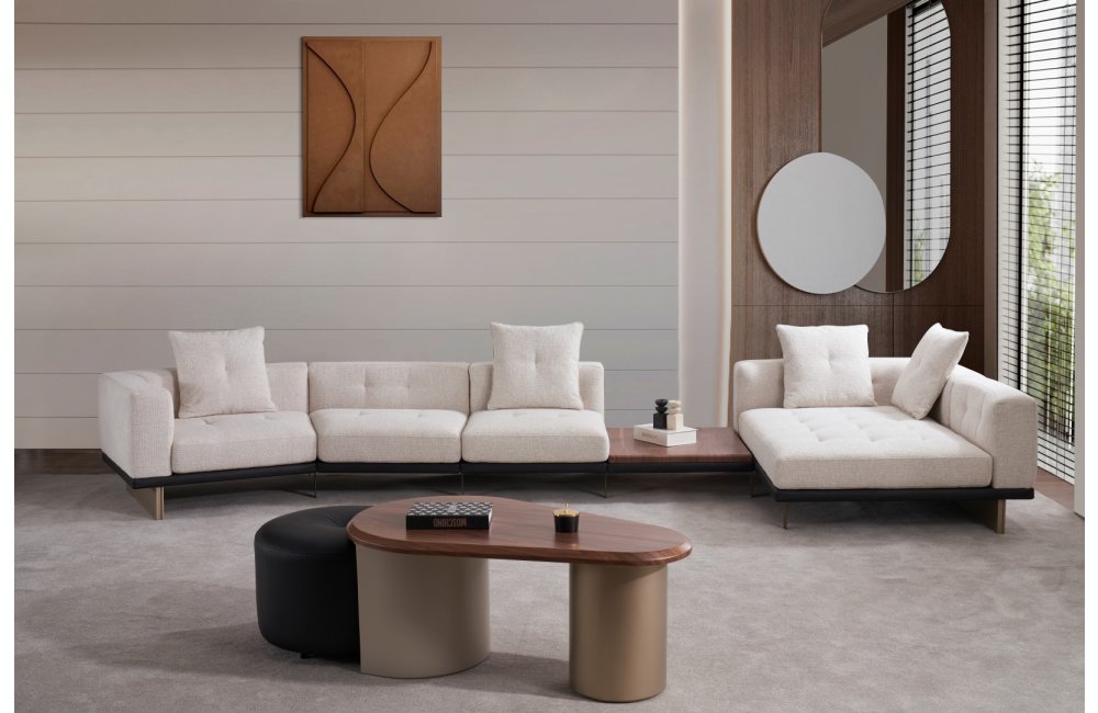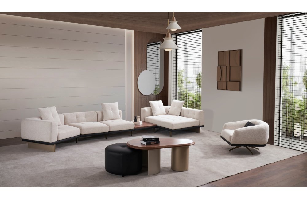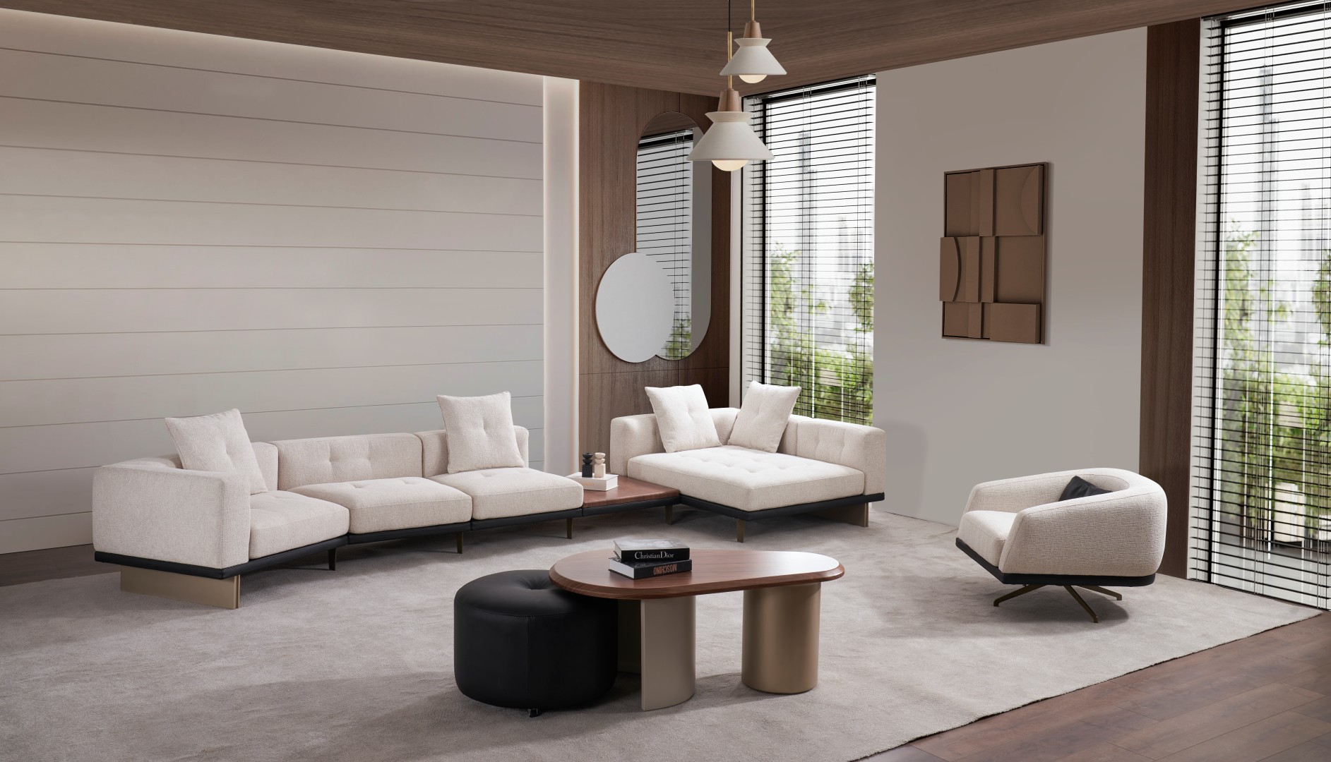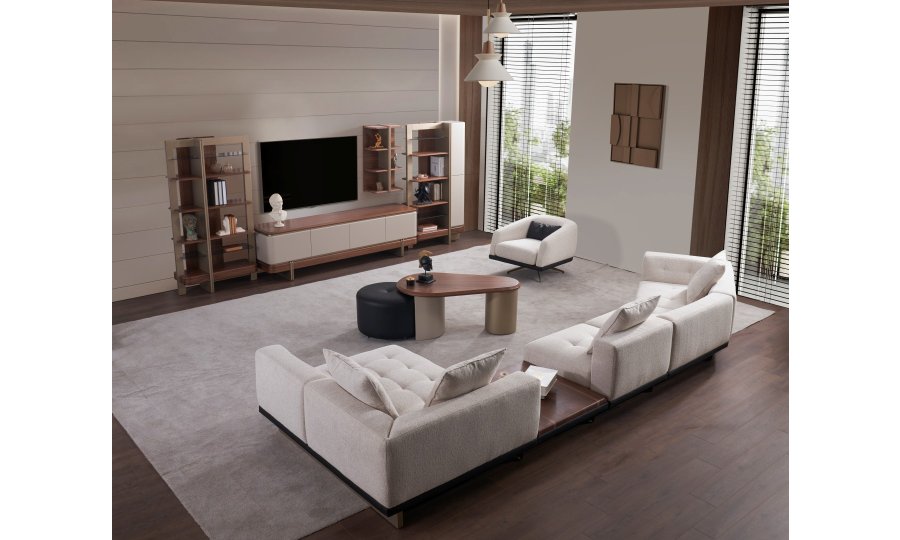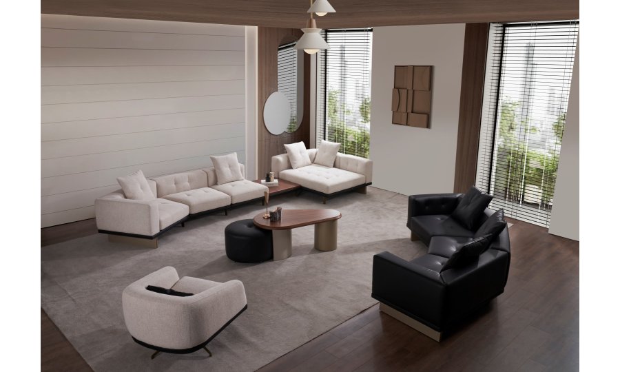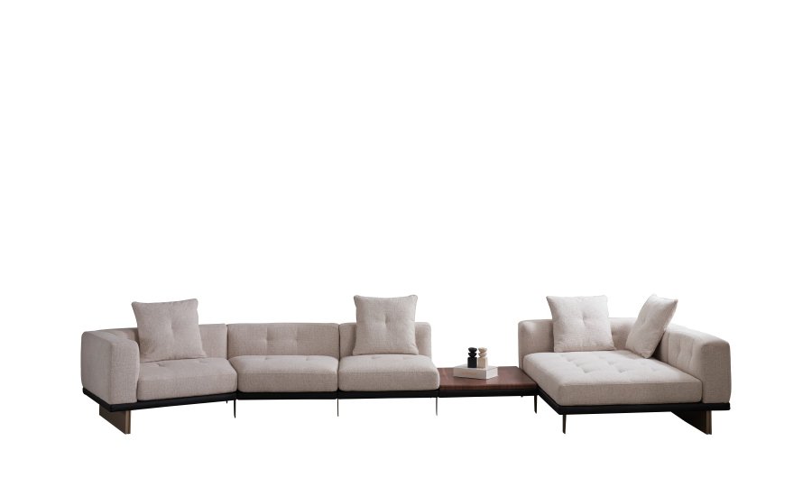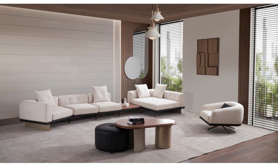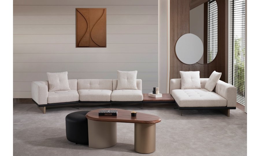 1 ad. açılı kollu modül, 1 ad. açılı orta modül, 1 ad. orta modül, 1 ad. relax modül ve 1 ad. ara sehpadan oluşmaktadır.