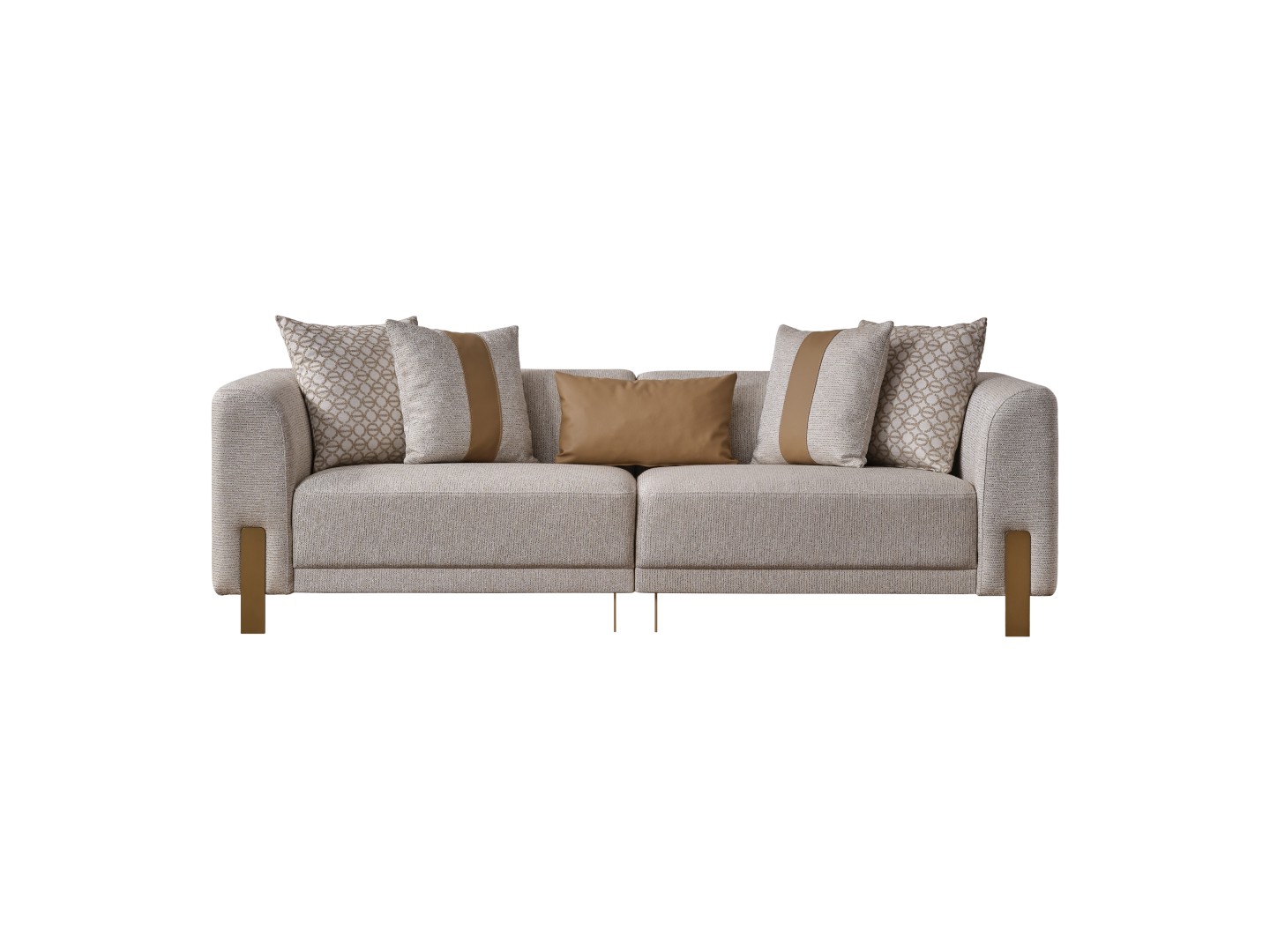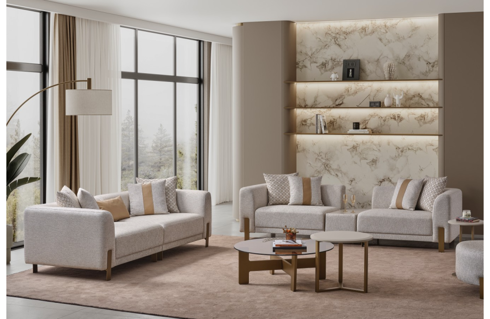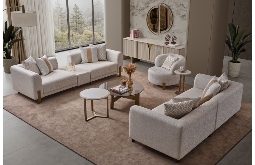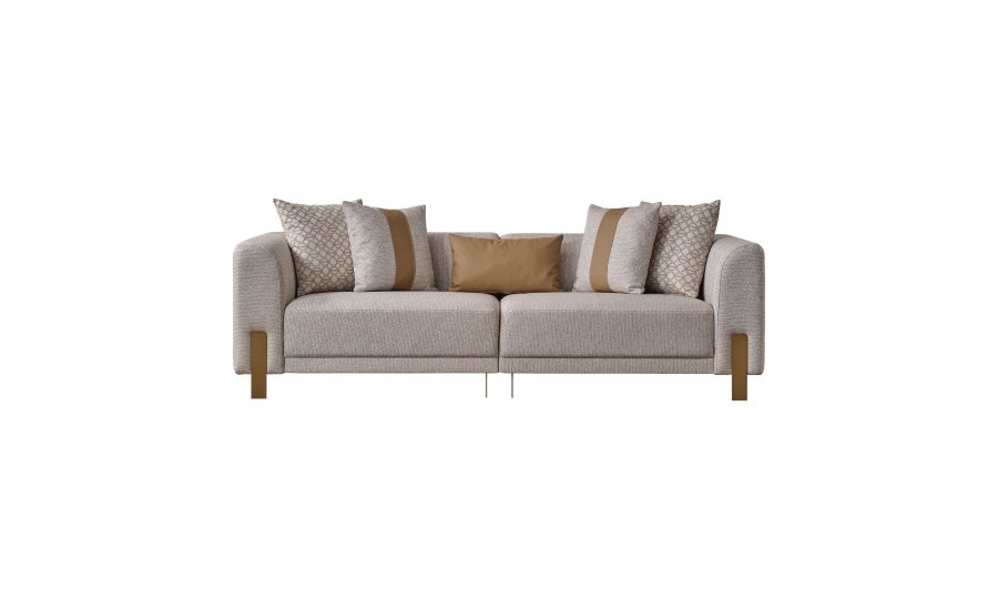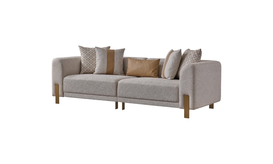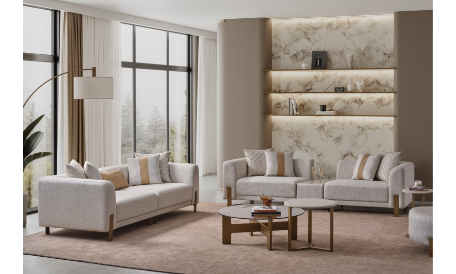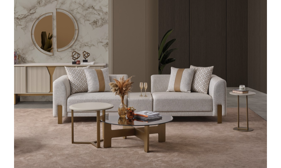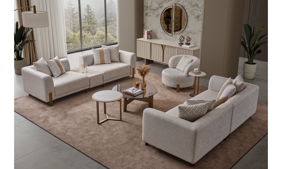 • Bronz Metal Detaylar: Koltuk gövdesine gömülü geniş bronz ayaklar, tasarımın sağlamlığını vurgularken serinin diğer parçalarıyla (yemek odası, TV ünitesi) mükemmel bir görsel bütünlük yakalar.