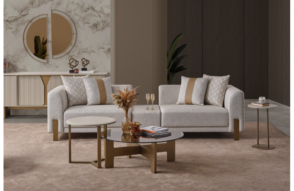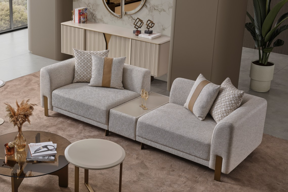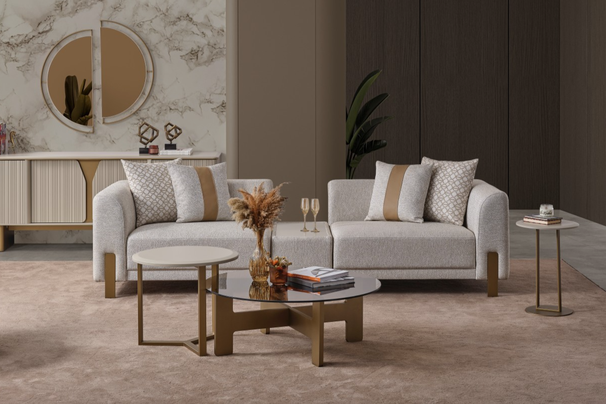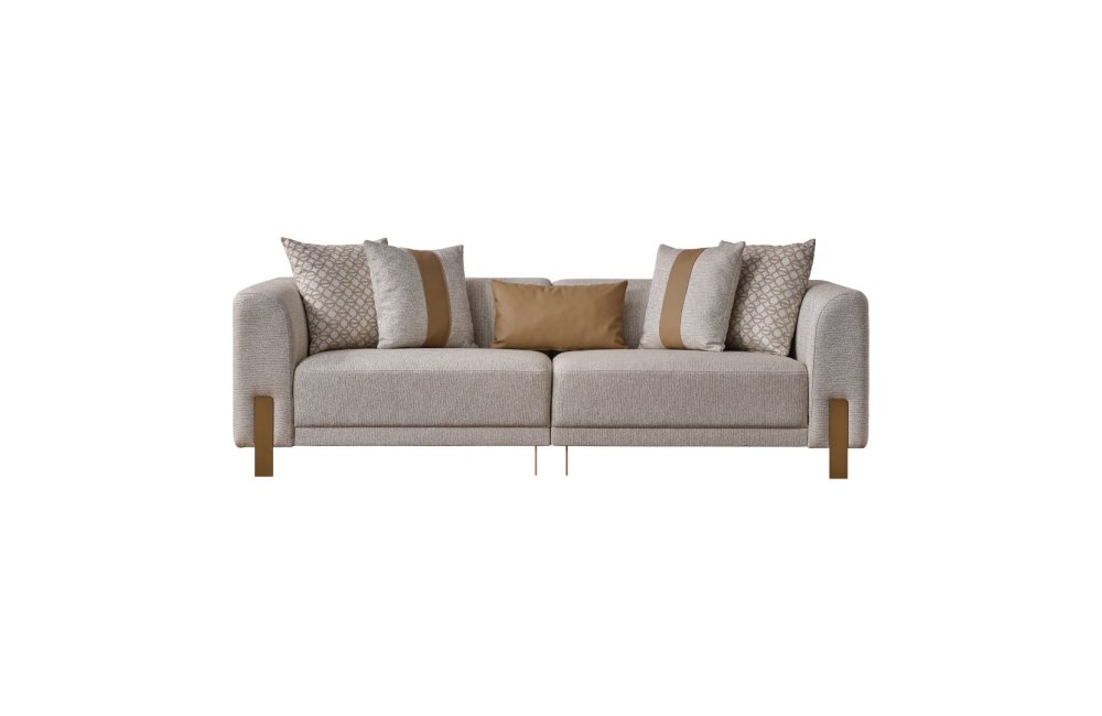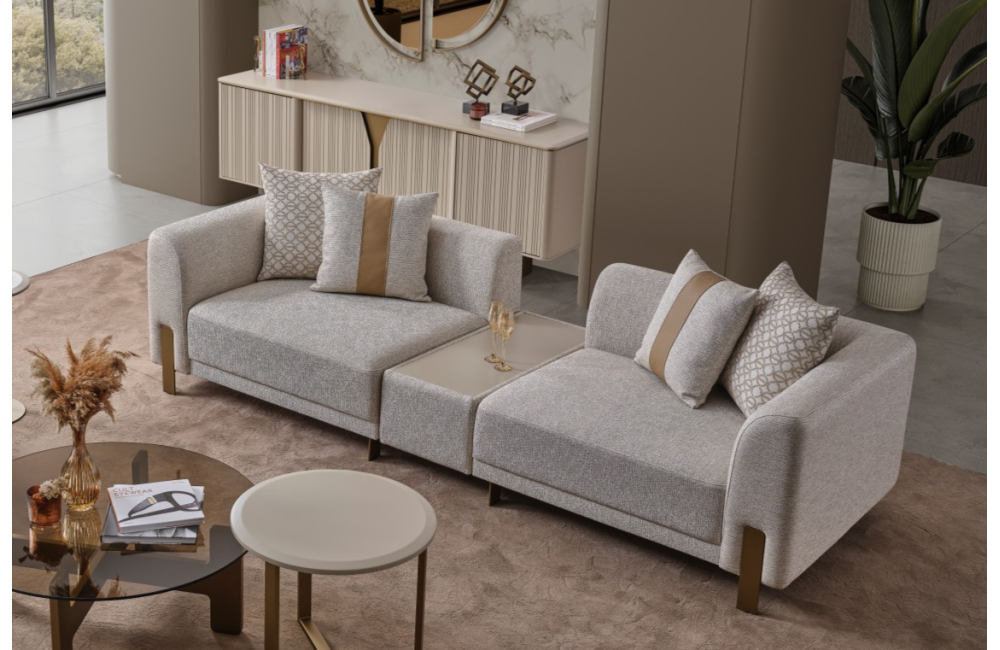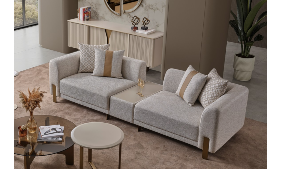 • Bronz Metal Detaylar: Koltuk gövdesine gömülü geniş bronz ayaklar, tasarımın sağlamlığını vurgularken serinin diğer parçalarıyla (yemek odası, TV ünitesi) mükemmel bir görsel bütünlük yakalar.