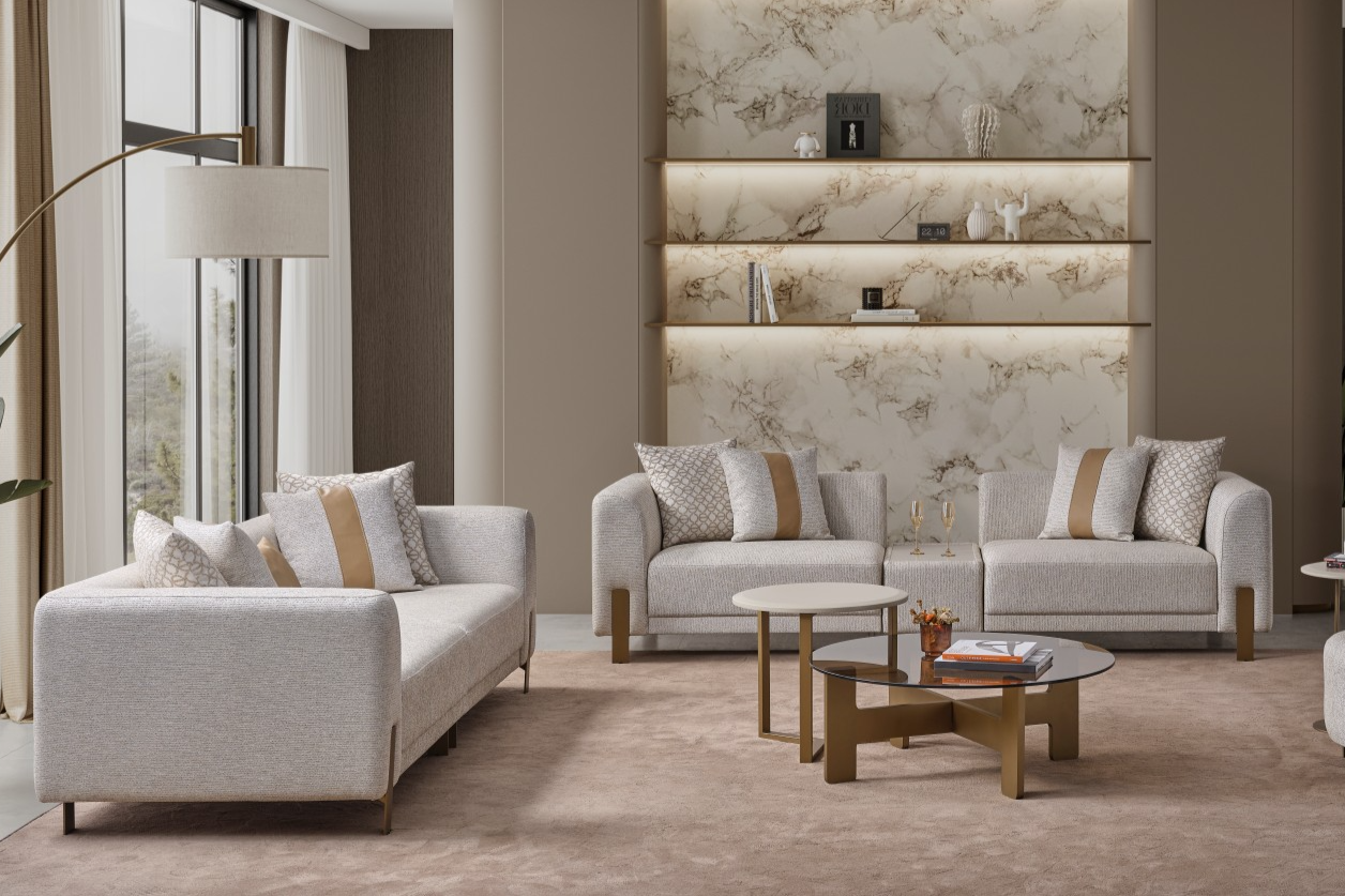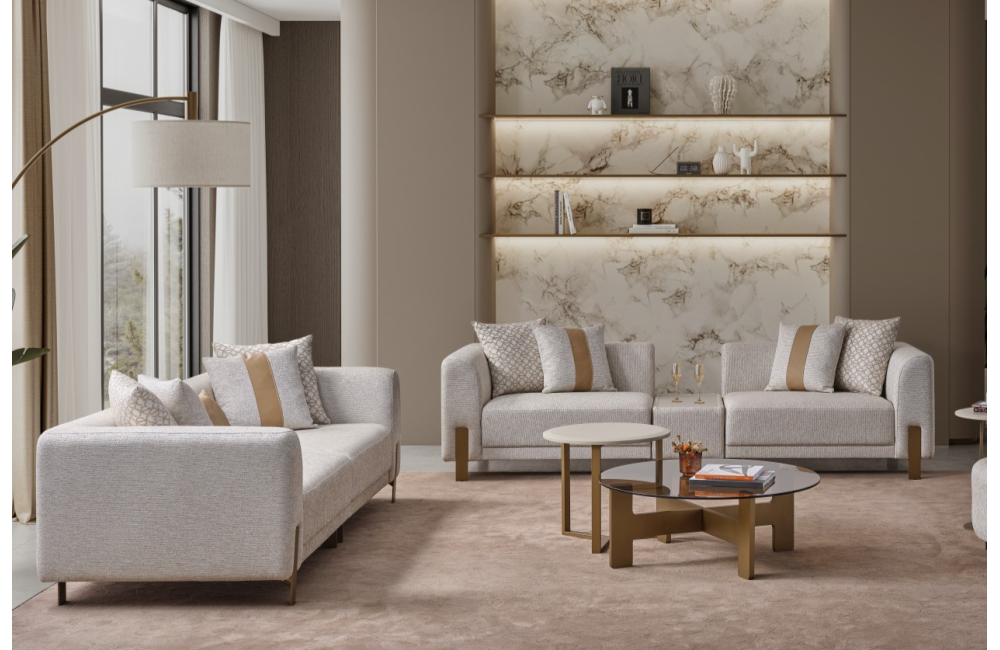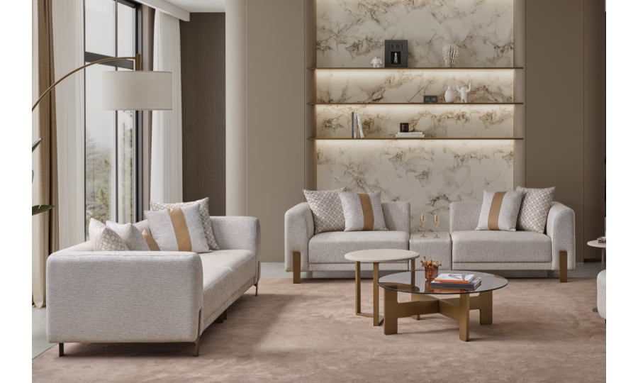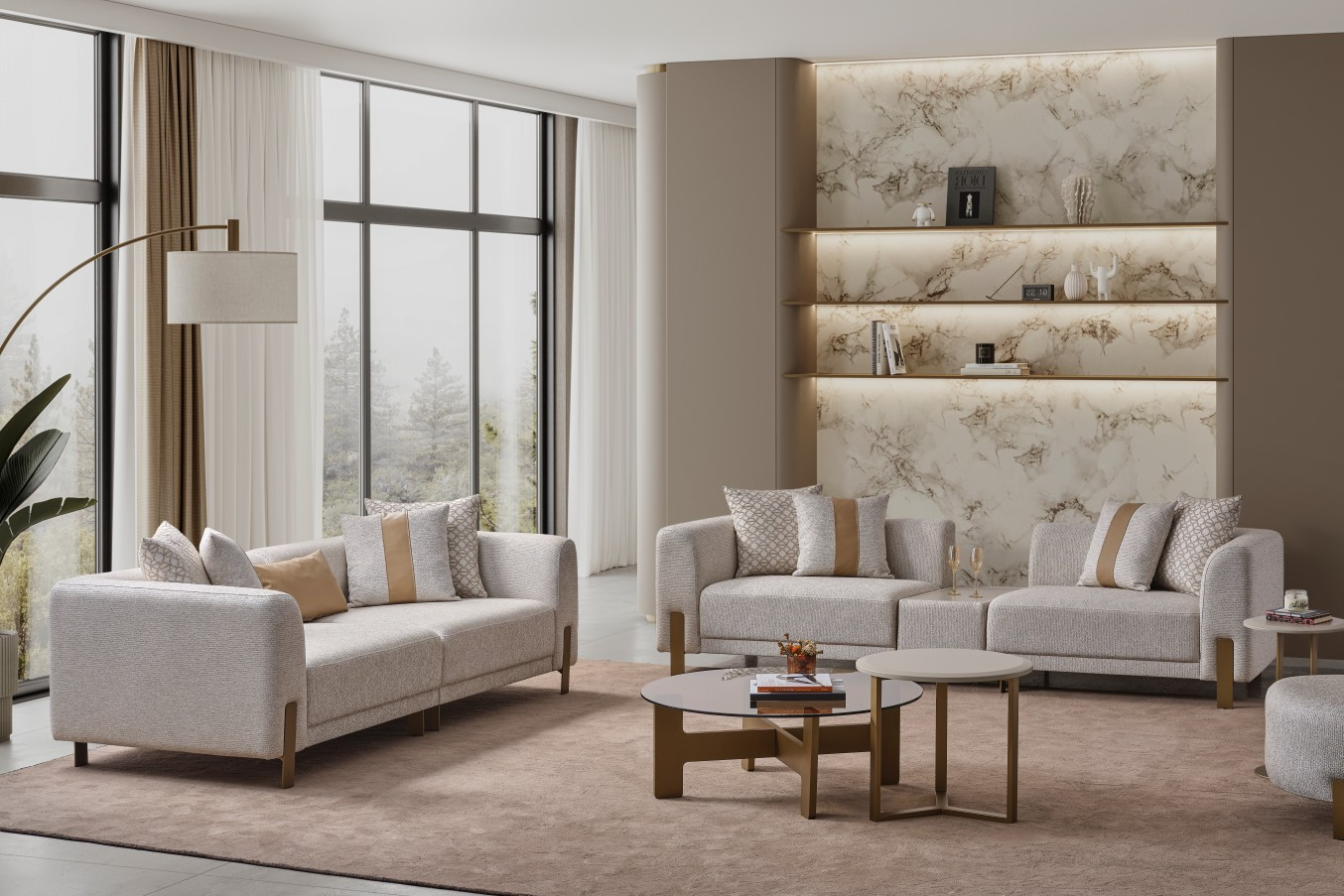 • Sezonun Trendi Buklet Kumaş: Dokunsal sıcaklık sunan yüksek kaliteli buklet (bouclé) kumaş kullanımı, takıma hem zengin bir görünüm hem de yumuşak bir oturum konforu sağlar.
