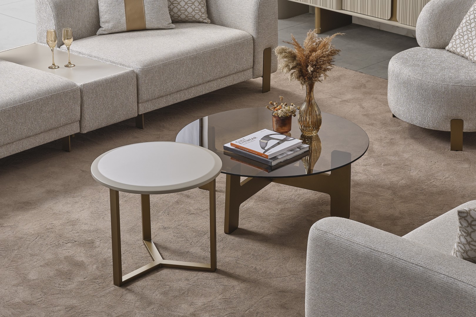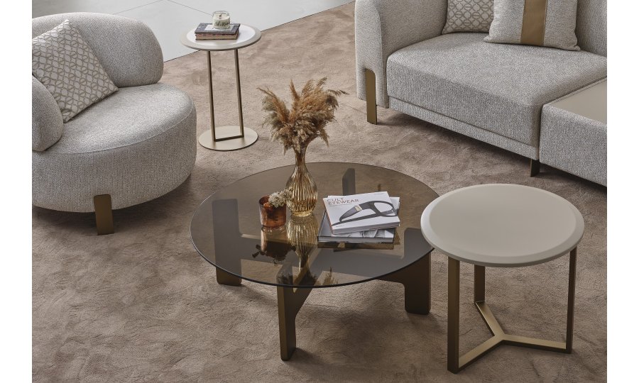 • İkonik Ayak Yapısı: Cam sehpanın heykelsi blok ayak formu ile diğer parçaların ince metal konstrüksiyonu, görsel bir denge ve kontrast yaratır.