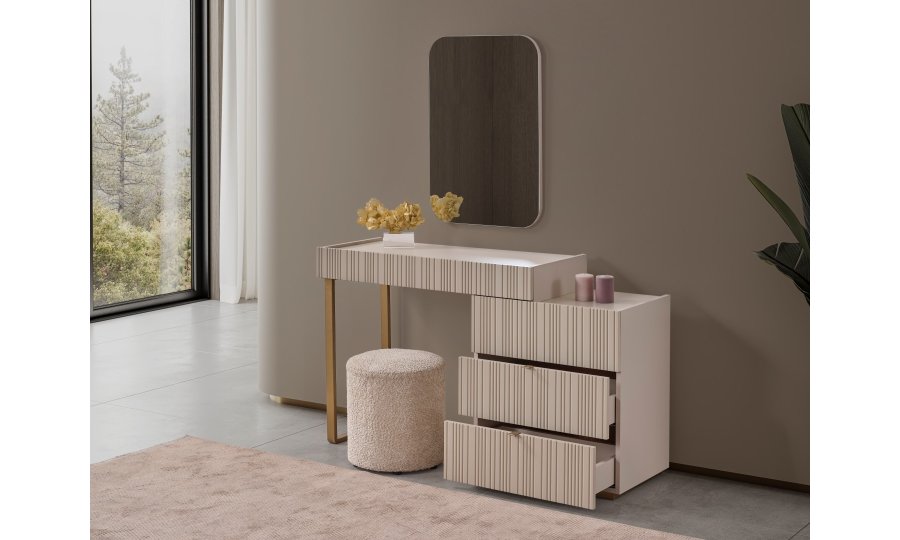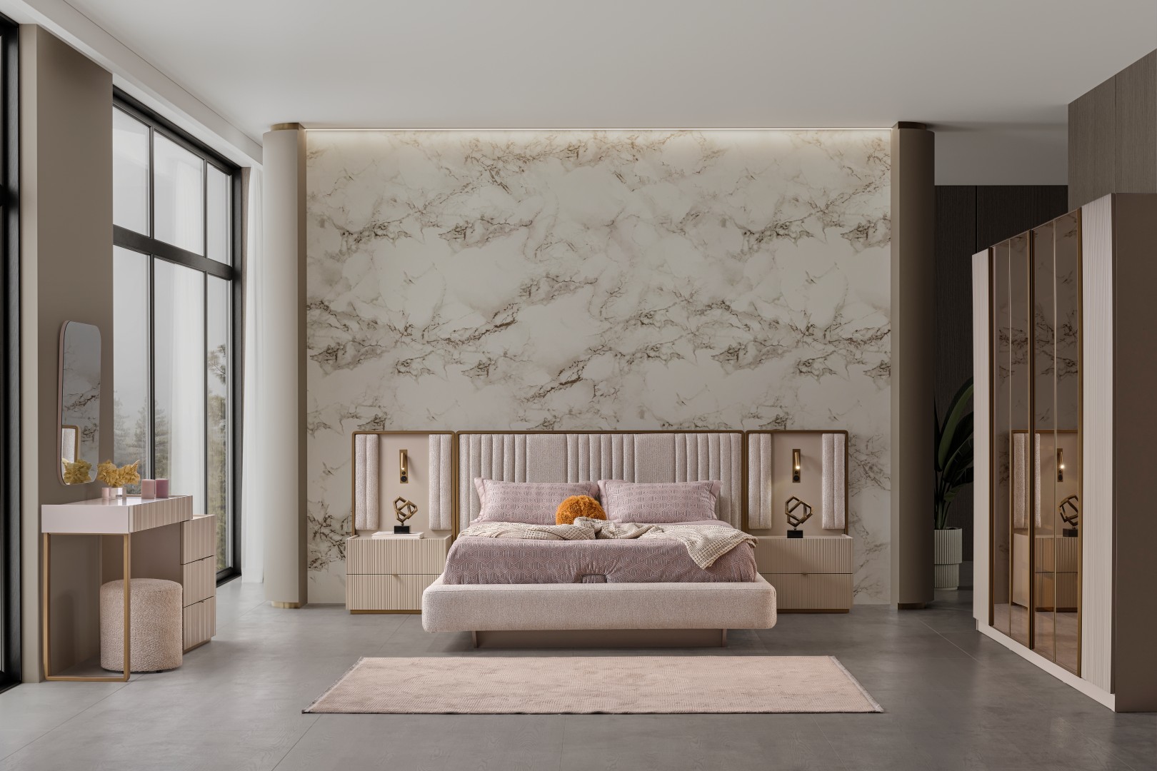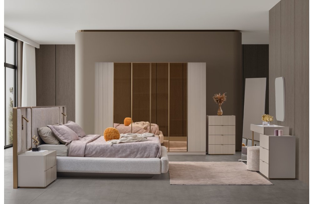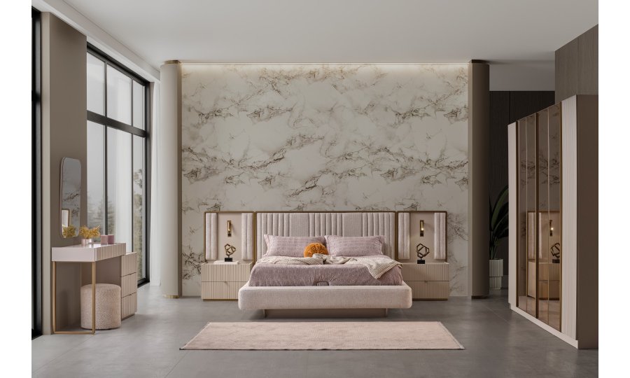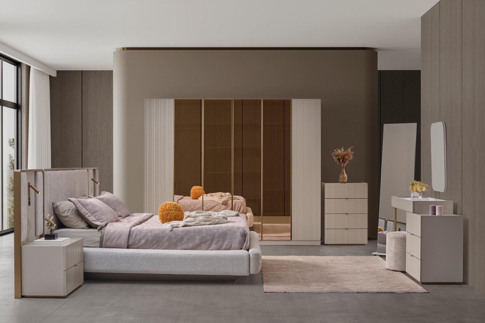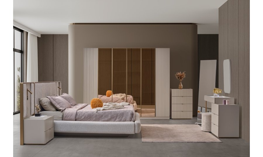 • Özel Tasarım Komodin ve Şifonyer: Şifonyer ve komodinlerde kullanılan lineer (çizgisel) yüzey dokusu, dokunsal bir lüks hissi yaratır. Şifonyerin kademeli yapısı ve geniş çekmeceleri, makyaj masası ihtiyacınızı en şık şekilde karşılar.