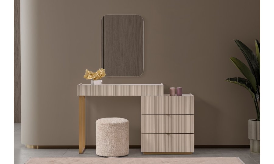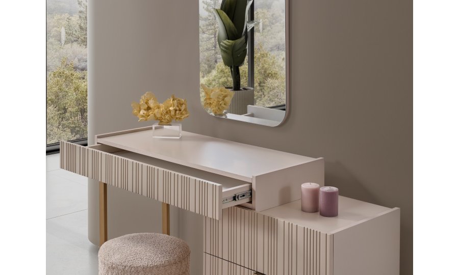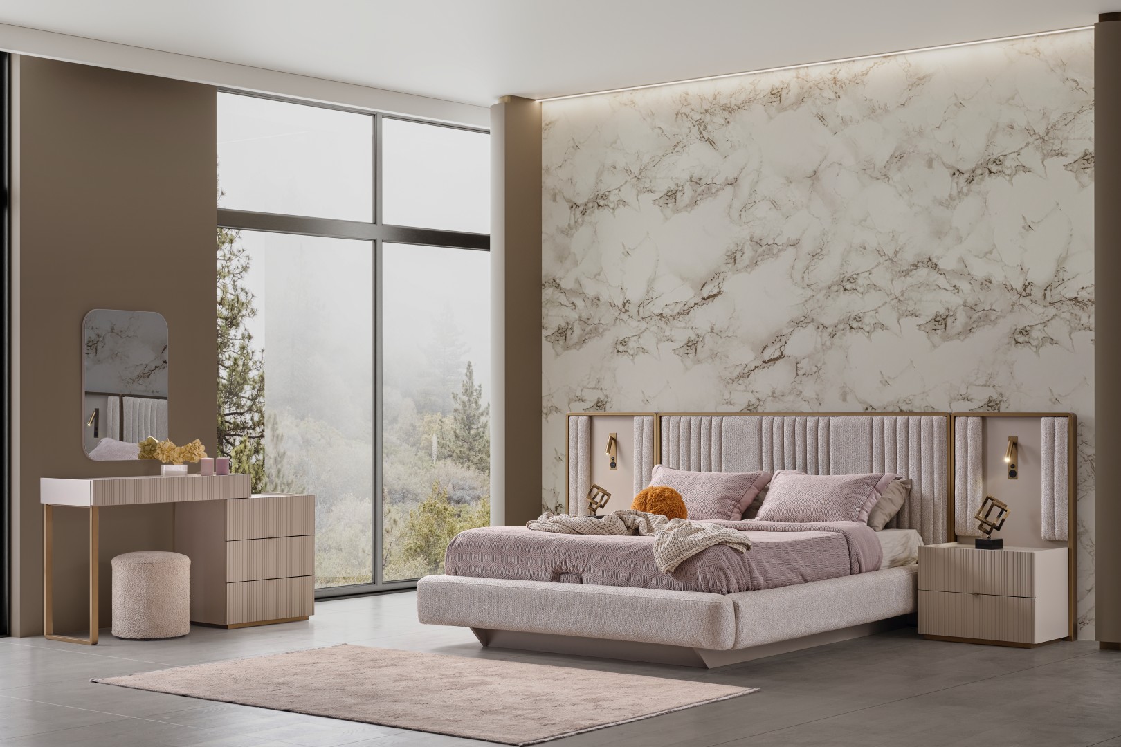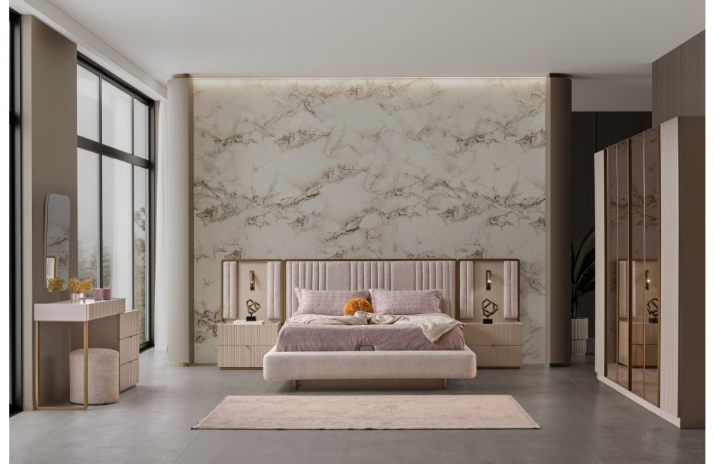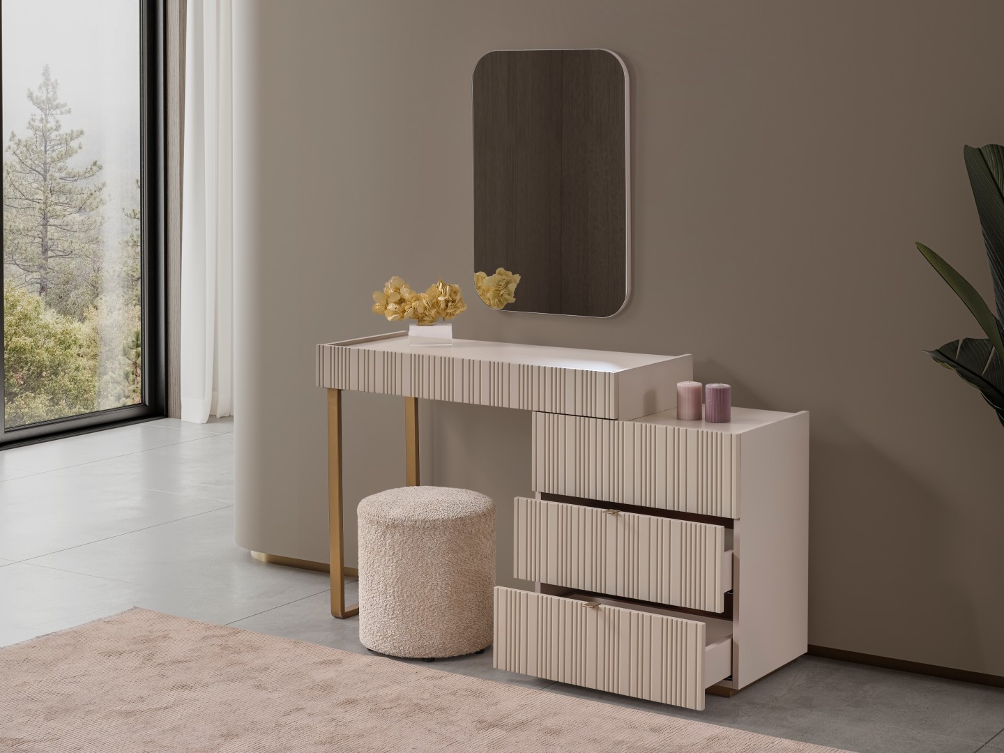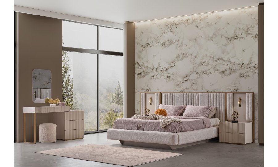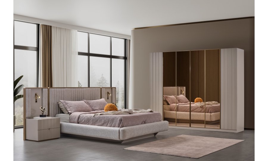 • Özel Tasarım Komodin ve Şifonyer: Şifonyer ve komodinlerde kullanılan lineer (çizgisel) yüzey dokusu, dokunsal bir lüks hissi yaratır. Şifonyerin kademeli yapısı ve geniş çekmeceleri, makyaj masası ihtiyacınızı en şık şekilde karşılar.