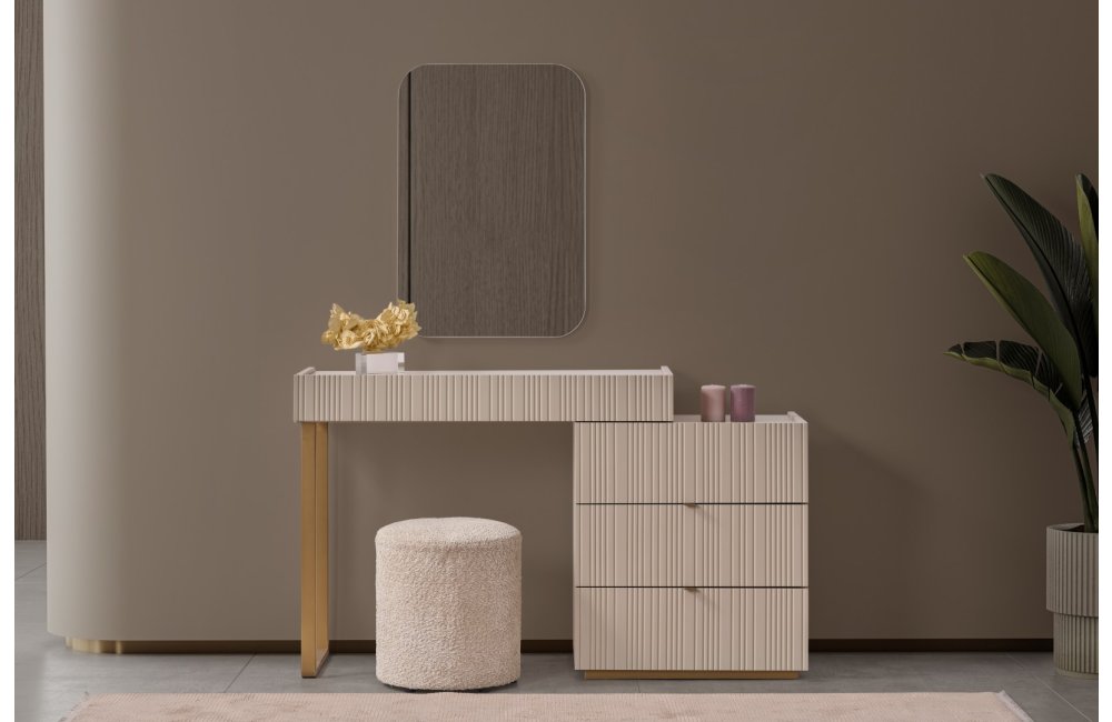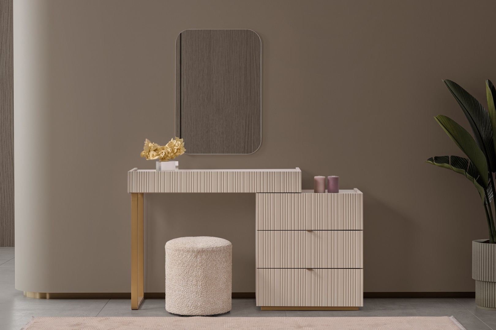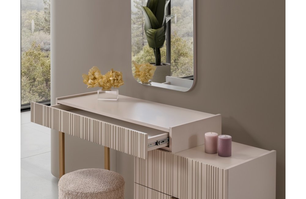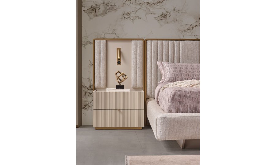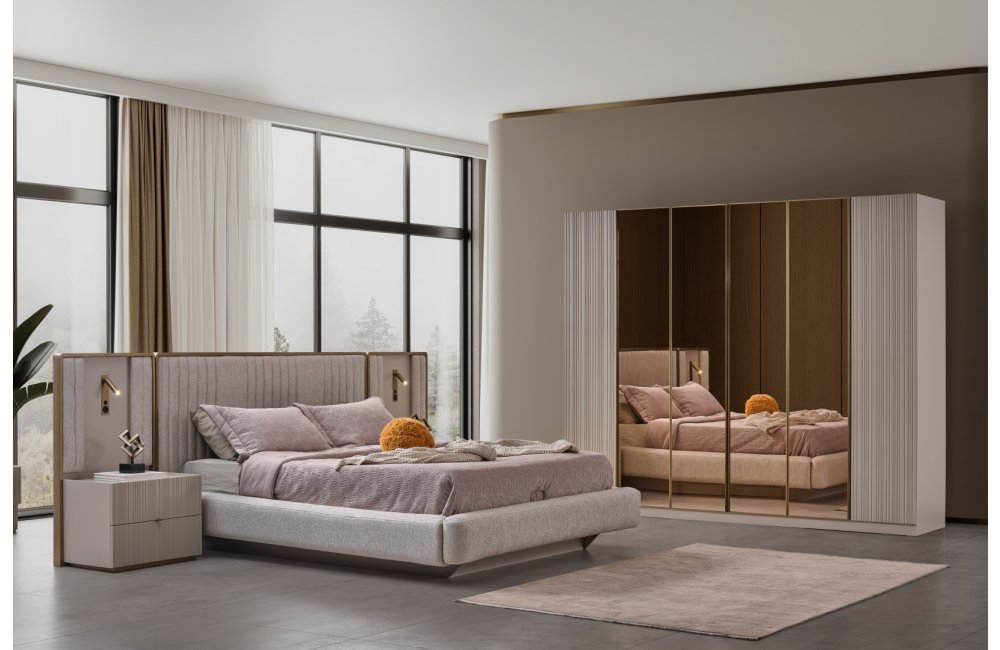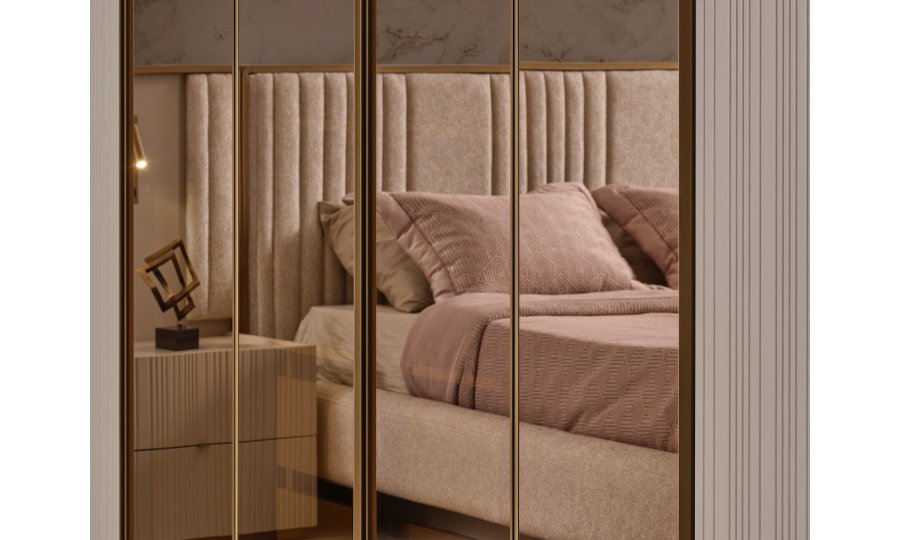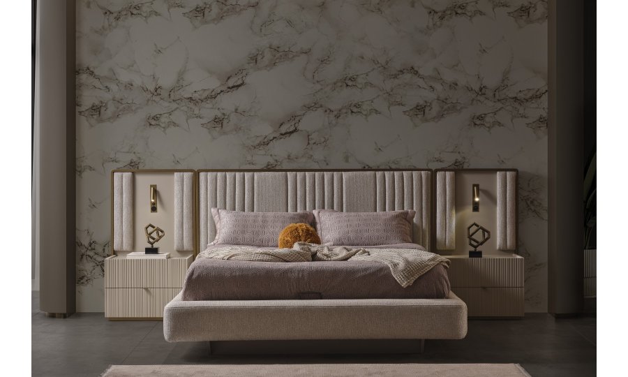 • Özel Tasarım Komodin ve Şifonyer: Şifonyer ve komodinlerde kullanılan lineer (çizgisel) yüzey dokusu, dokunsal bir lüks hissi yaratır. Şifonyerin kademeli yapısı ve geniş çekmeceleri, makyaj masası ihtiyacınızı en şık şekilde karşılar.