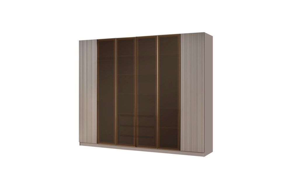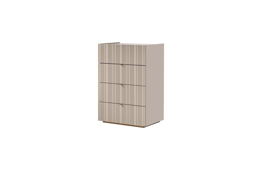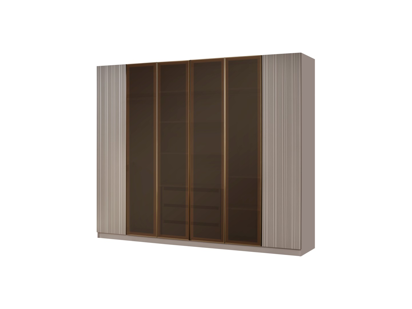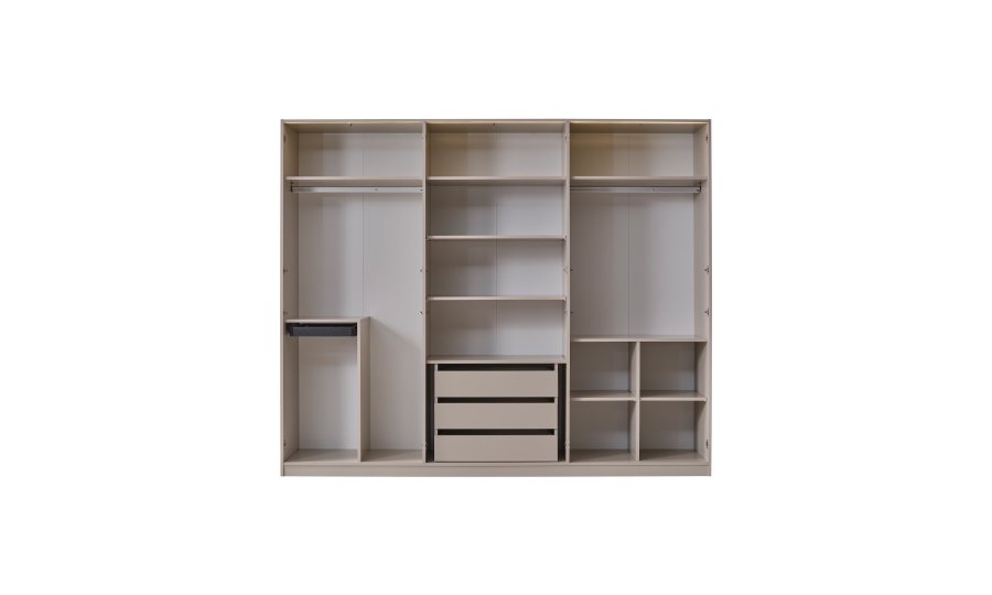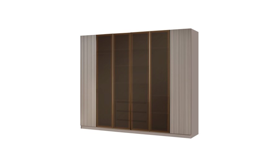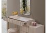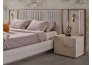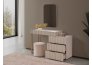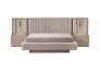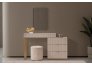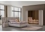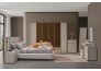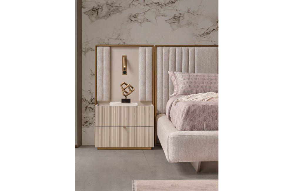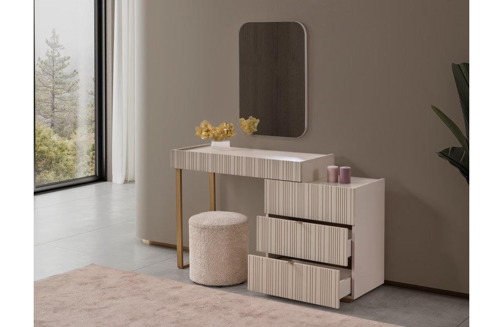• Özel Tasarım Komodin ve Şifonyer: Şifonyer ve komodinlerde kullanılan lineer (çizgisel) yüzey dokusu, dokunsal bir lüks hissi yaratır. Şifonyerin kademeli yapısı ve geniş çekmeceleri, makyaj masası ihtiyacınızı en şık şekilde karşılar.