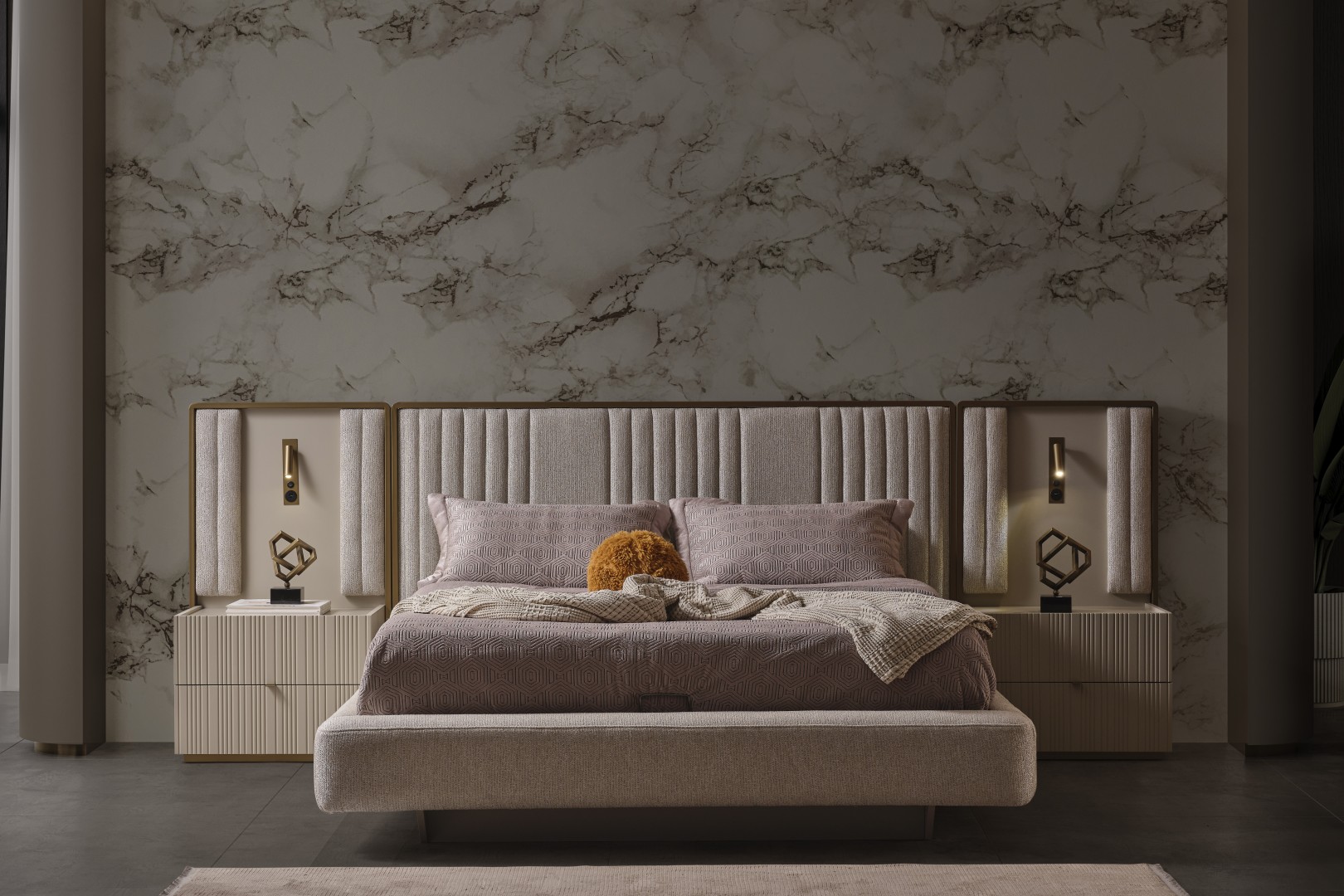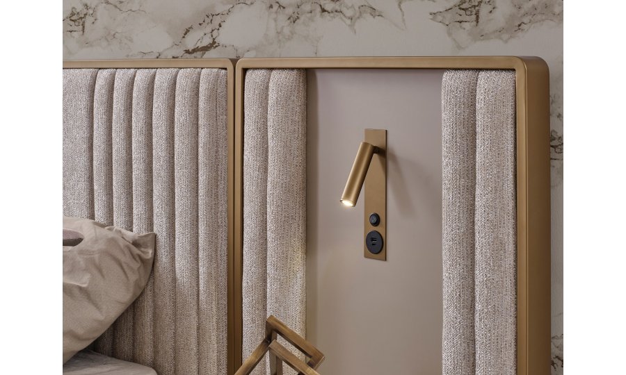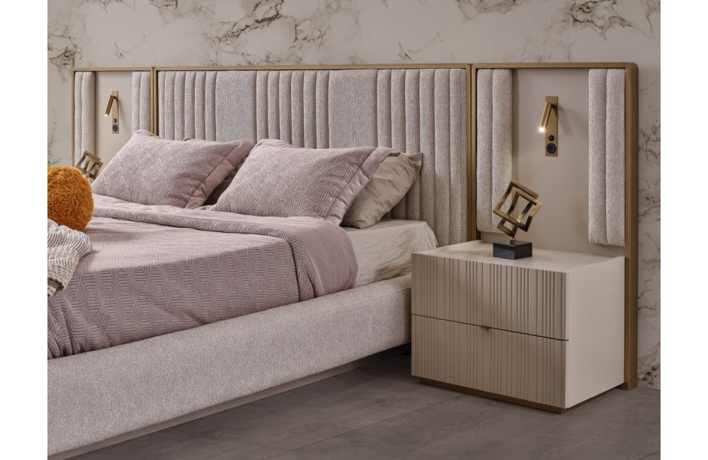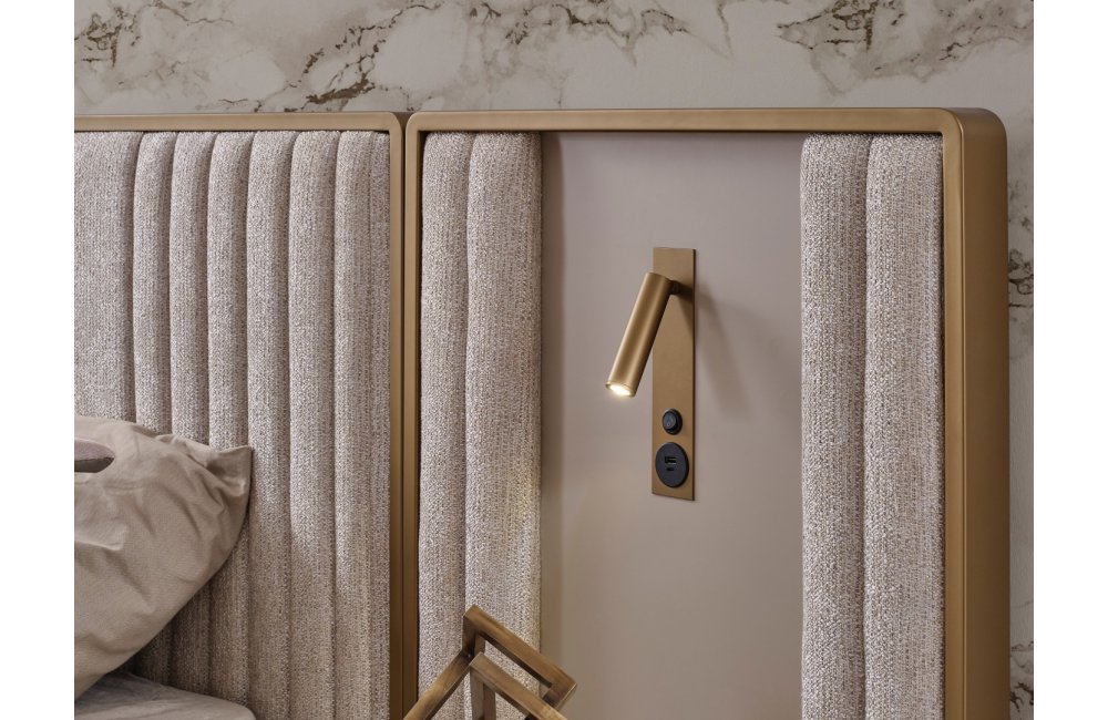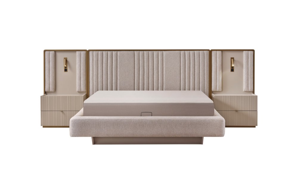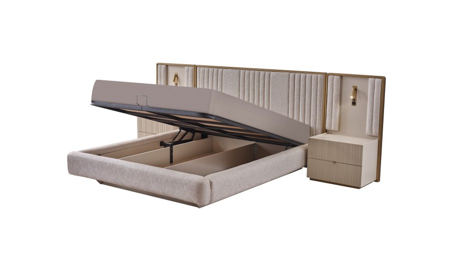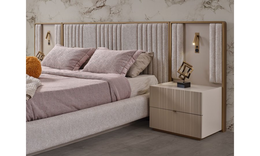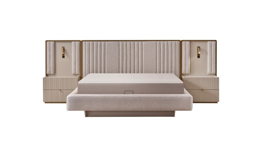 • Görkemli Başlık Tasarımı: İnce dikey kapitone işçiliğiyle hazırlanan kumaş başlık, yan panellerdeki bronz çerçevelerle zenginleştirilmiştir. Başlığa entegre edilen hareketli okuma lambaları ve USB şarj girişleri, teknolojiyi yatağınızın baş ucuna taşıyor.