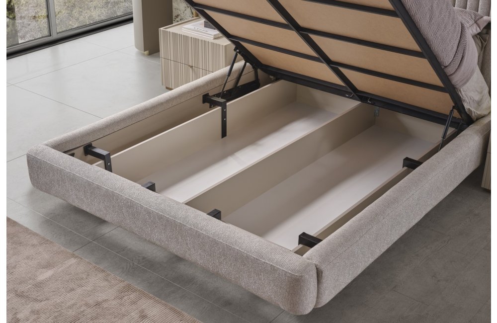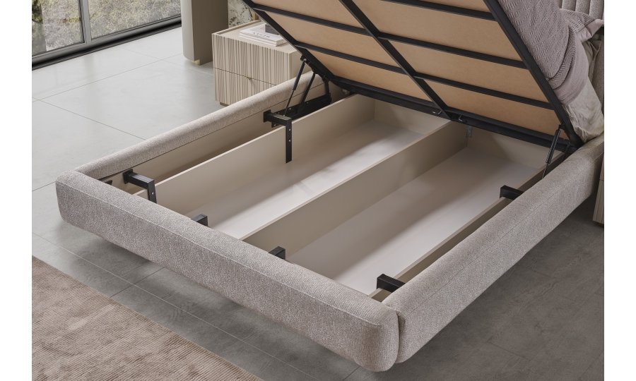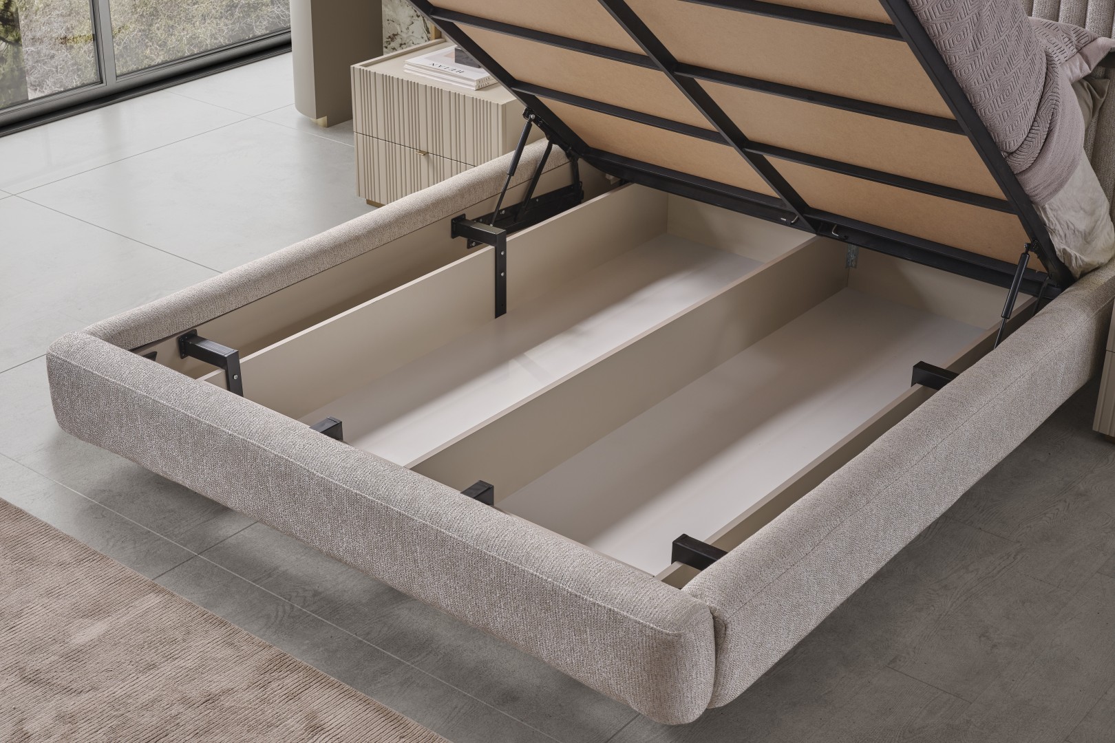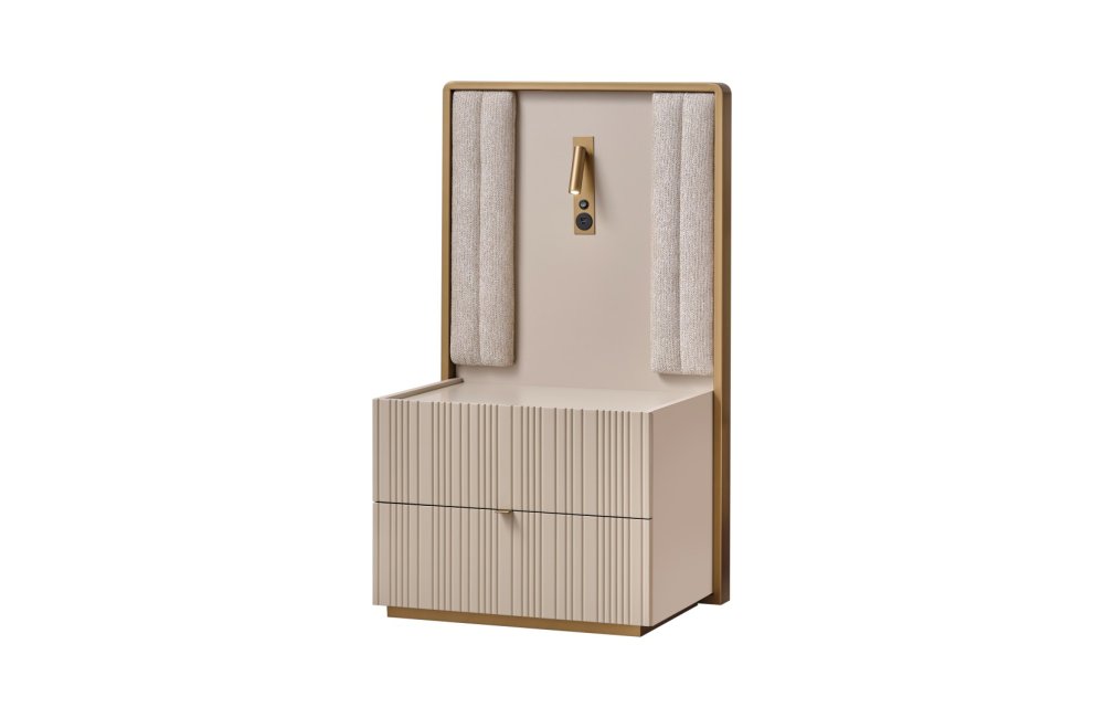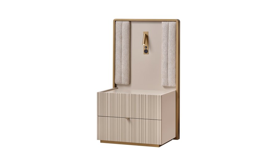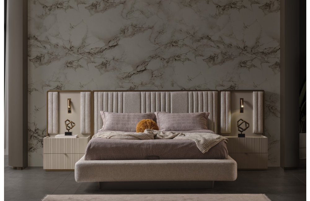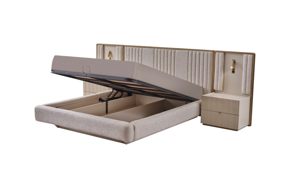 • Görkemli Başlık Tasarımı: İnce dikey kapitone işçiliğiyle hazırlanan kumaş başlık, yan panellerdeki bronz çerçevelerle zenginleştirilmiştir. Başlığa entegre edilen hareketli okuma lambaları ve USB şarj girişleri, teknolojiyi yatağınızın baş ucuna taşıyor.