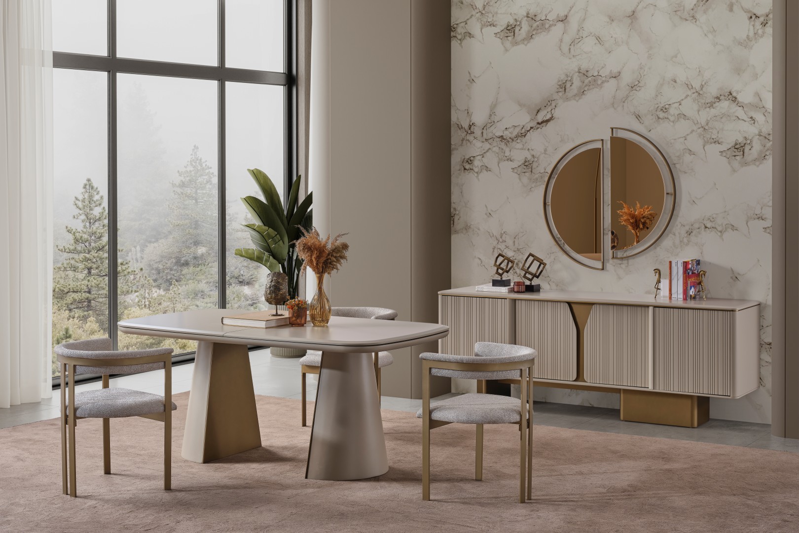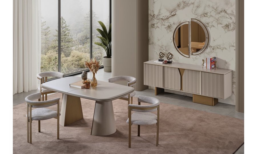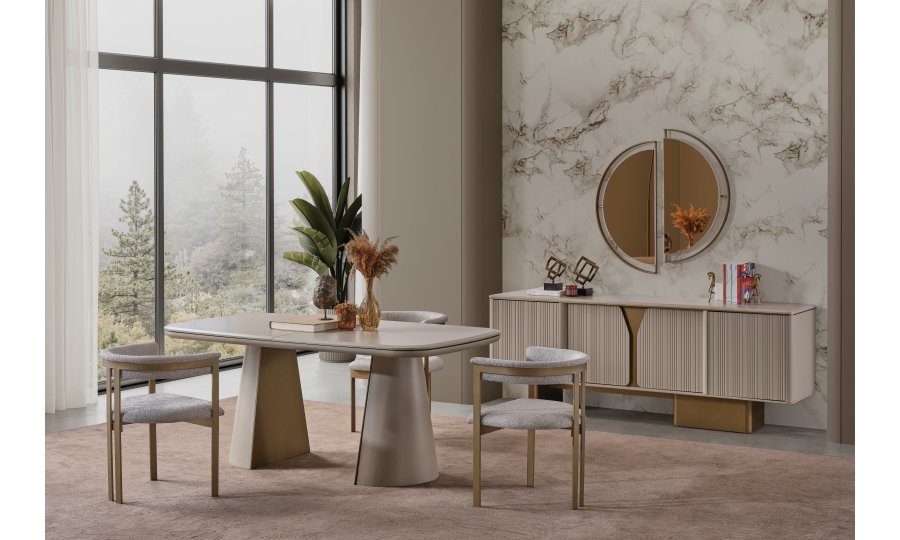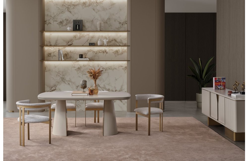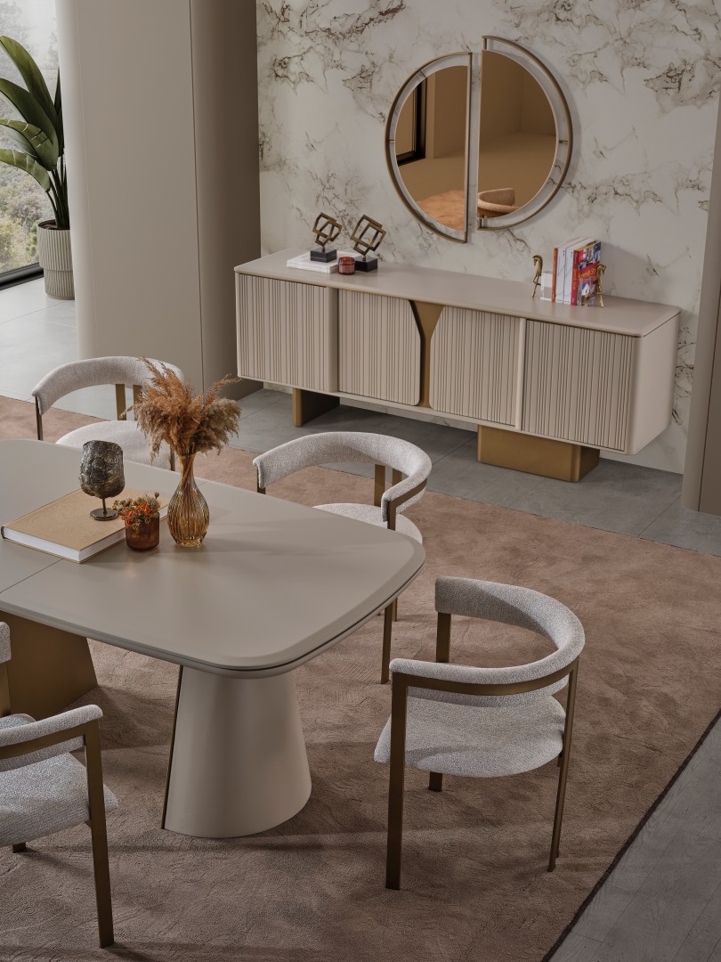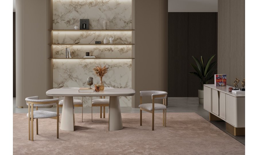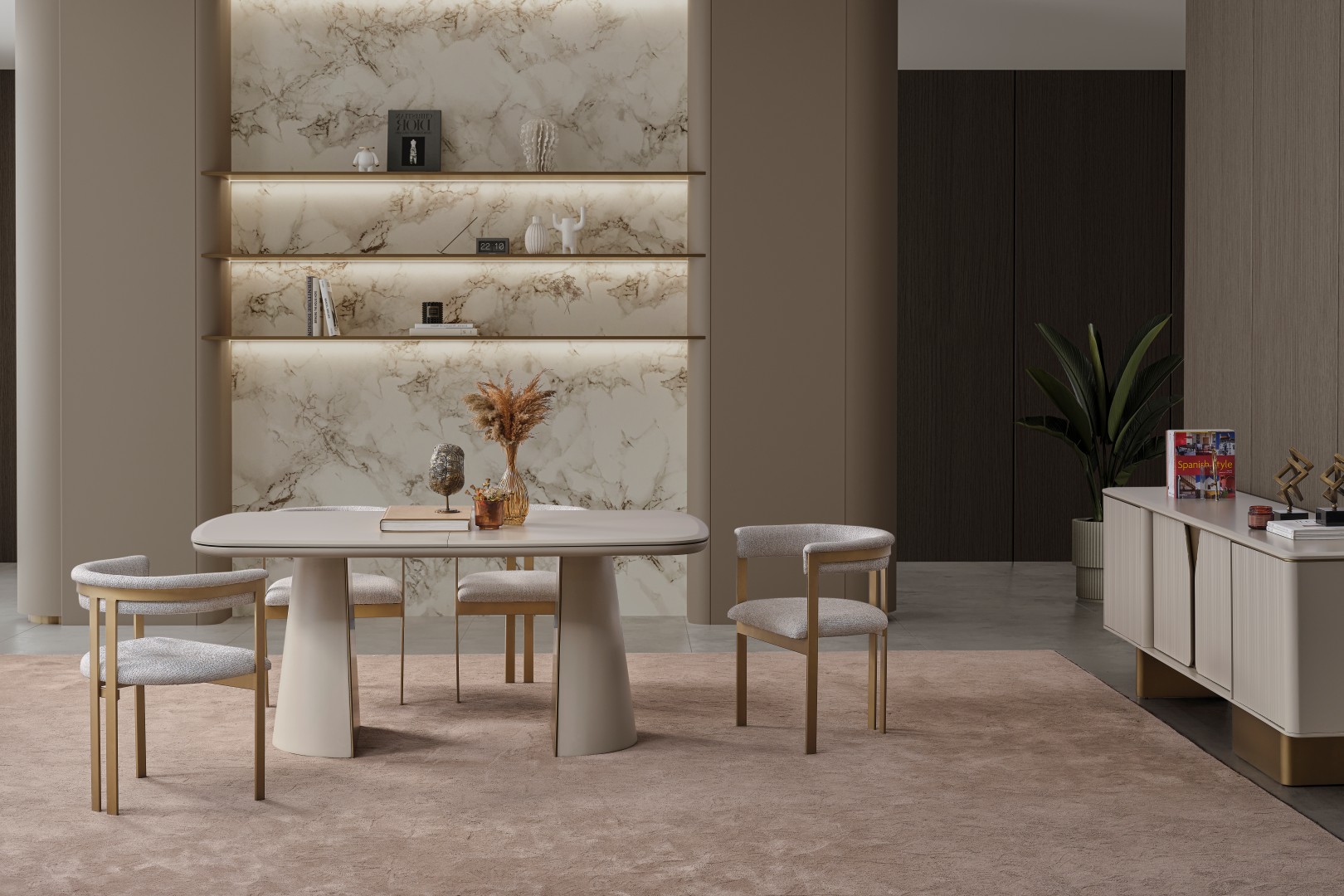 • Heykelsi Masa Formu: Oval hatlara sahip yemek masası, konik ayak yapısı ve bronz geçişli gövdesiyle mekanın odak noktası haline geliyor. Geniş yüzeyi, kalabalık davetler için şık ve ferah bir alan sunuyor.