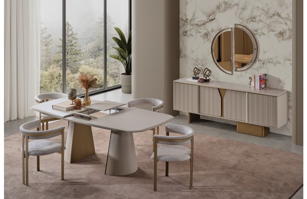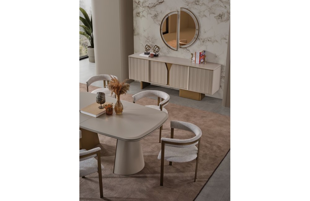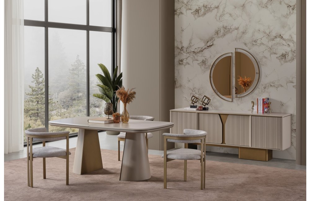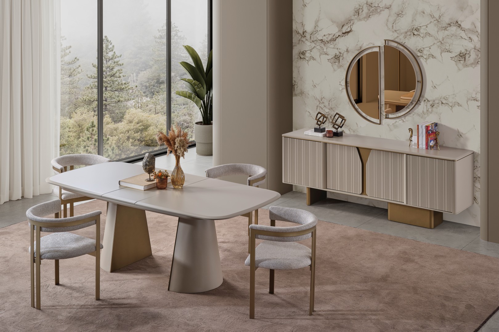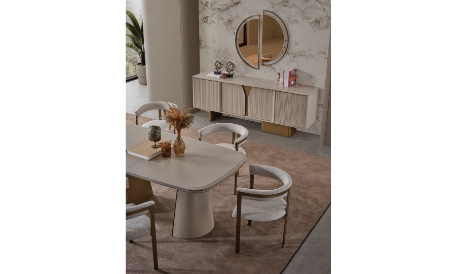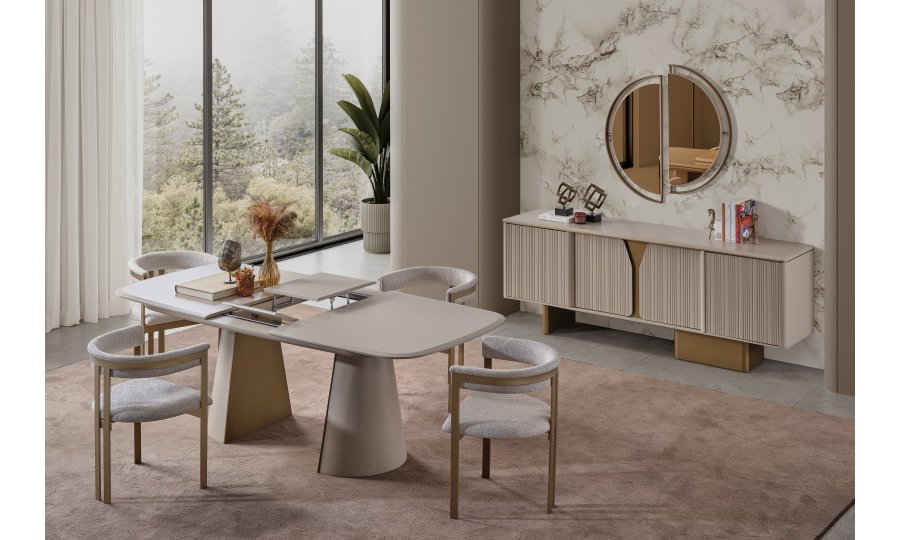 • Heykelsi Masa Formu: Oval hatlara sahip yemek masası, konik ayak yapısı ve bronz geçişli gövdesiyle mekanın odak noktası haline geliyor. Geniş yüzeyi, kalabalık davetler için şık ve ferah bir alan sunuyor.