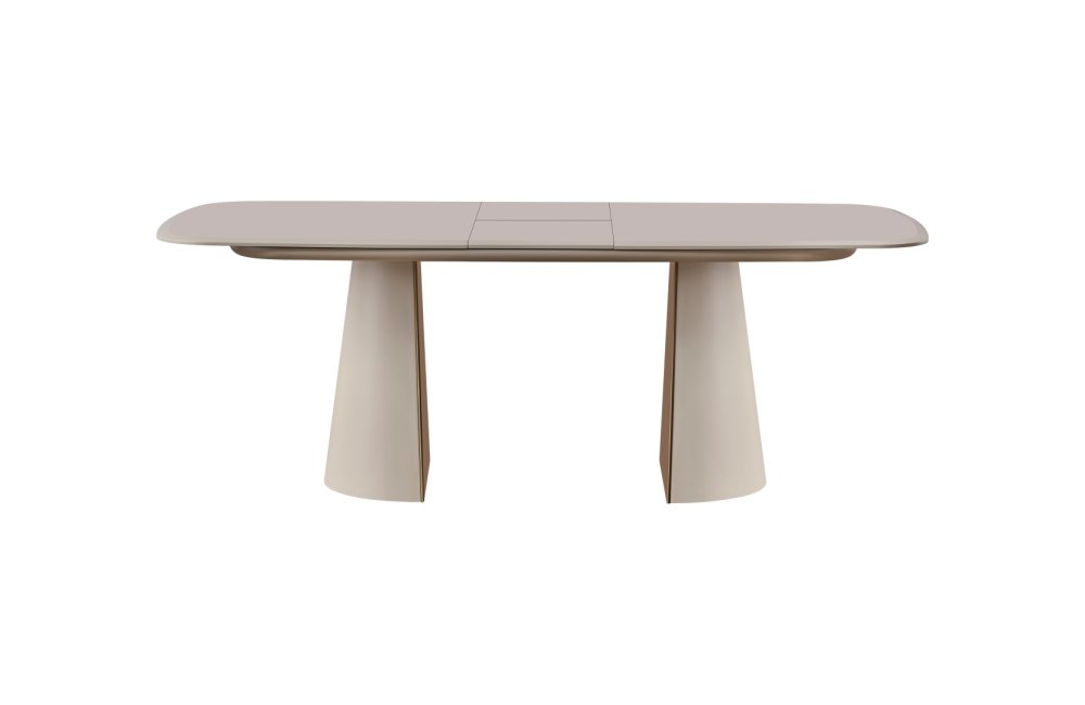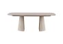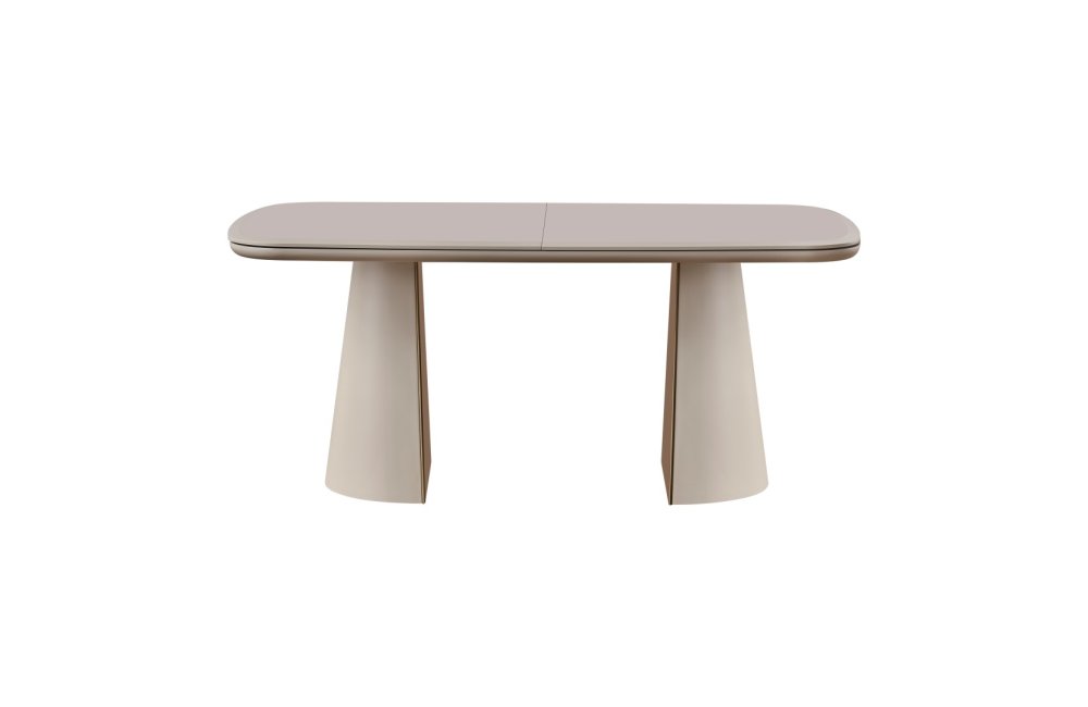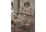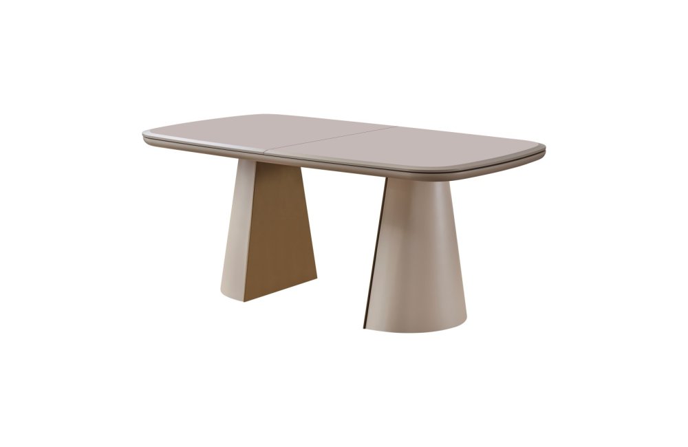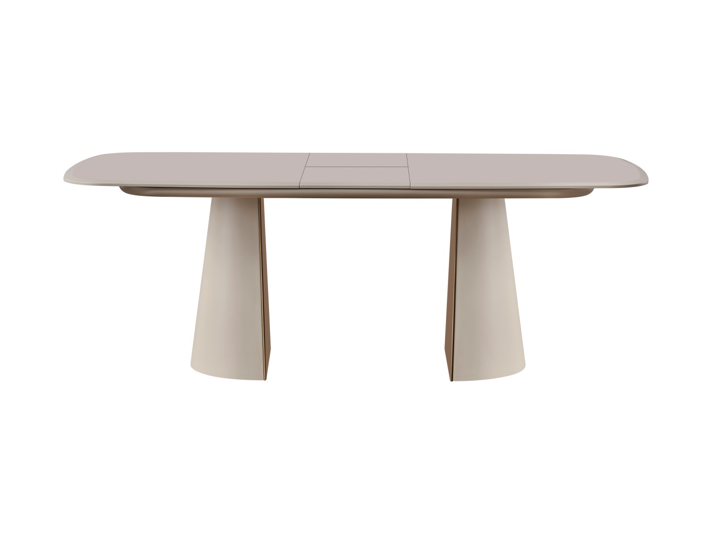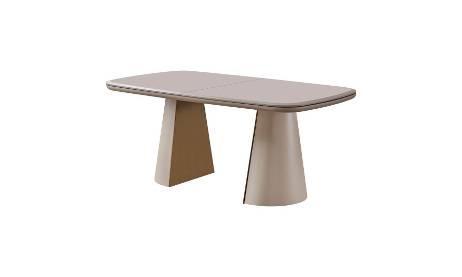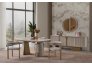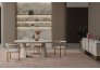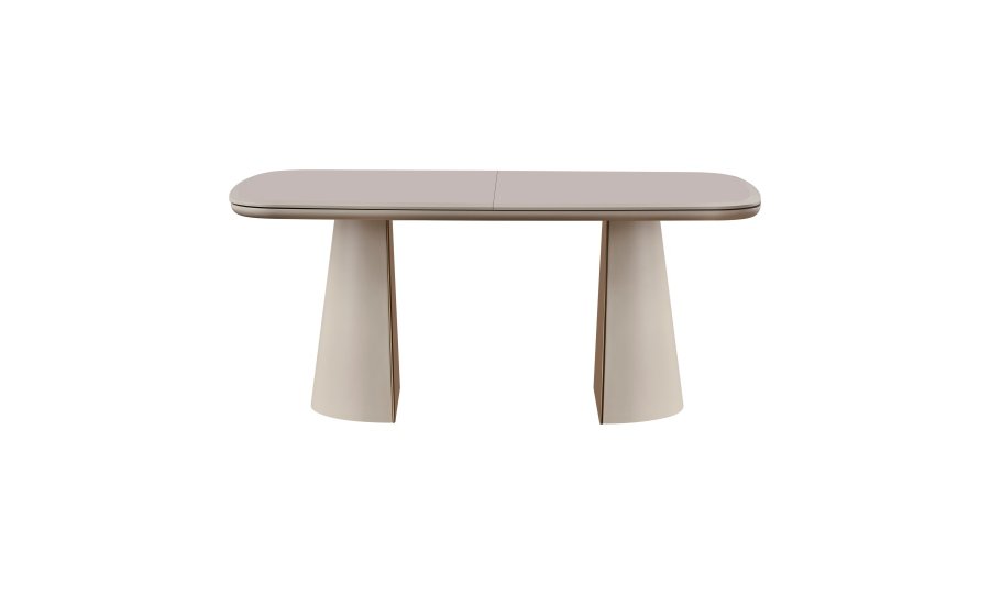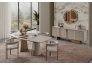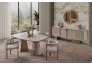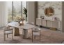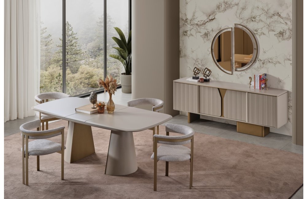• Heykelsi Masa Formu: Oval hatlara sahip yemek masası, konik ayak yapısı ve bronz geçişli gövdesiyle mekanın odak noktası haline geliyor. Geniş yüzeyi, kalabalık davetler için şık ve ferah bir alan sunuyor.