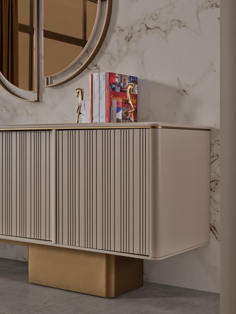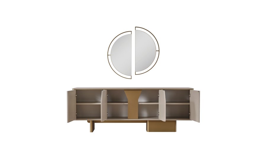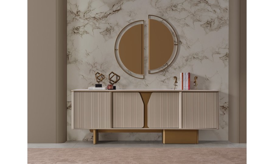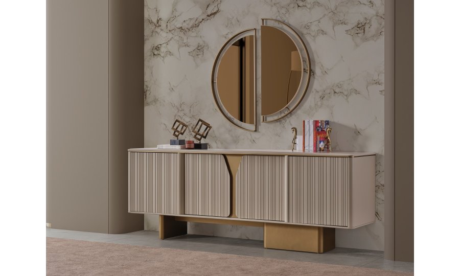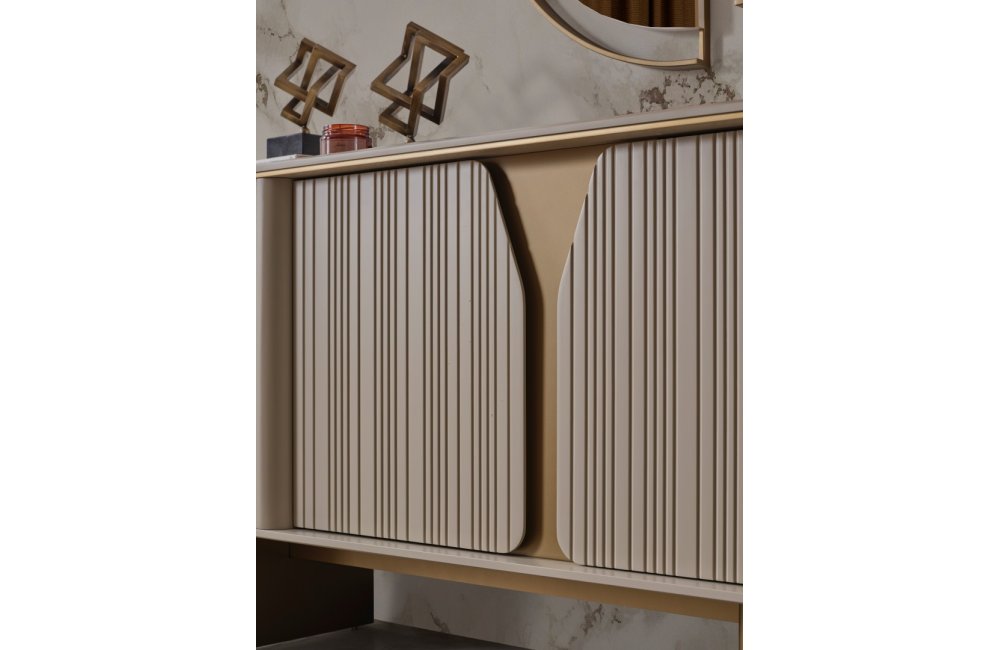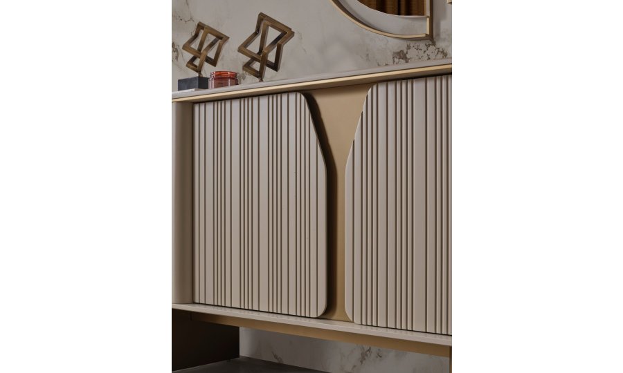 • İkonik Konsol ve Ayna Tasarımı: Konsol kapaklarındaki lineer (çizgisel) doku, dokunsal bir derinlik yaratırken orta kısımdaki bronz "Y" formu takıma modern bir imza atıyor. İki parçadan oluşan asimetrik ayna tasarımı, duvarda sanatsal bir dekoratif öğe olarak öne çıkıyor.