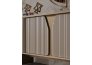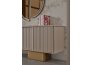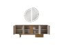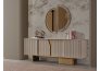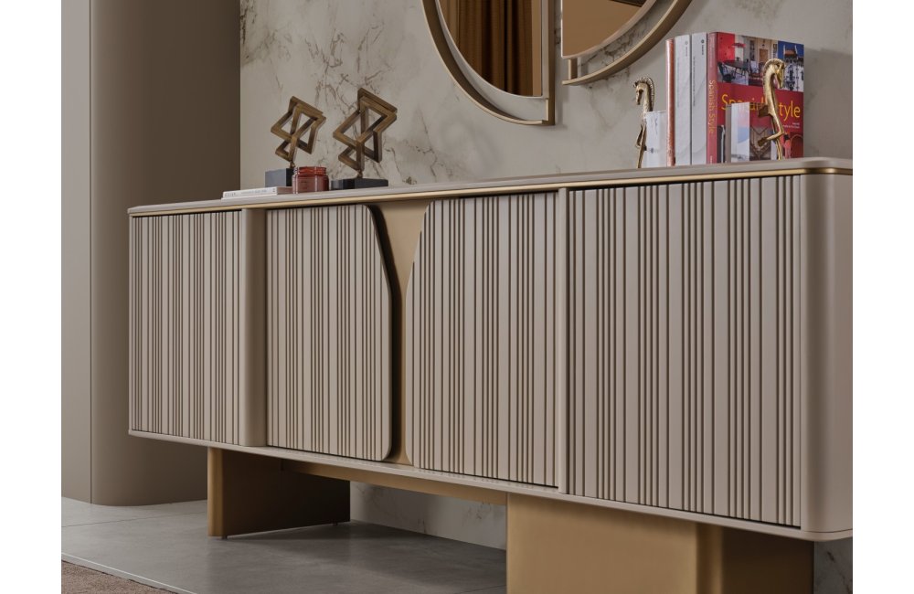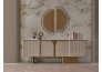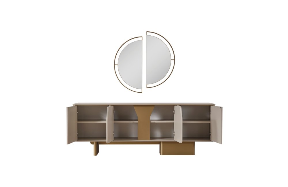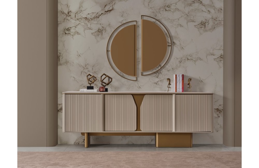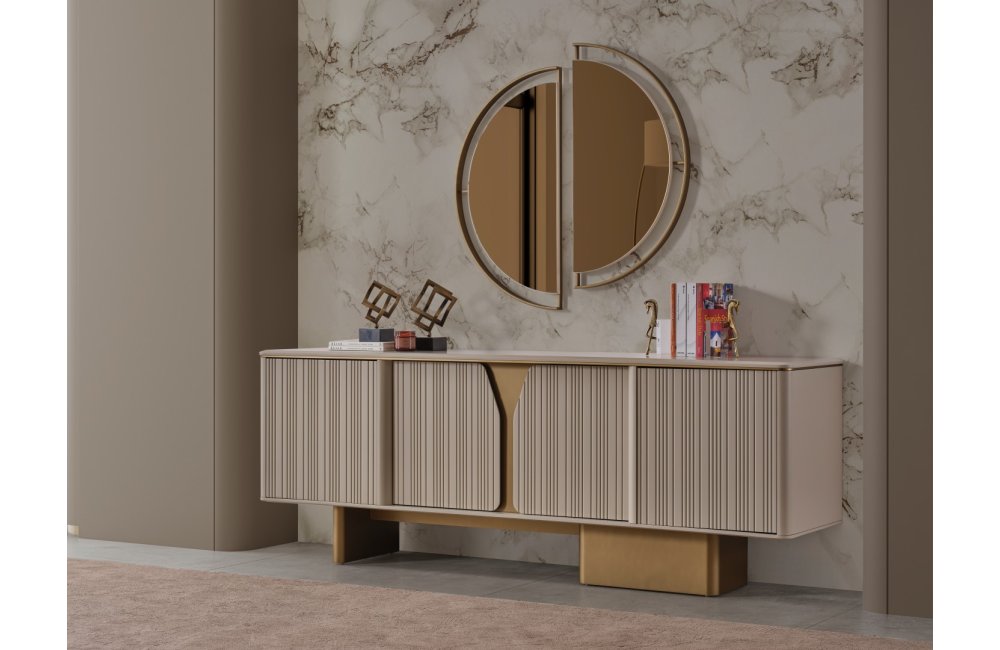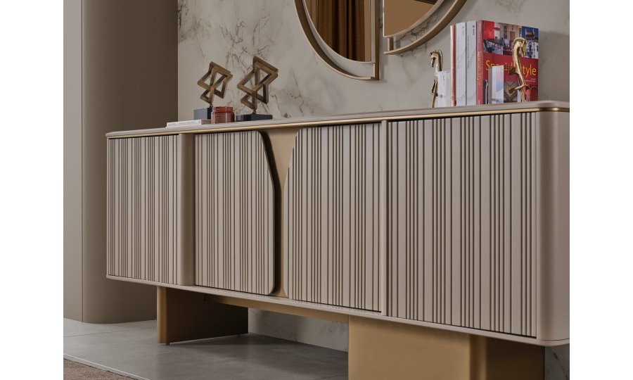 • İkonik Konsol ve Ayna Tasarımı: Konsol kapaklarındaki lineer (çizgisel) doku, dokunsal bir derinlik yaratırken orta kısımdaki bronz "Y" formu takıma modern bir imza atıyor. İki parçadan oluşan asimetrik ayna tasarımı, duvarda sanatsal bir dekoratif öğe olarak öne çıkıyor.
