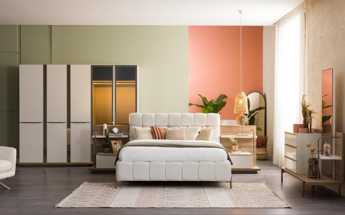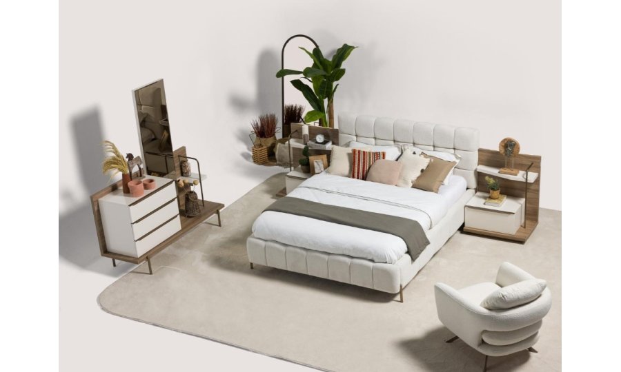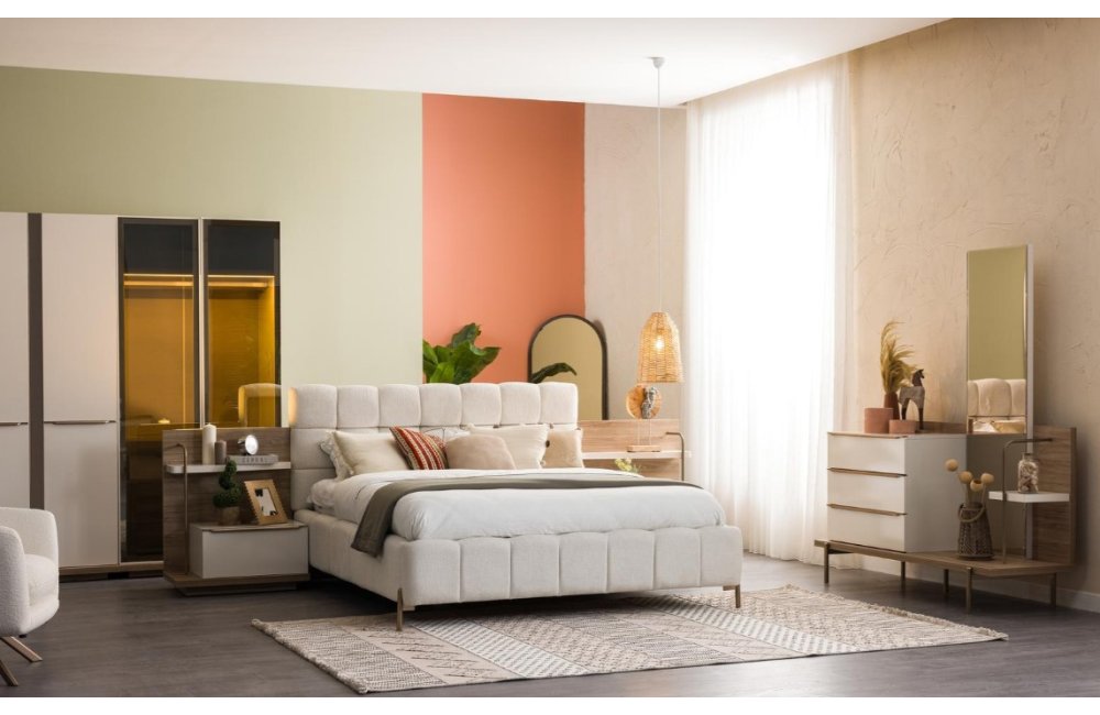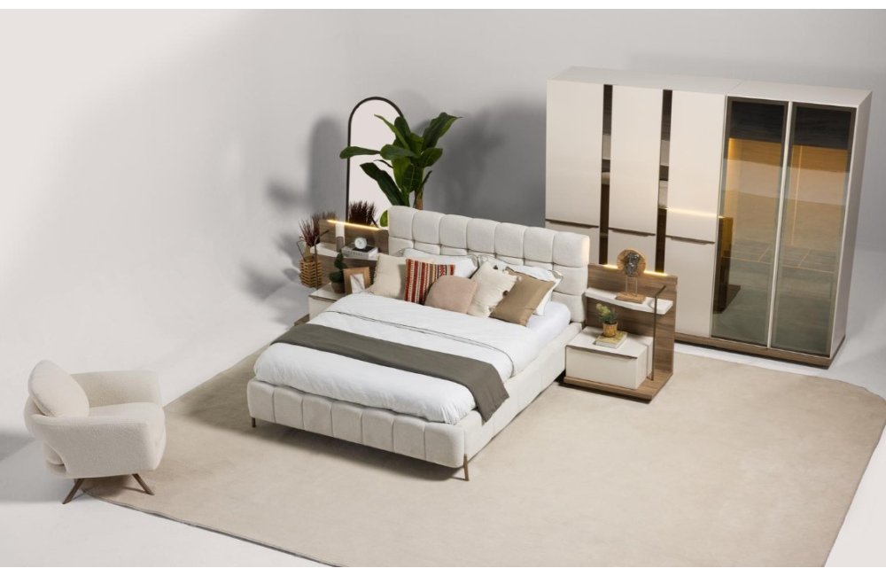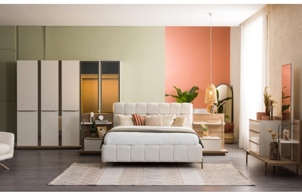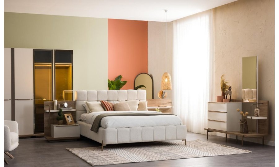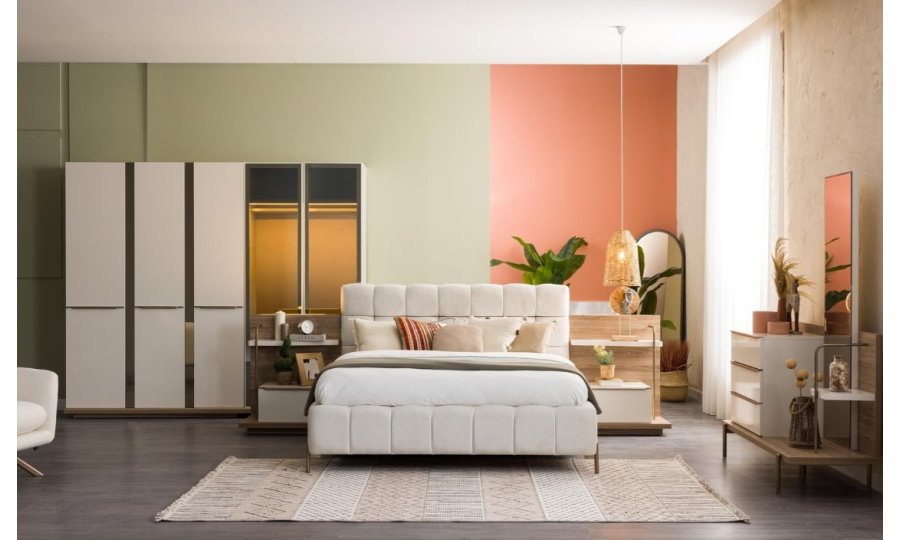 1ad. 3kp dolap, 1ad. 2kp Camlı dolap, 1ad. bazalı karyola, 1ad. şifonyer(aynalı) ve 2ad. komodinden oluşmaktadır.