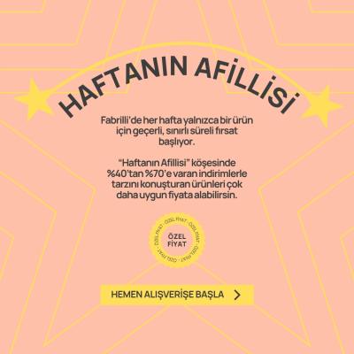 Her ay özenle seçilen bir üründe, sadece o aya özel büyük fırsat! Fabrilli’de her ayın yıldızı belli! Ay boyunca geçerli, sınırlı stoklu bu kampanyada öne çıkan ürünümüzde özel fiyatlar, ek avantajlar ve sürpriz fırsatlar seni bekliyor.