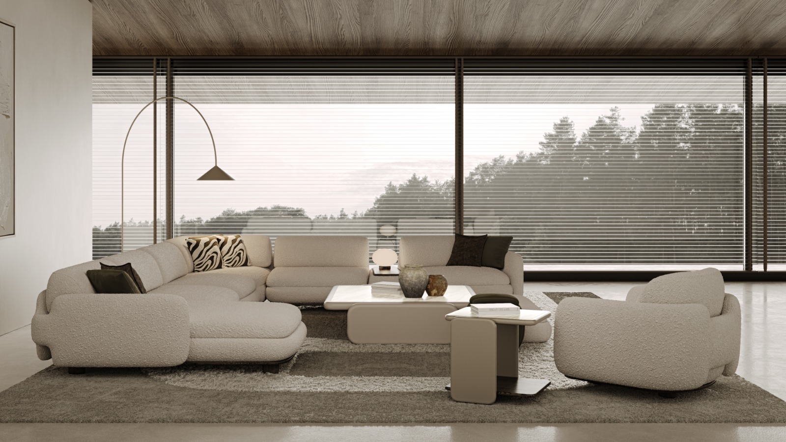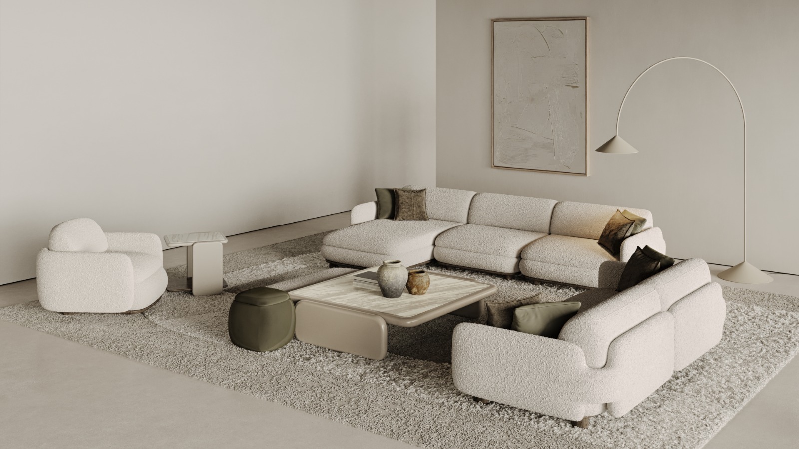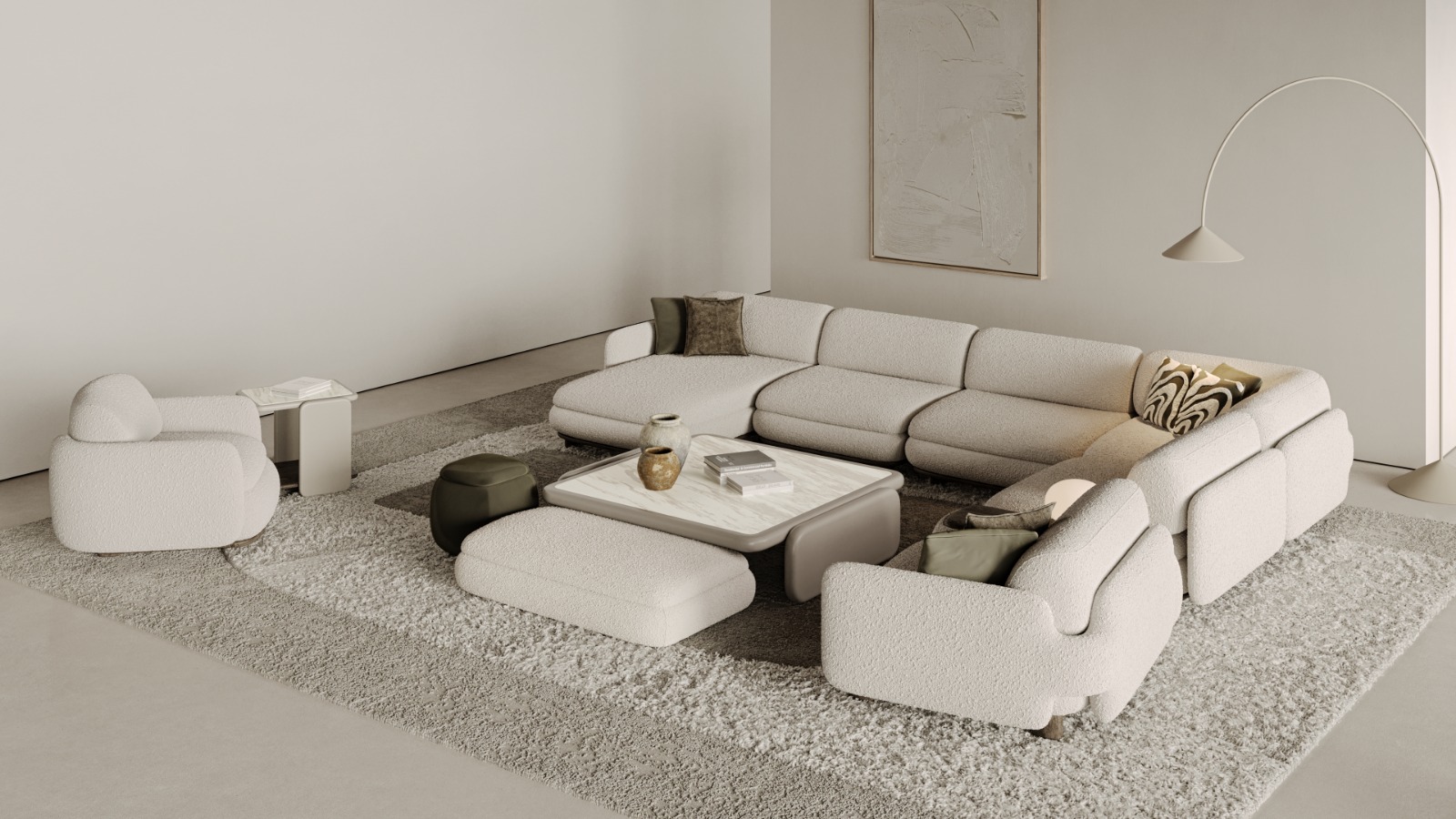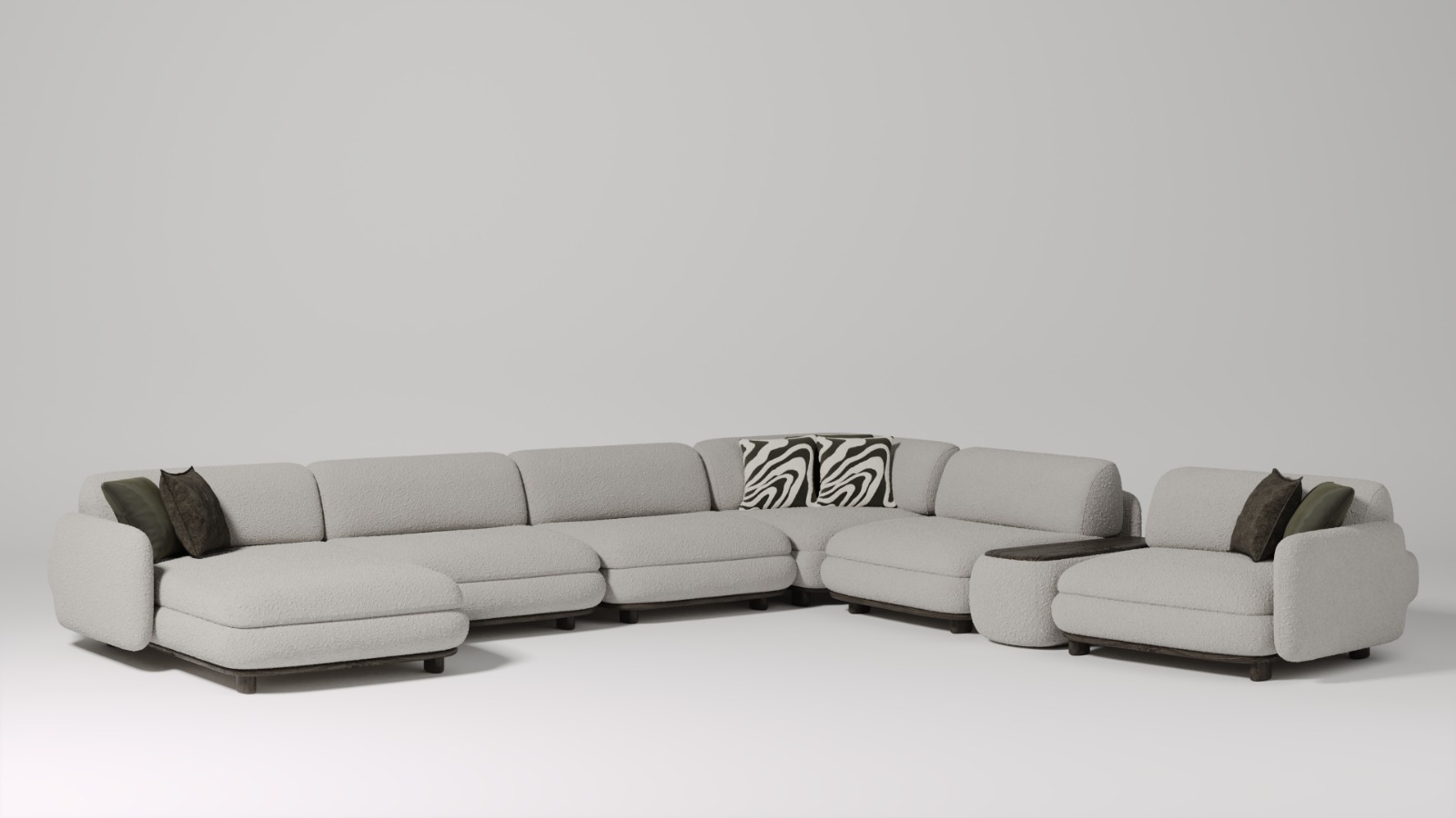 1 ad. relax modül, 2 ad. 95'lik kolsuz modül, 1 ad. 105'lik köşe modül ve 1 ad. 95'lik kolsuz modül, 1 ad. ara sehpa modül ve 1 ad. 130'luk kollu modülden oluşmaktadır.