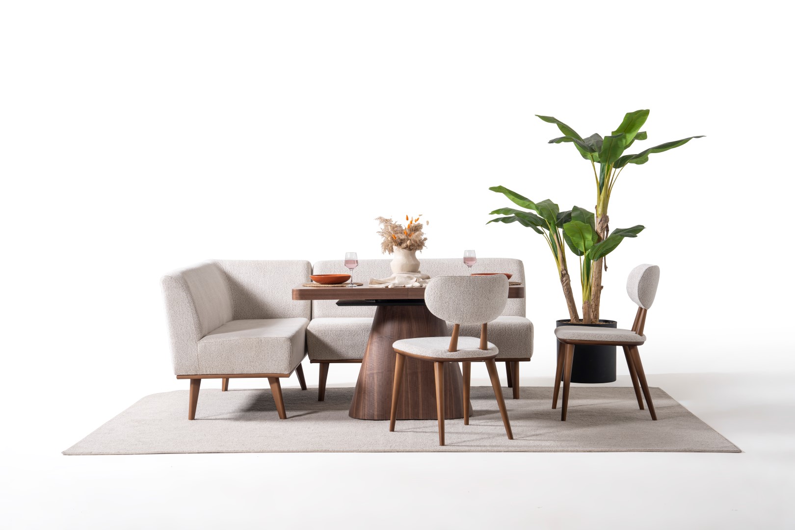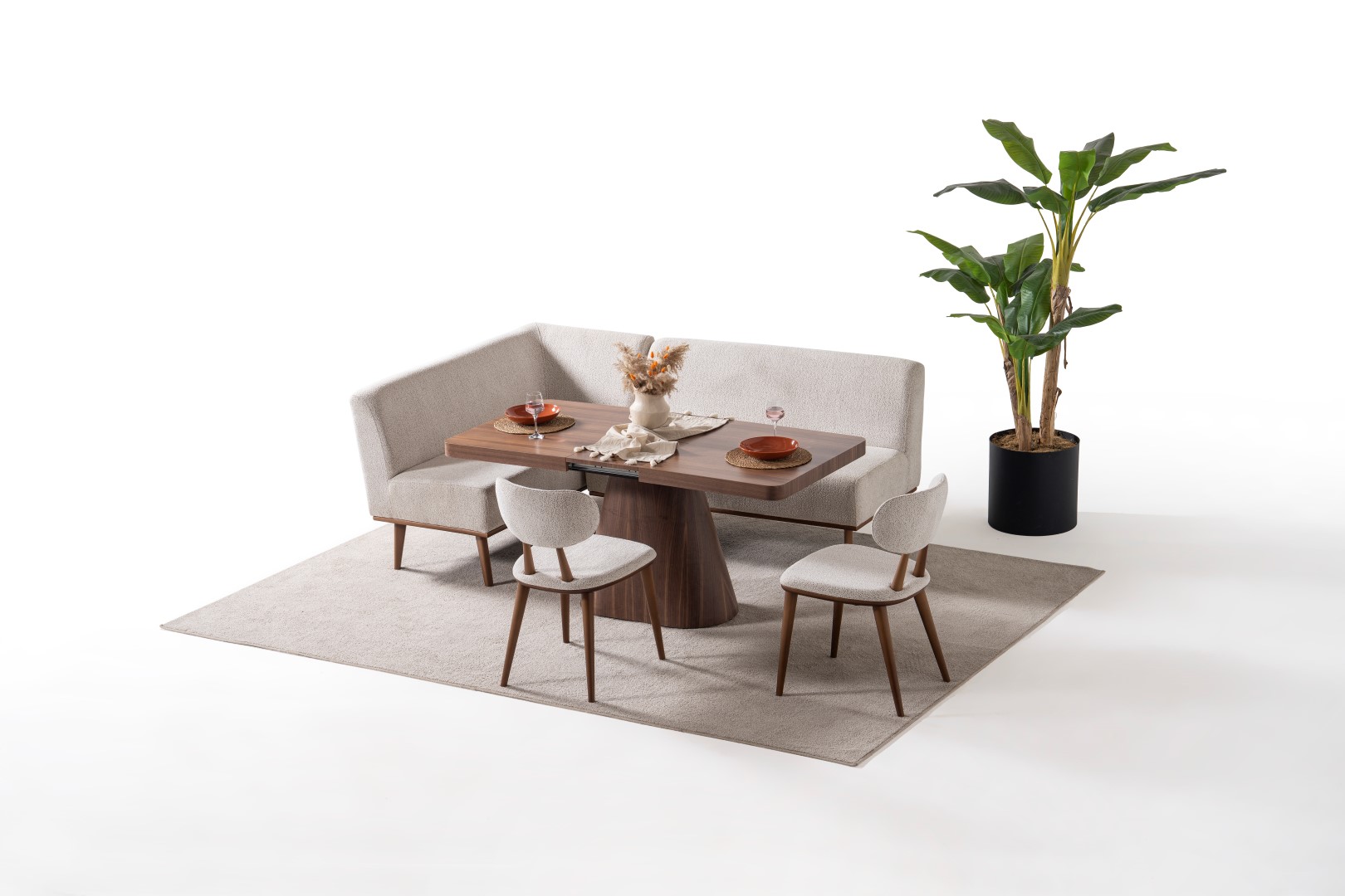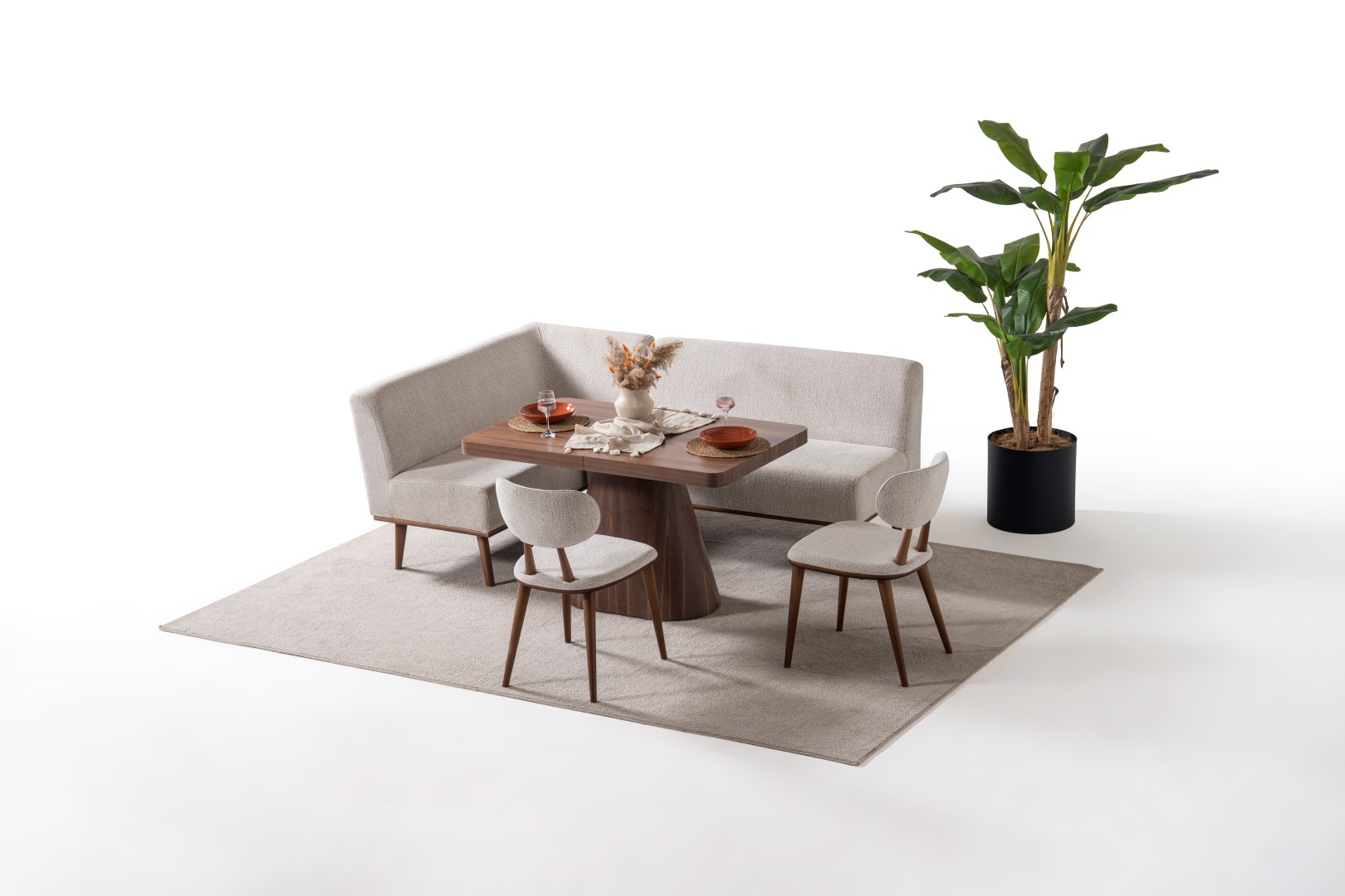 1ad. köşeli modül, 1ad. ikili modül, 1ad. masa ve 2ad. hera sandalyeden oluşmaktadır.