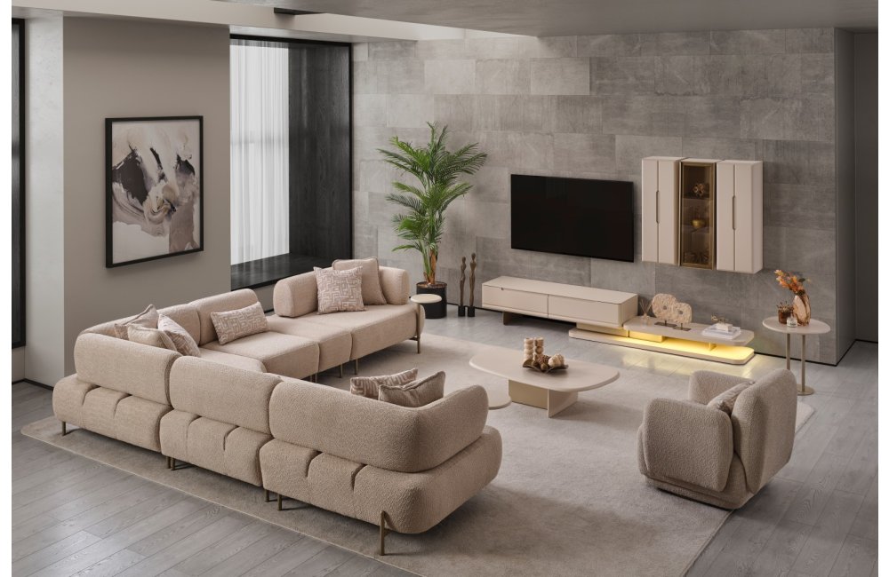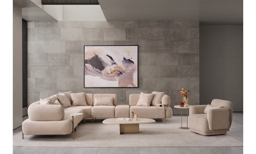 1ad. sağ kollu modül, 1ad. 90cm ara modül, 1ad. köşe modül, 1ad. 60cm ara modül, 1ad. 40cm sehpa ve 1ad. sol kollu modül ve berjerden oluşmaktadır.