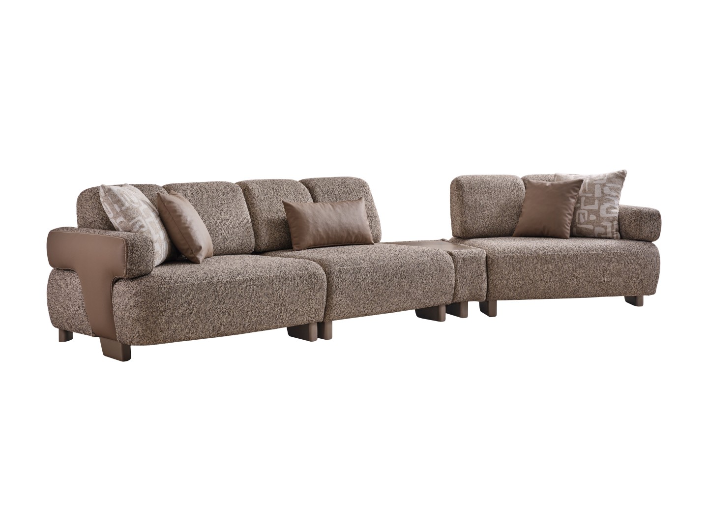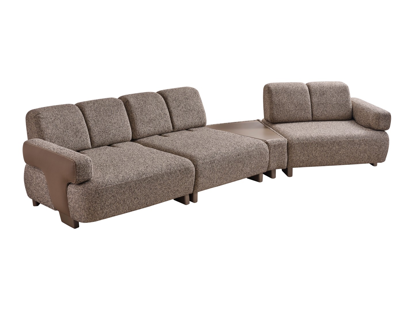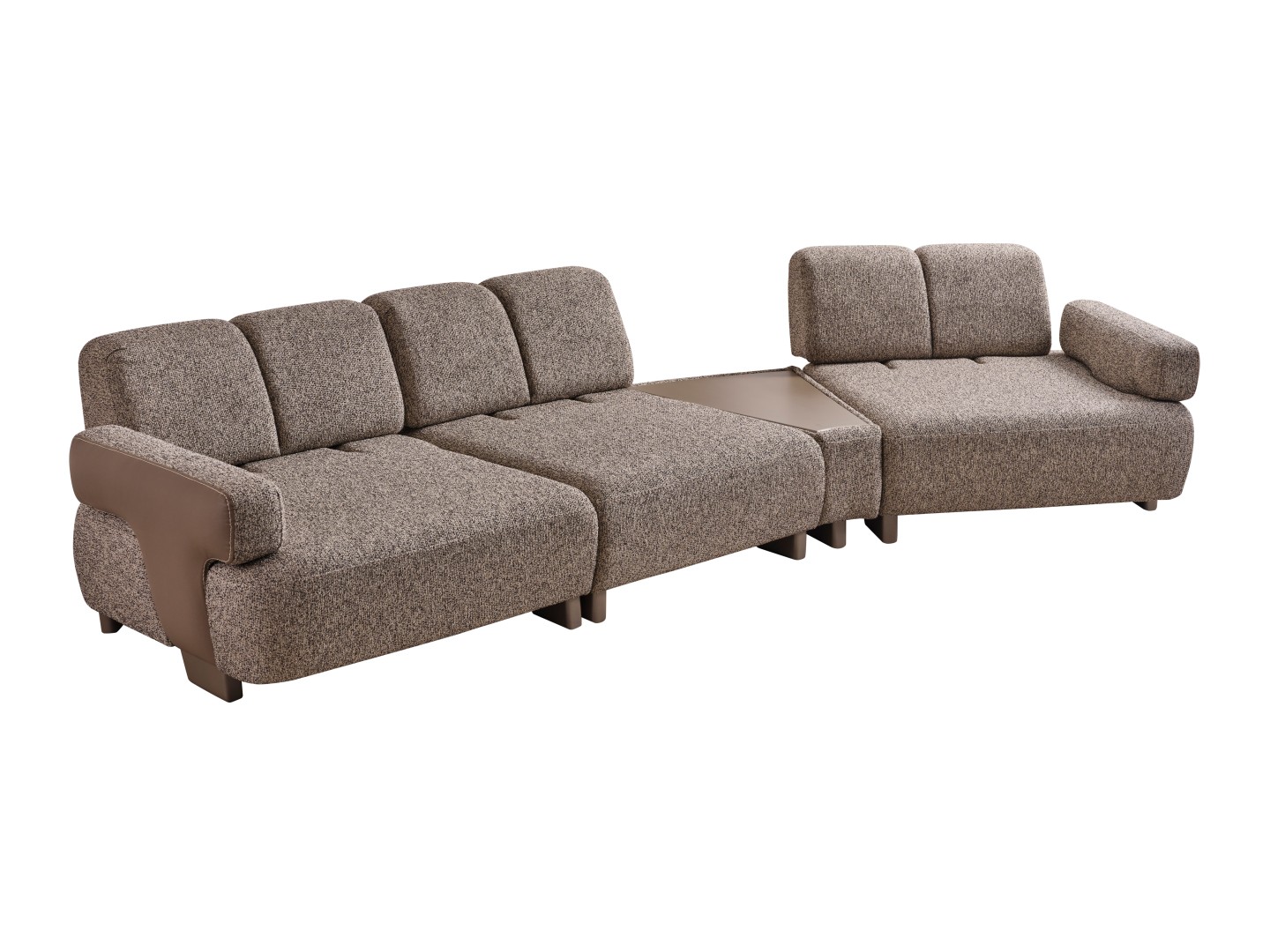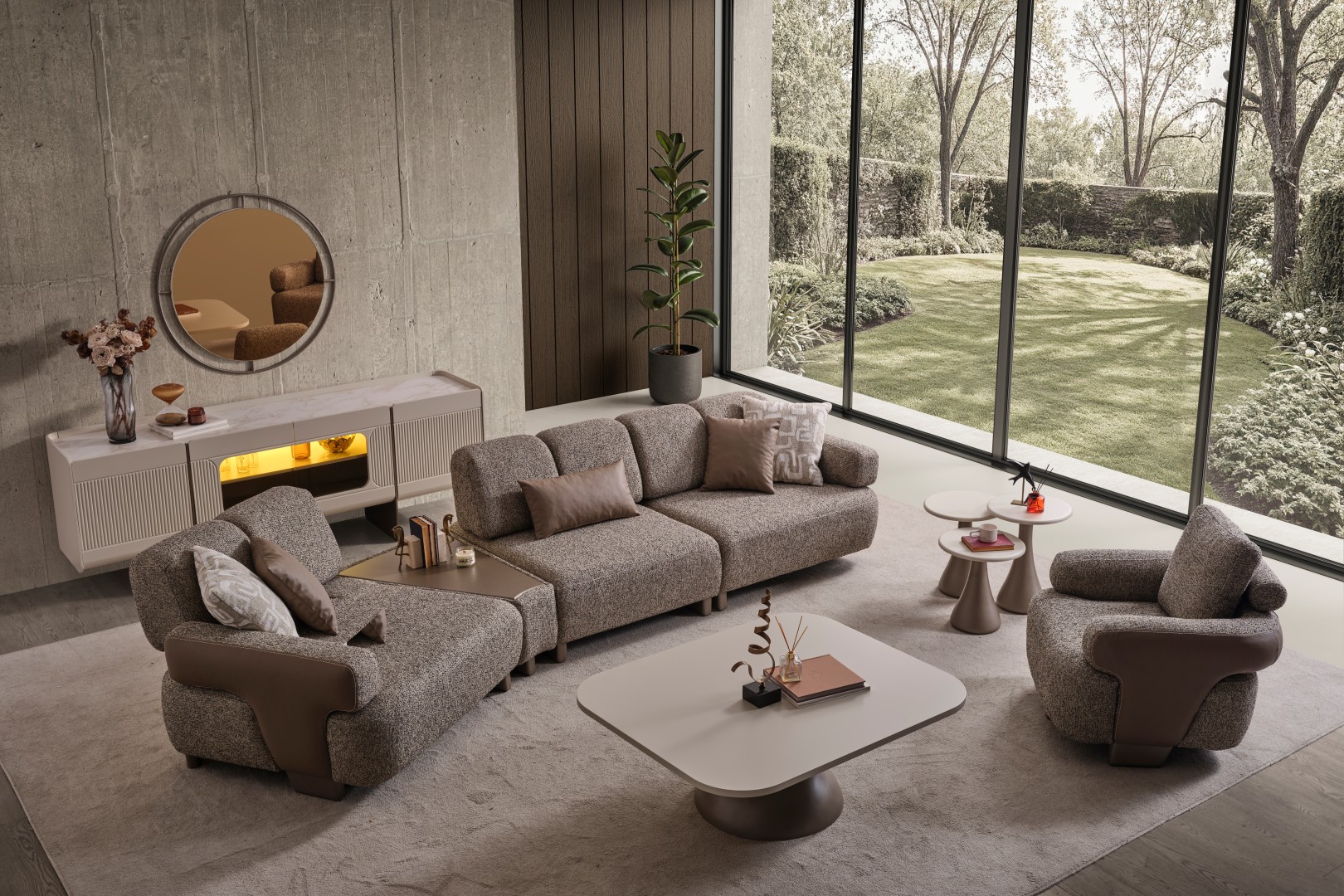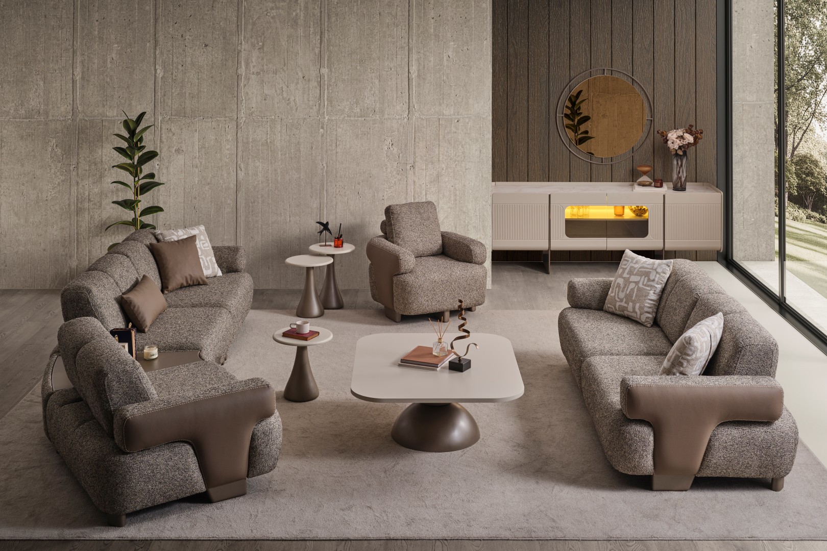 • Modüler ve Fonksiyonel Çözümler: Takım, geniş salonlar için ahşap sehpa modülüyle zenginleştirilmiş köşe formunda veya bağımsız üçlü koltuklar şeklinde kurgulanabilir. Entegre sehpa detayı, kahve keyfiniz veya dekoratif objeleriniz için şık bir alan sunar.