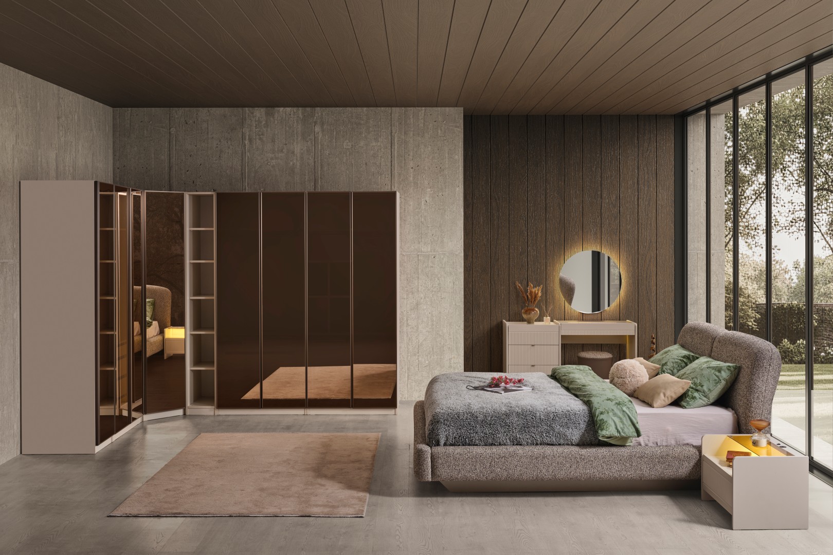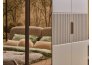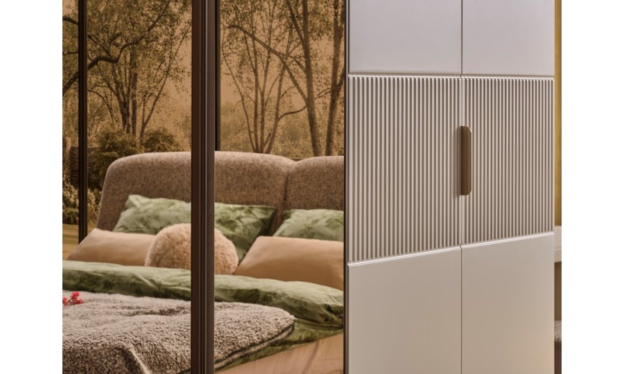 • Estetik Detaylar: Gardırop kapaklarında ve çekmece önlerinde kullanılan dikey hatlı (fluted) paneller, takıma ritmik bir derinlik kazandırır. Nötr vizon tonları, mermer desenli üst yüzeylerle birleşerek zamansız bir görünüme imza atar.