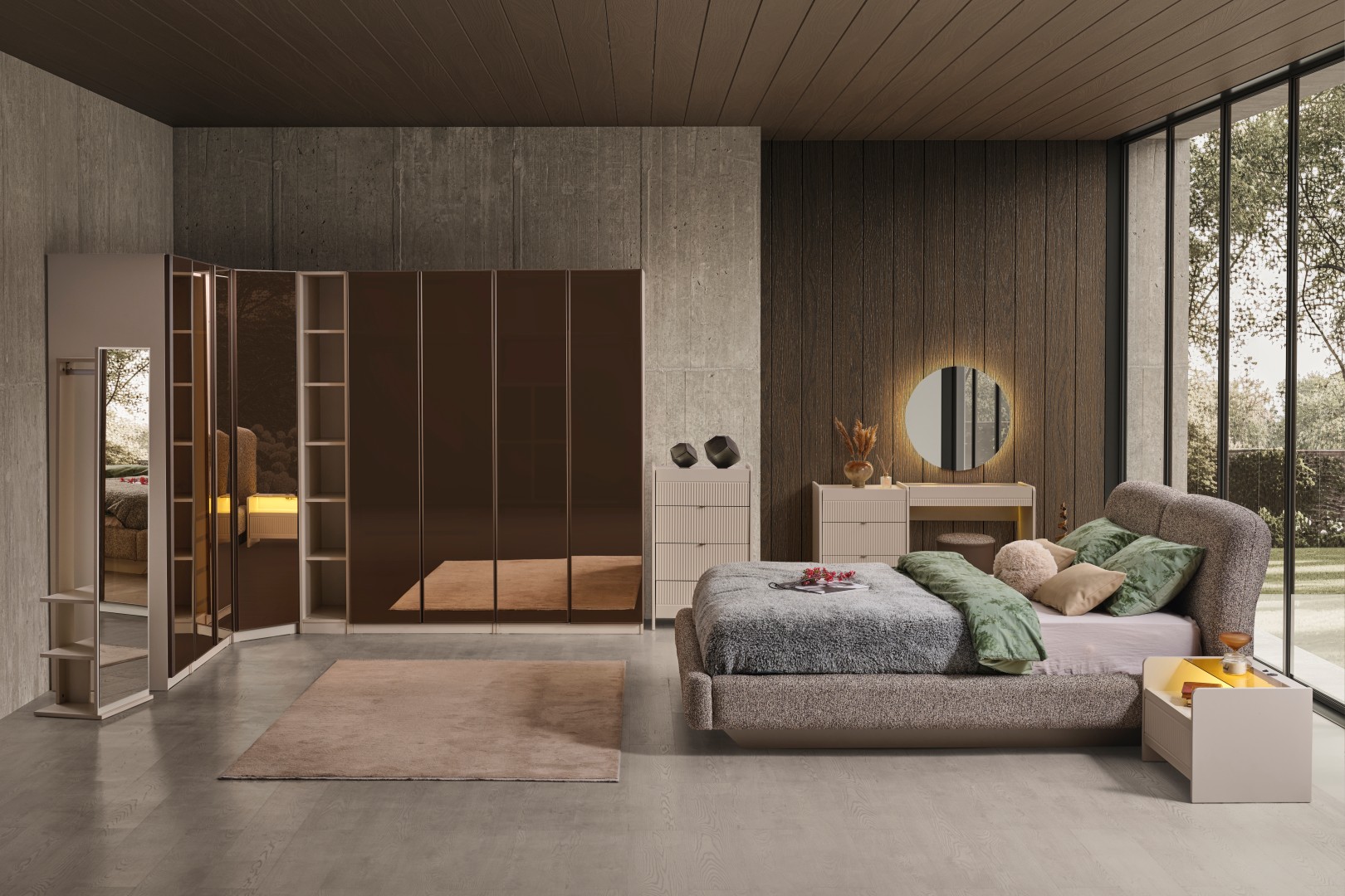 • Estetik Detaylar: Gardırop kapaklarında ve çekmece önlerinde kullanılan dikey hatlı (fluted) paneller, takıma ritmik bir derinlik kazandırır. Nötr vizon tonları, mermer desenli üst yüzeylerle birleşerek zamansız bir görünüme imza atar.